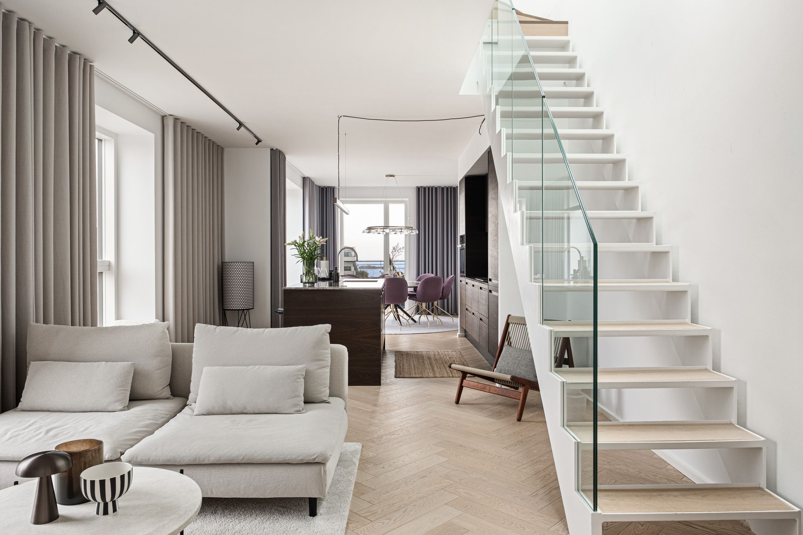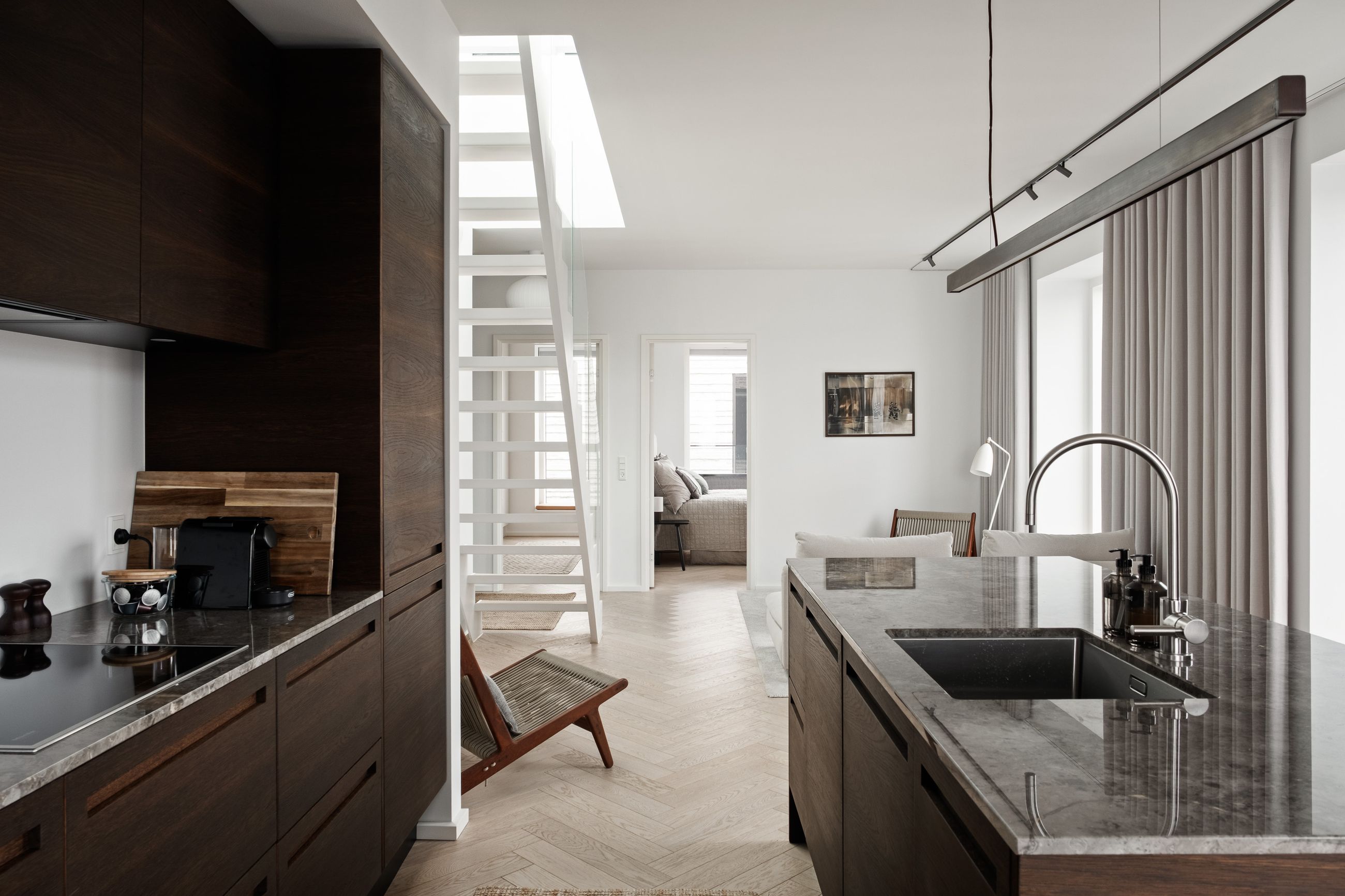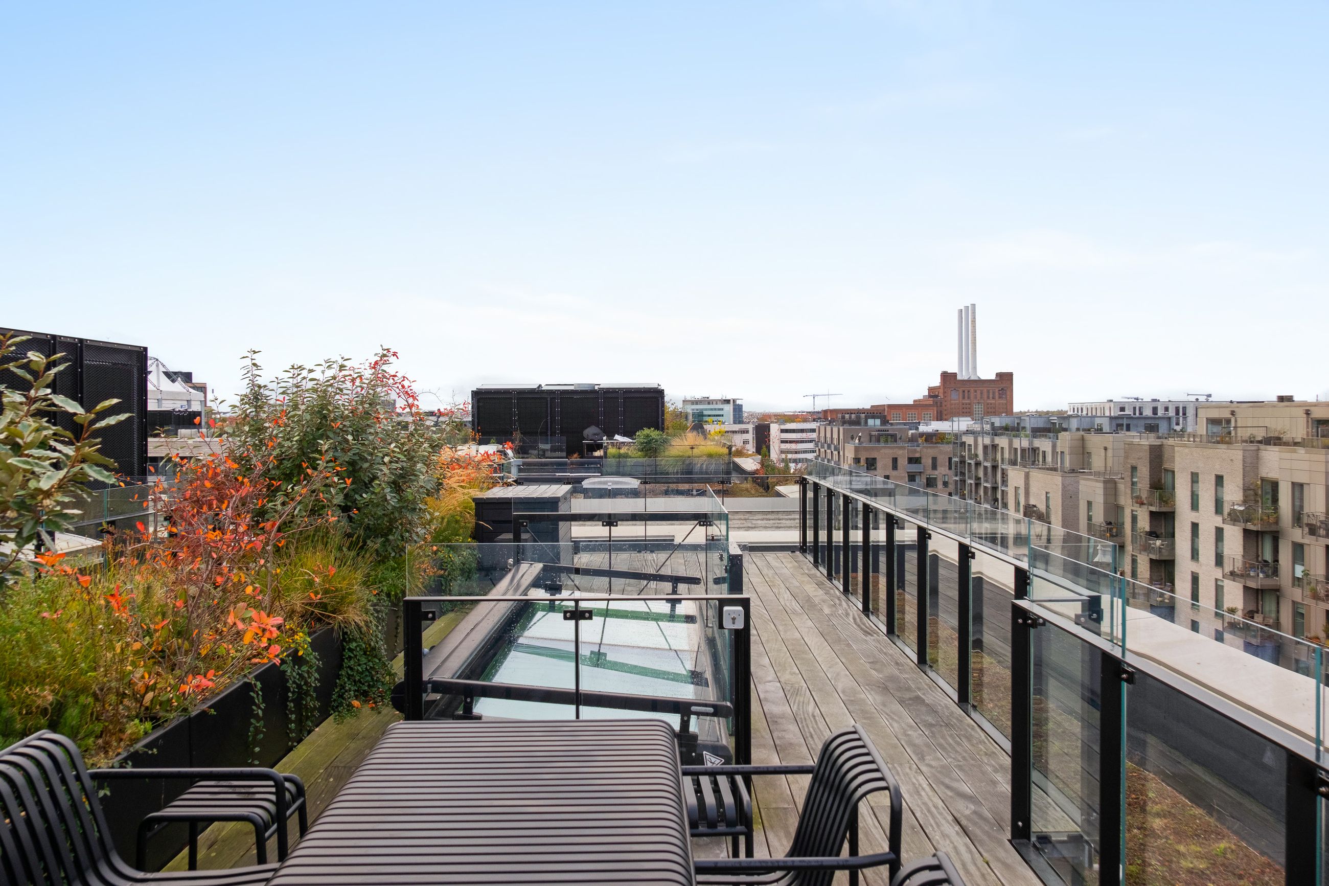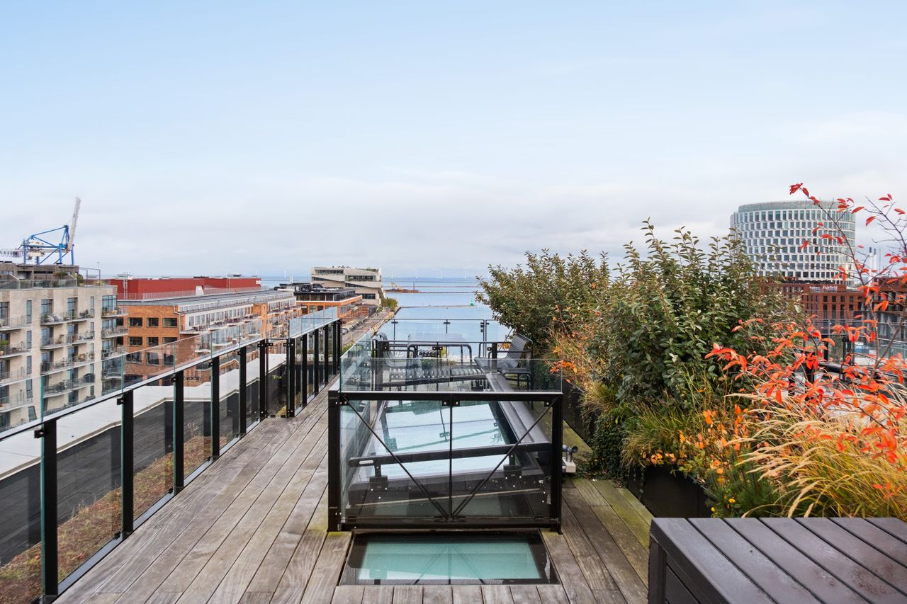 En elegant trappe fører op til den private tagterrasse – en oase i højden med plads til sol, middage og udsigt så langt øjet rækker. Indretningen er stilren med lyse farver, sildebenparket og et eksklusivt Kustomhouse-køkken i mørk eg med marmorbordplade.