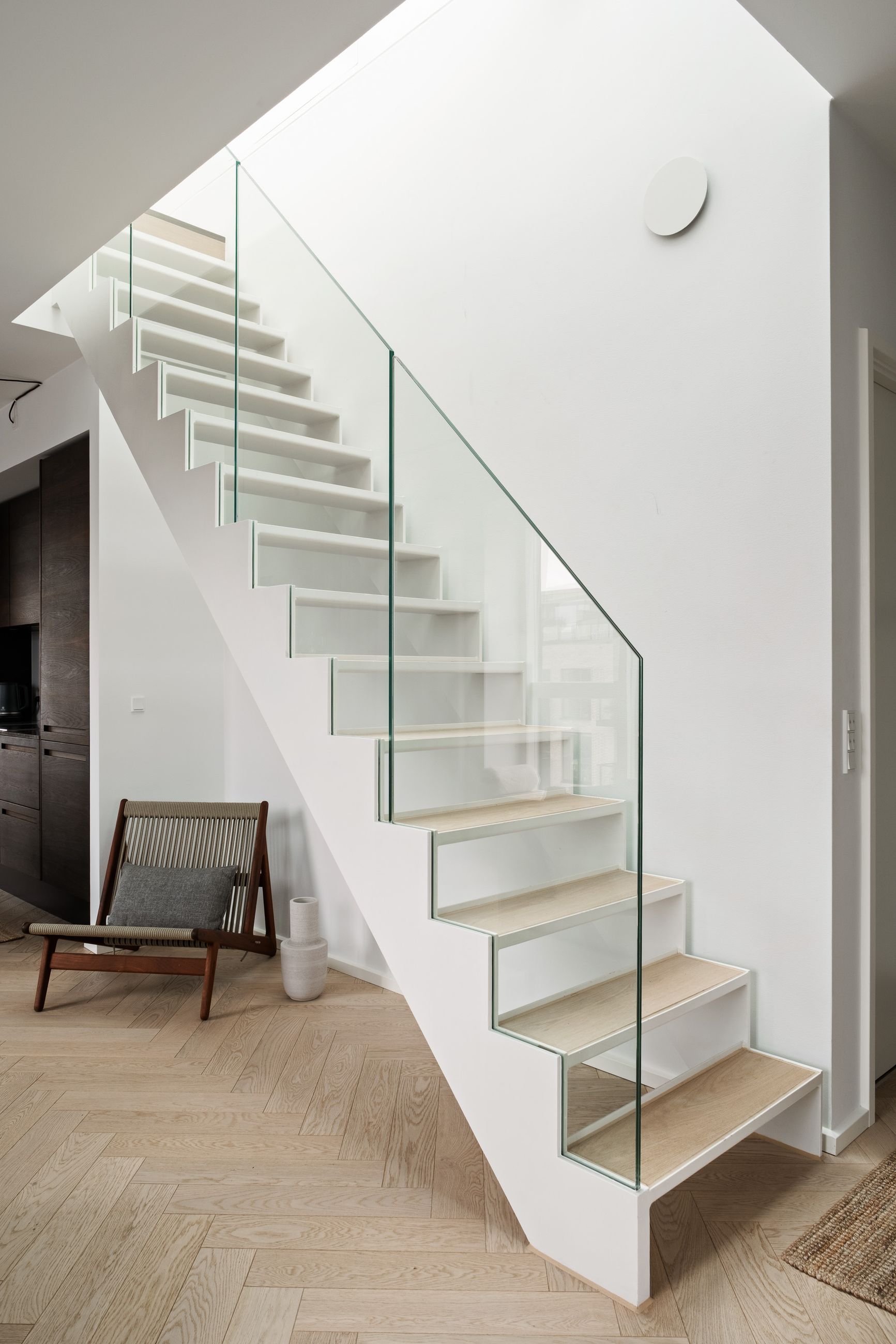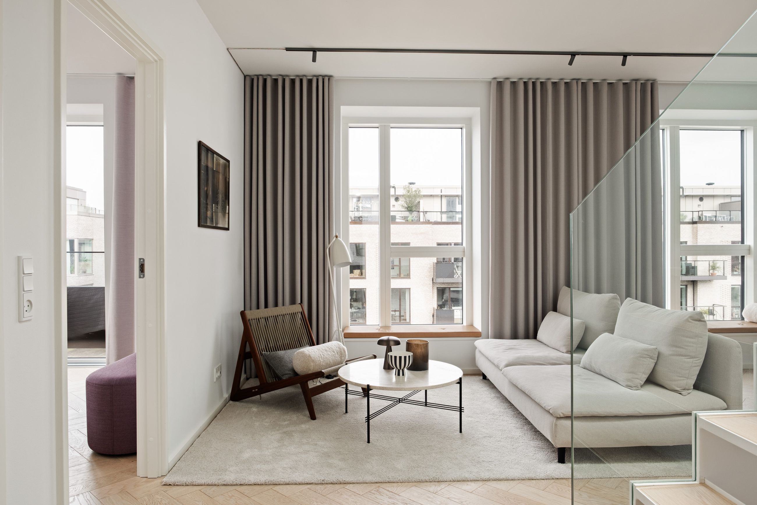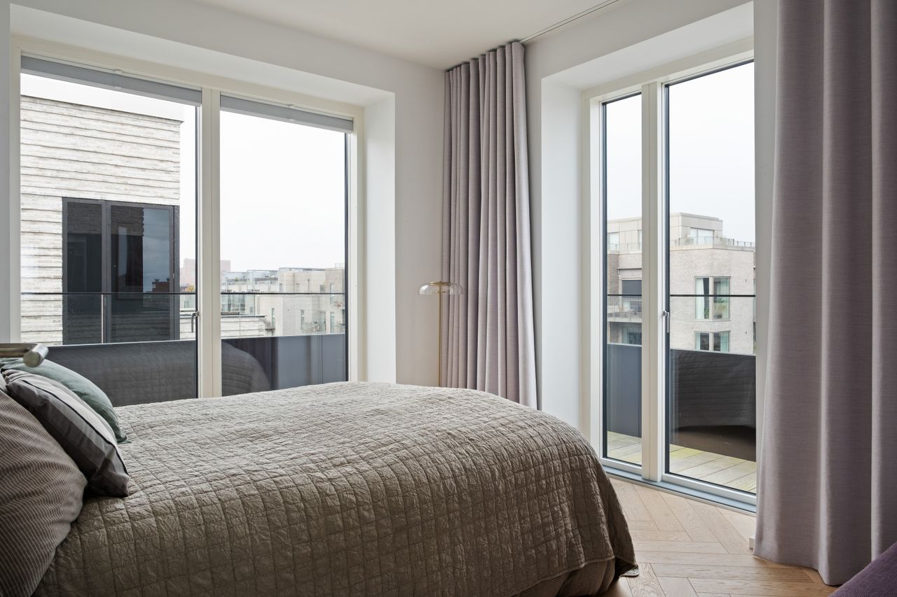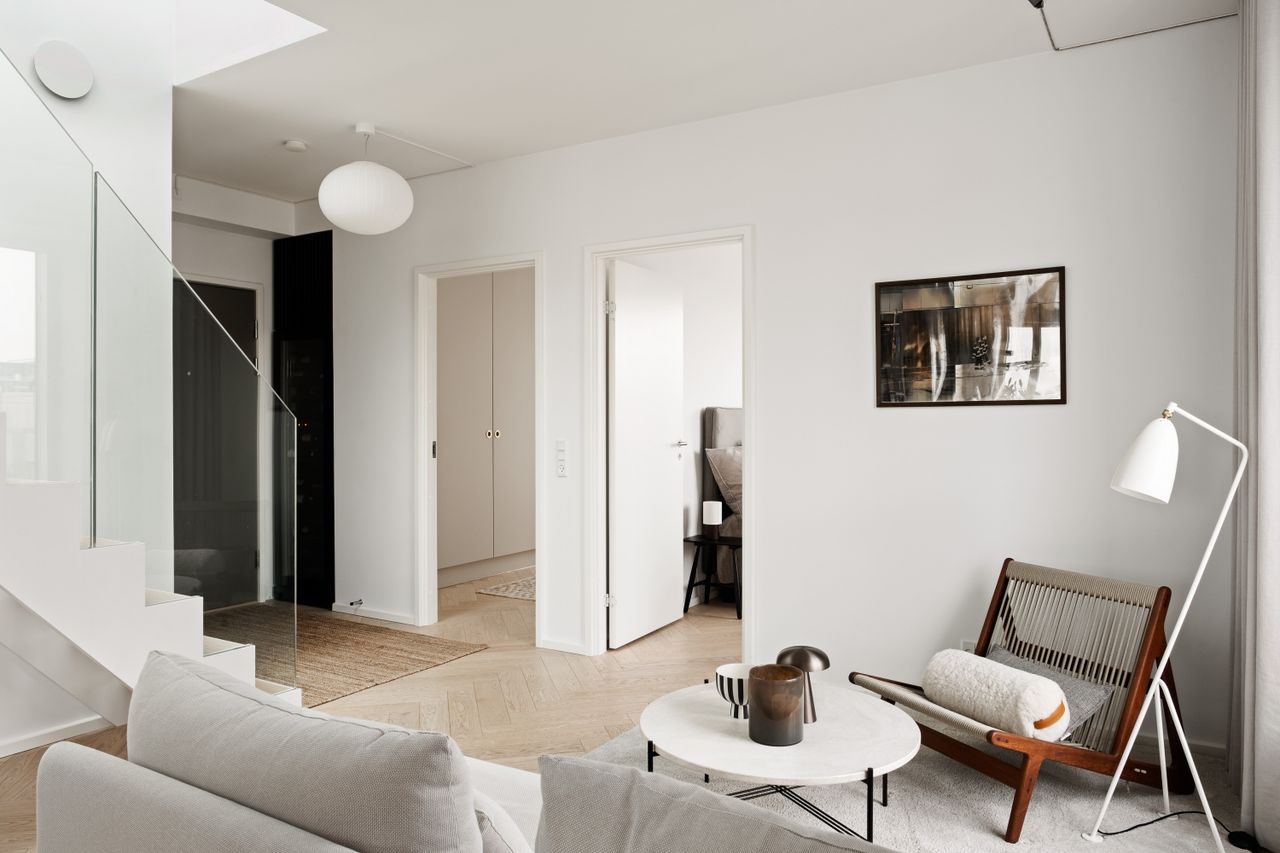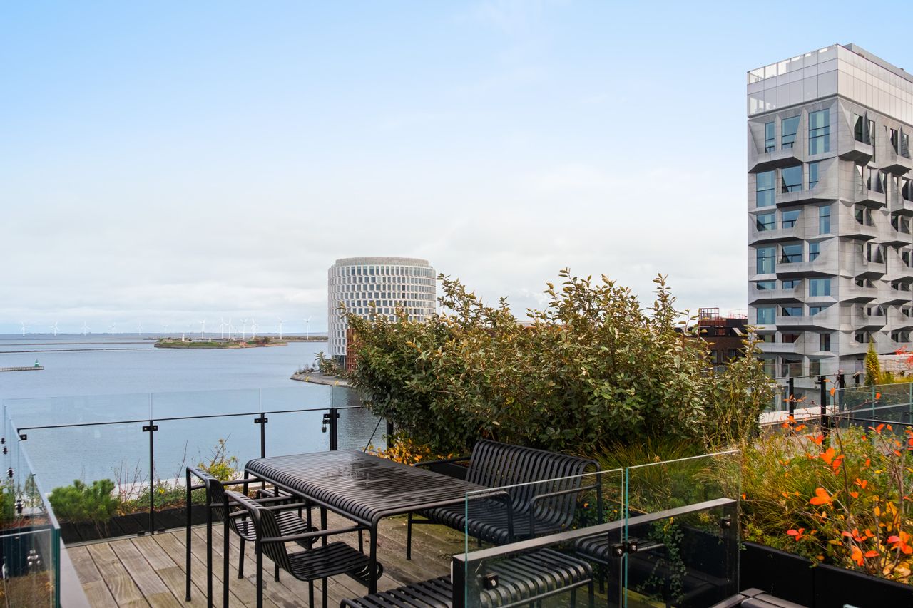En elegant trappe fører op til den private tagterrasse – en oase i højden med plads til sol, middage og udsigt så langt øjet rækker. Indretningen er stilren med lyse farver, sildebenparket og et eksklusivt Kustomhouse-køkken i mørk eg med marmorbordplade.