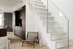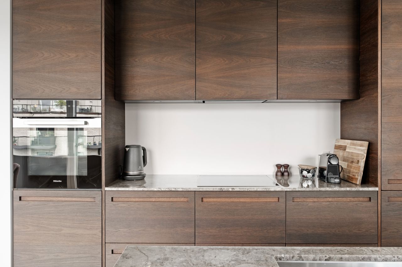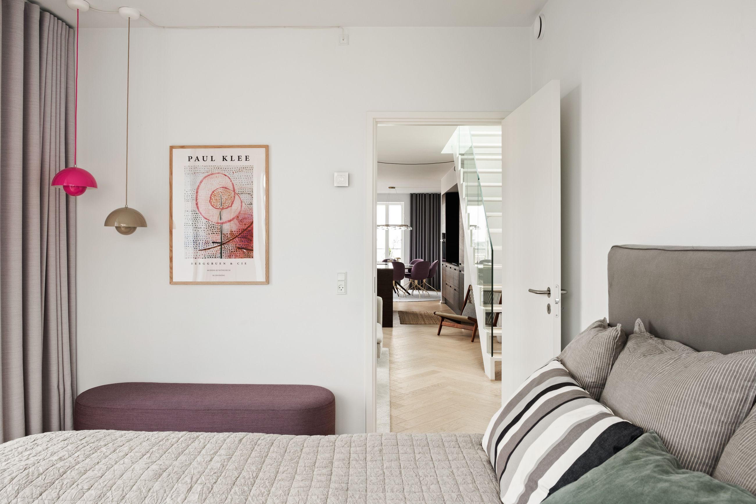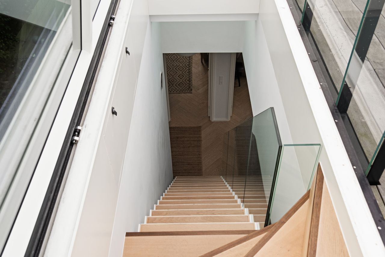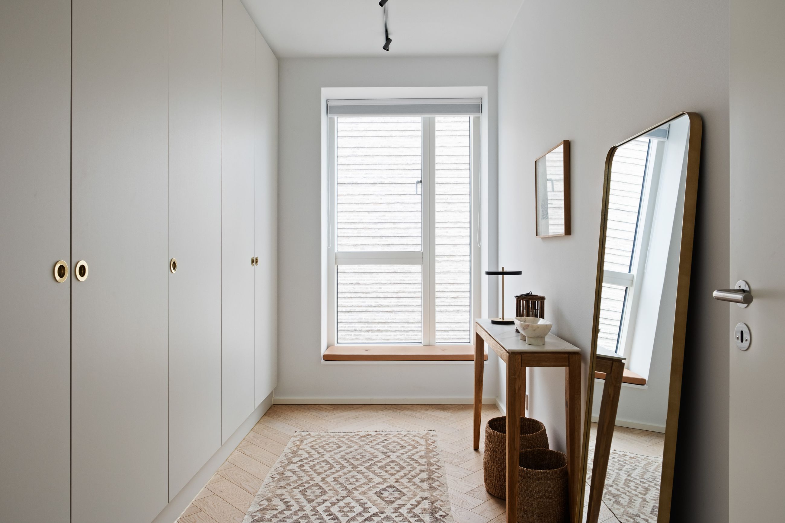 En elegant trappe fører op til den private tagterrasse – en oase i højden med plads til sol, middage og udsigt så langt øjet rækker. Indretningen er stilren med lyse farver, sildebenparket og et eksklusivt Kustomhouse-køkken i mørk eg med marmorbordplade.