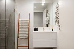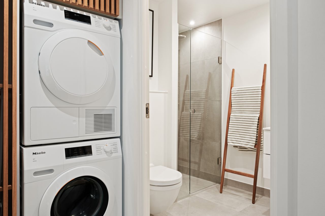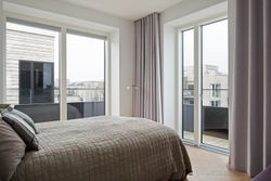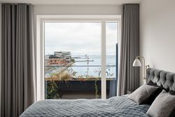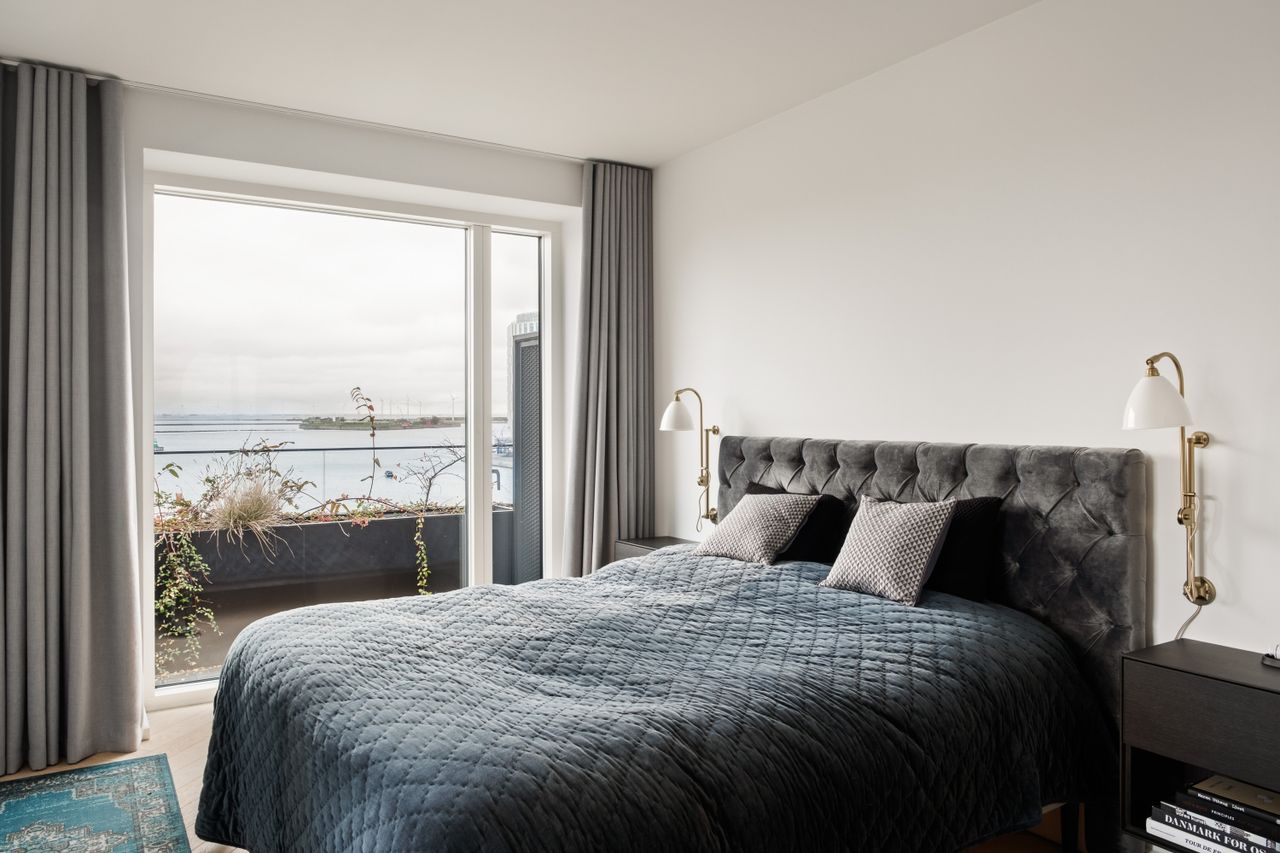 Boligen rummer to soveværelser: ét mod øst med adgang til badeværelse i lyse materialer og ét mod vest med store vinduer, altan og udsigt over havet. Hertil kommer et rummeligt walk-in closet, endnu et moderne badeværelse samt et praktisk bryggers med vaskesøjle.