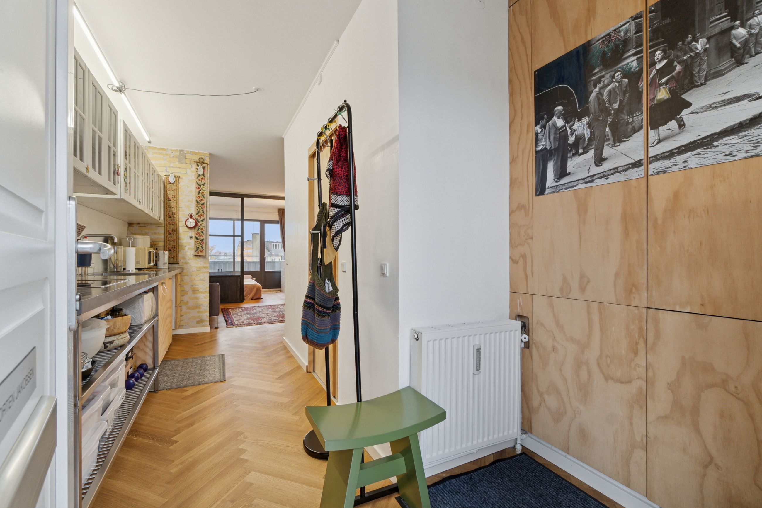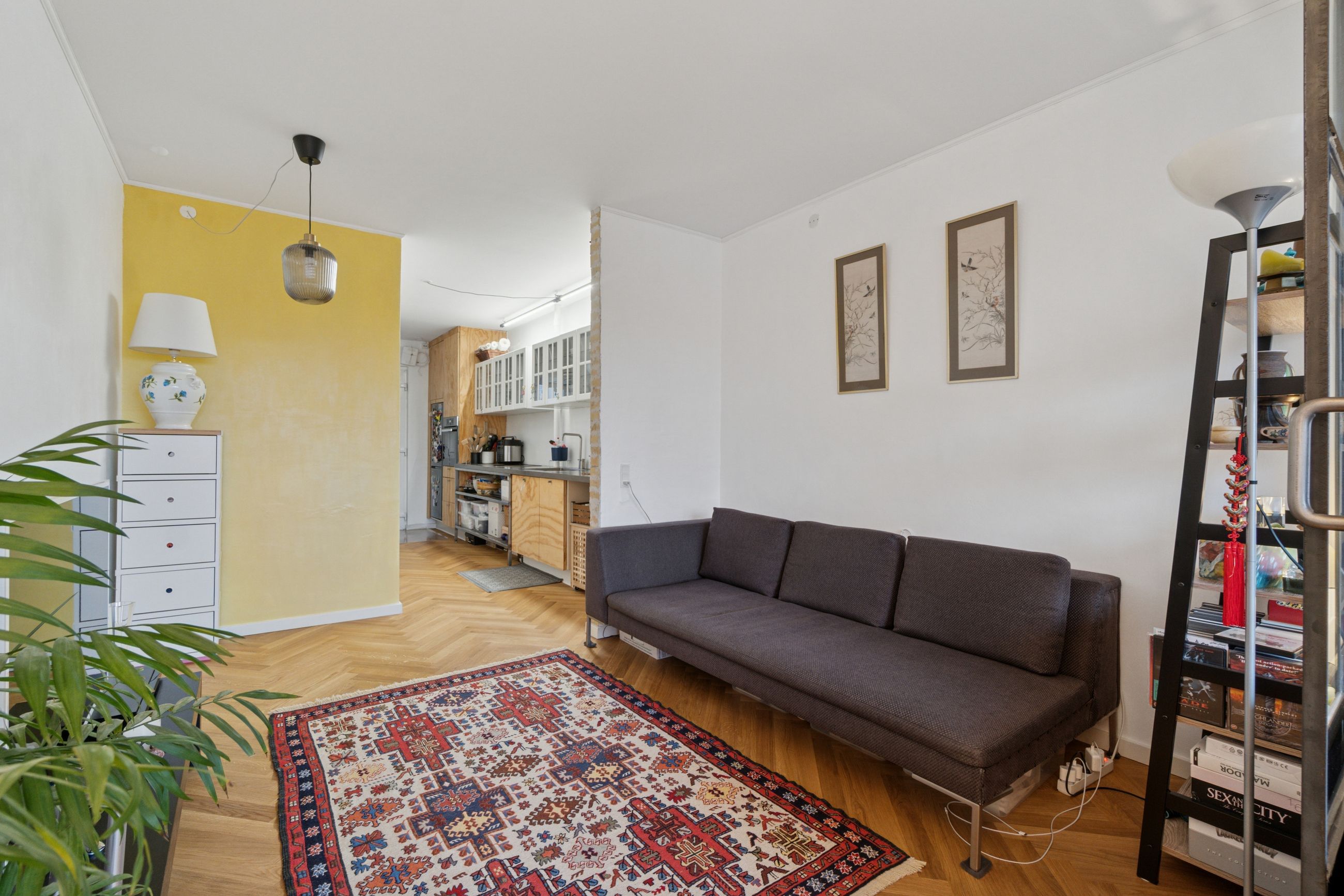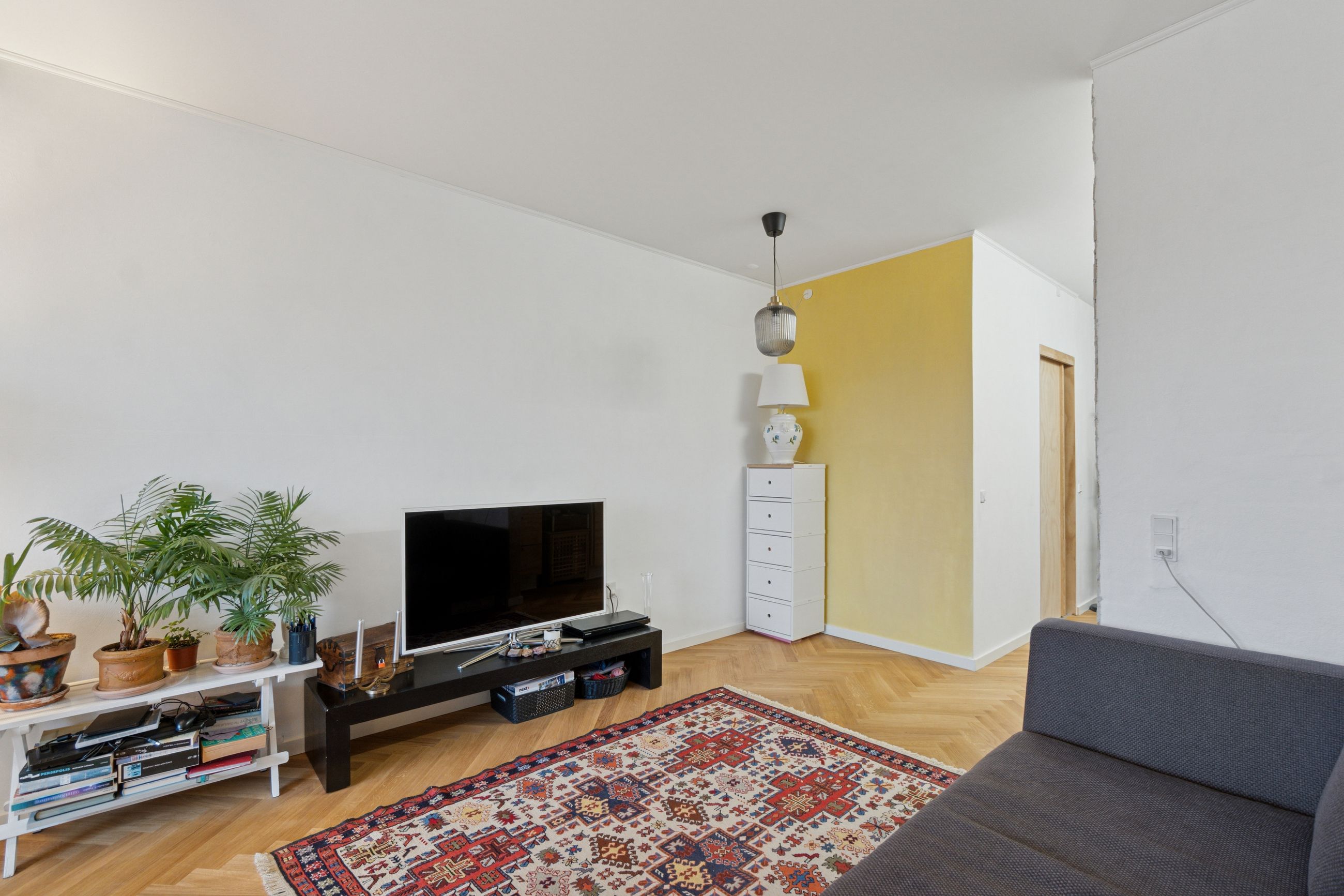 Lejligheden befinder sig på femte sal, og I træder indenfor via entréen med indbygget garderobe, der ligger i direkte forbindelse med det smarte køkken. Fra køkkenet kommer I til den hyggelige stue, hvor I får fine indretningsmuligheder.