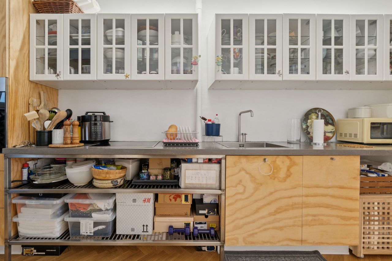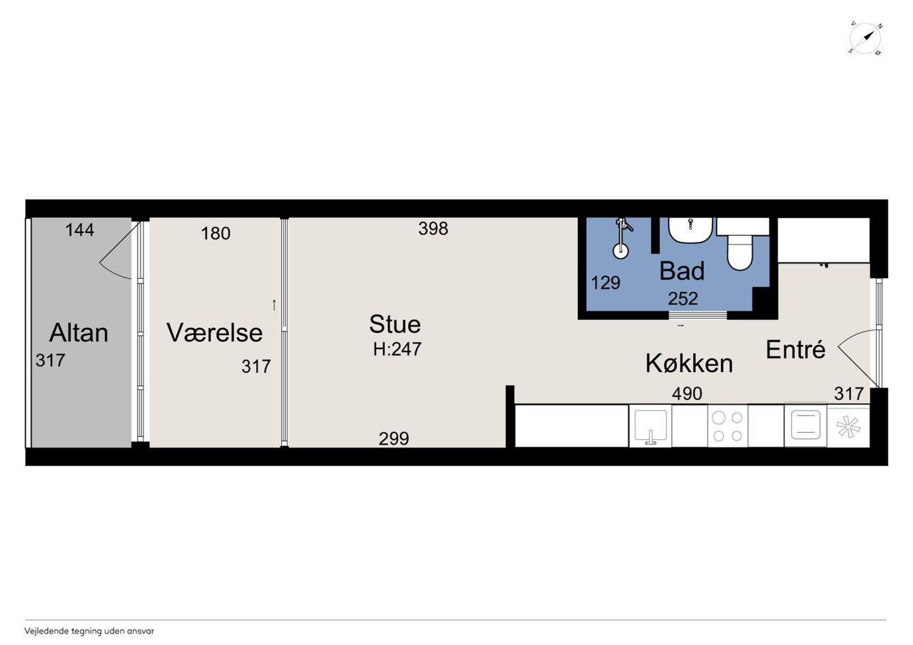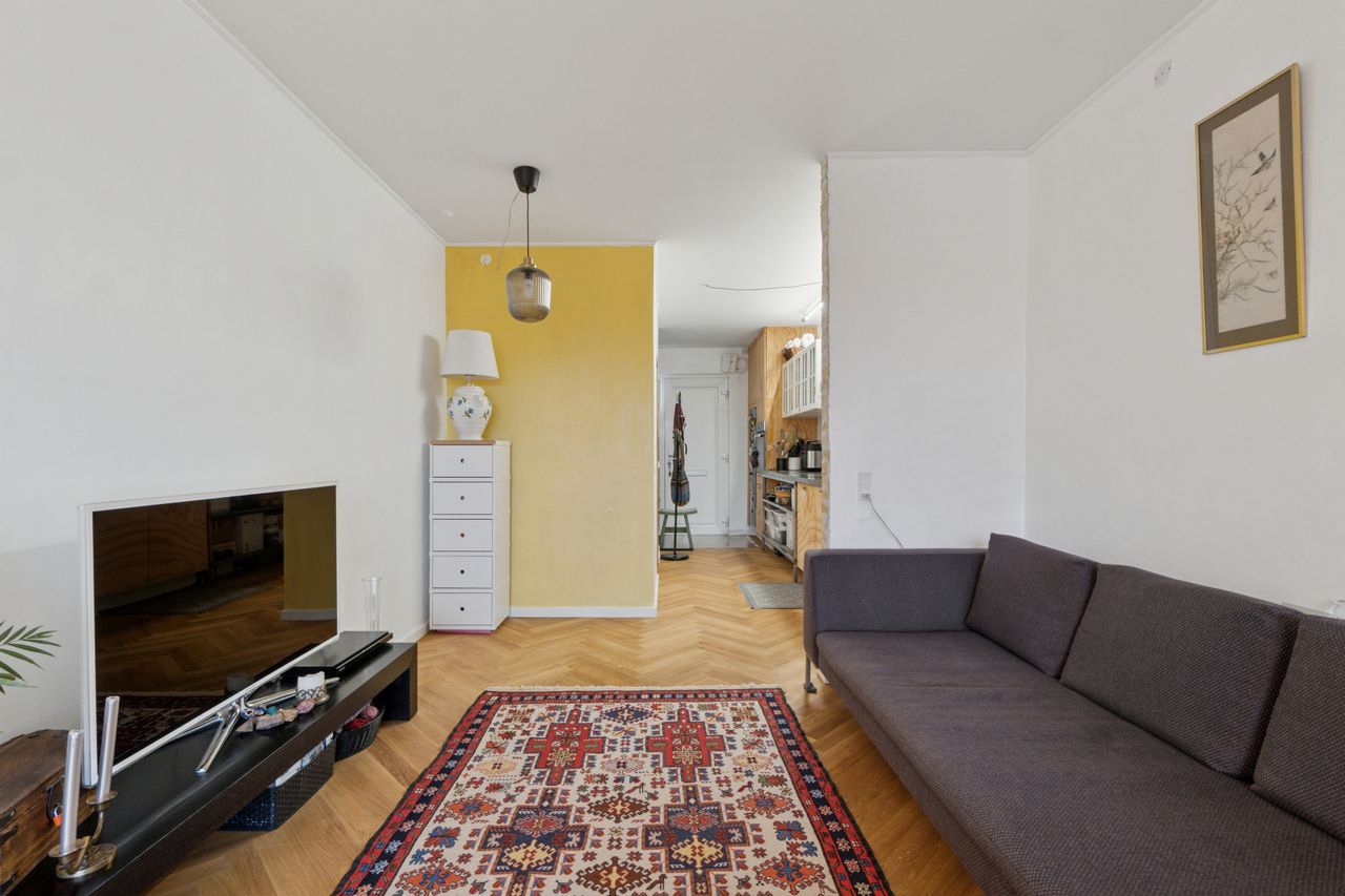 Lejligheden befinder sig på femte sal, og I træder indenfor via entréen med indbygget garderobe, der ligger i direkte forbindelse med det smarte køkken. Fra køkkenet kommer I til den hyggelige stue, hvor I får fine indretningsmuligheder.