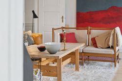 Den tilstødende stue er regulær og rummelig, og herfra er der udsyn til pladsen. Det samme gør sig gældende i de to værelser, som ligeledes er velproportionerede.