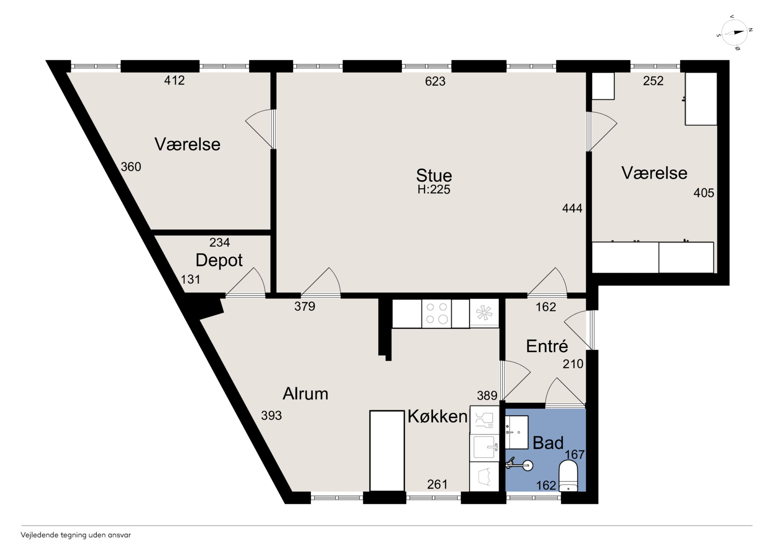 Planløsningen afrundes af et hvidt flisebadeværelse og en entré samt et praktisk depot.