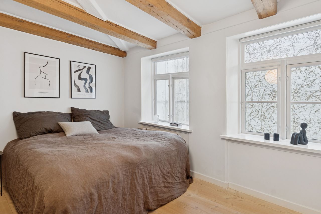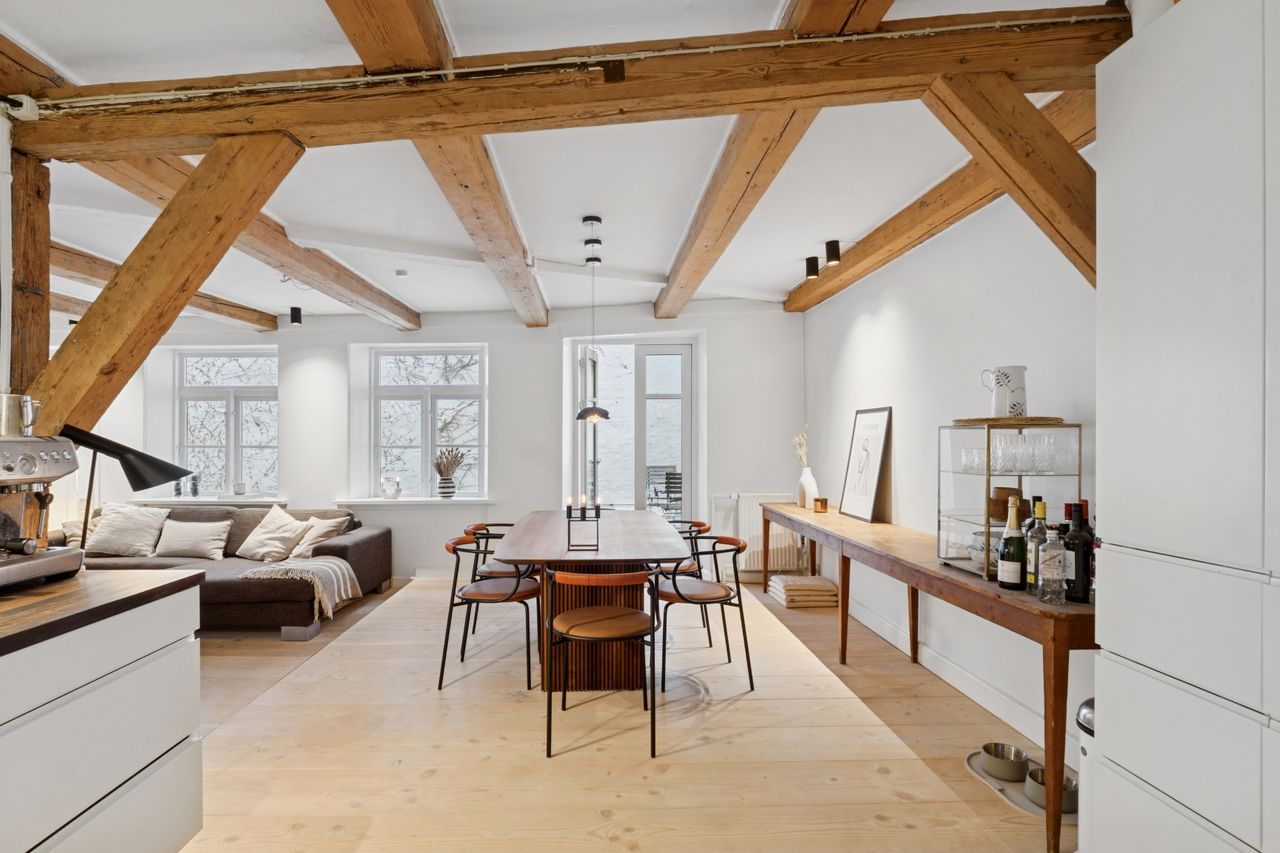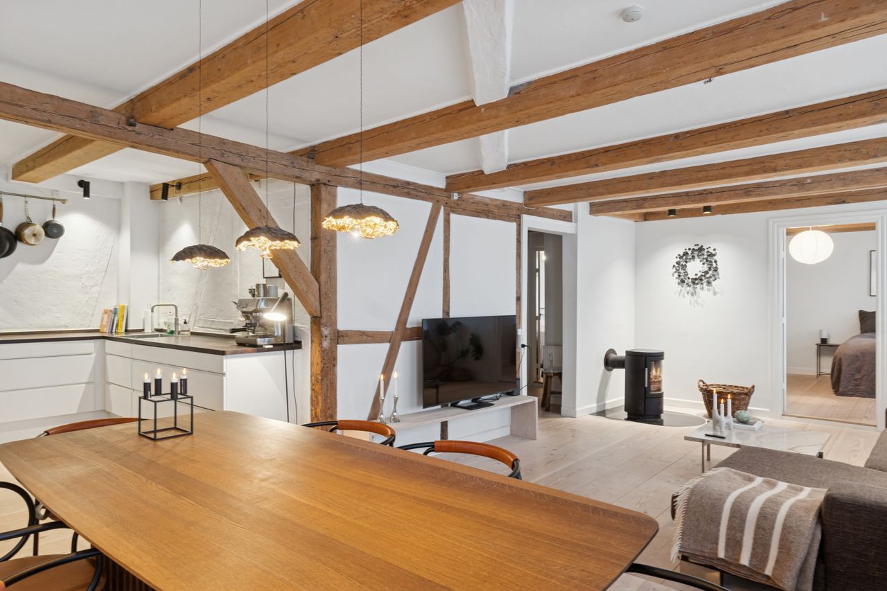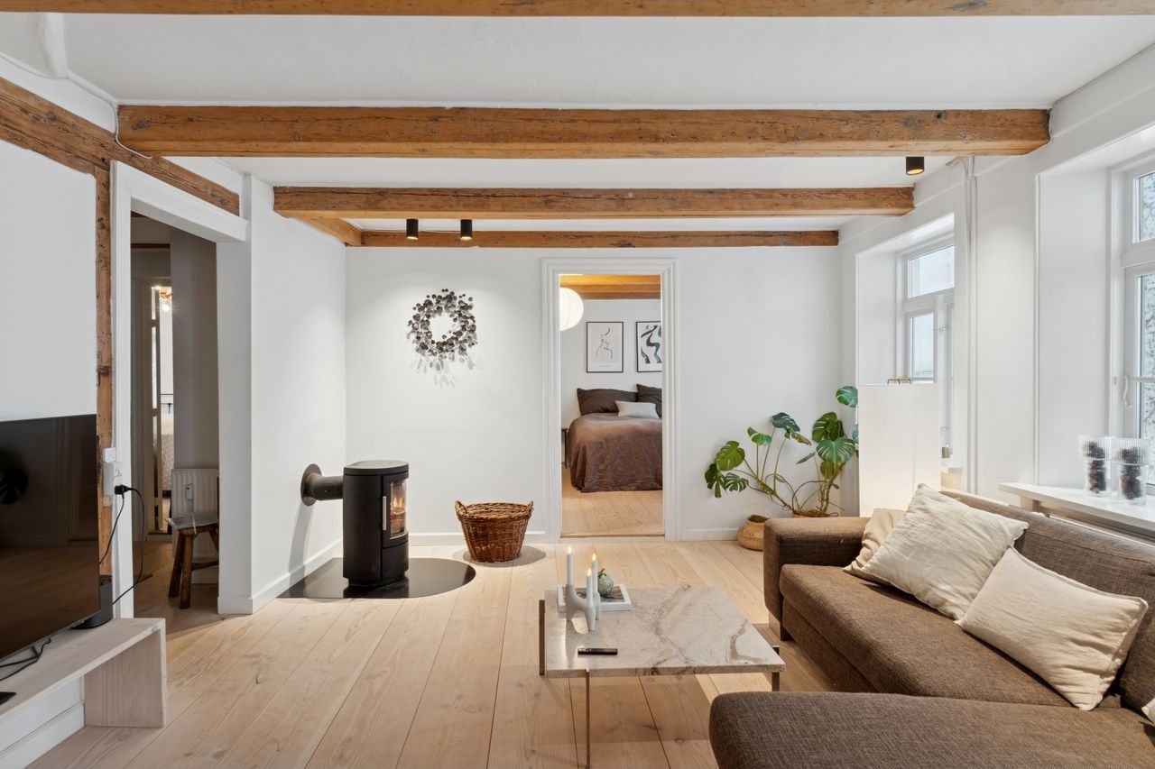 I lejligheden cementeres det positive førstehåndsindtryk, hvor store, lyse rum med markante loftsbjælker og brede plankegulve tager imod dig. Køkken-alrummet udgør boligens åbne opholdsmiljø, hvor der er masser af plads til at indrette hyggelige sektioner. Køkkenet fremstår moderne og funktionelt, og bemærk brændeovnen, der beriger stemningen yderligere i aftentimerne.