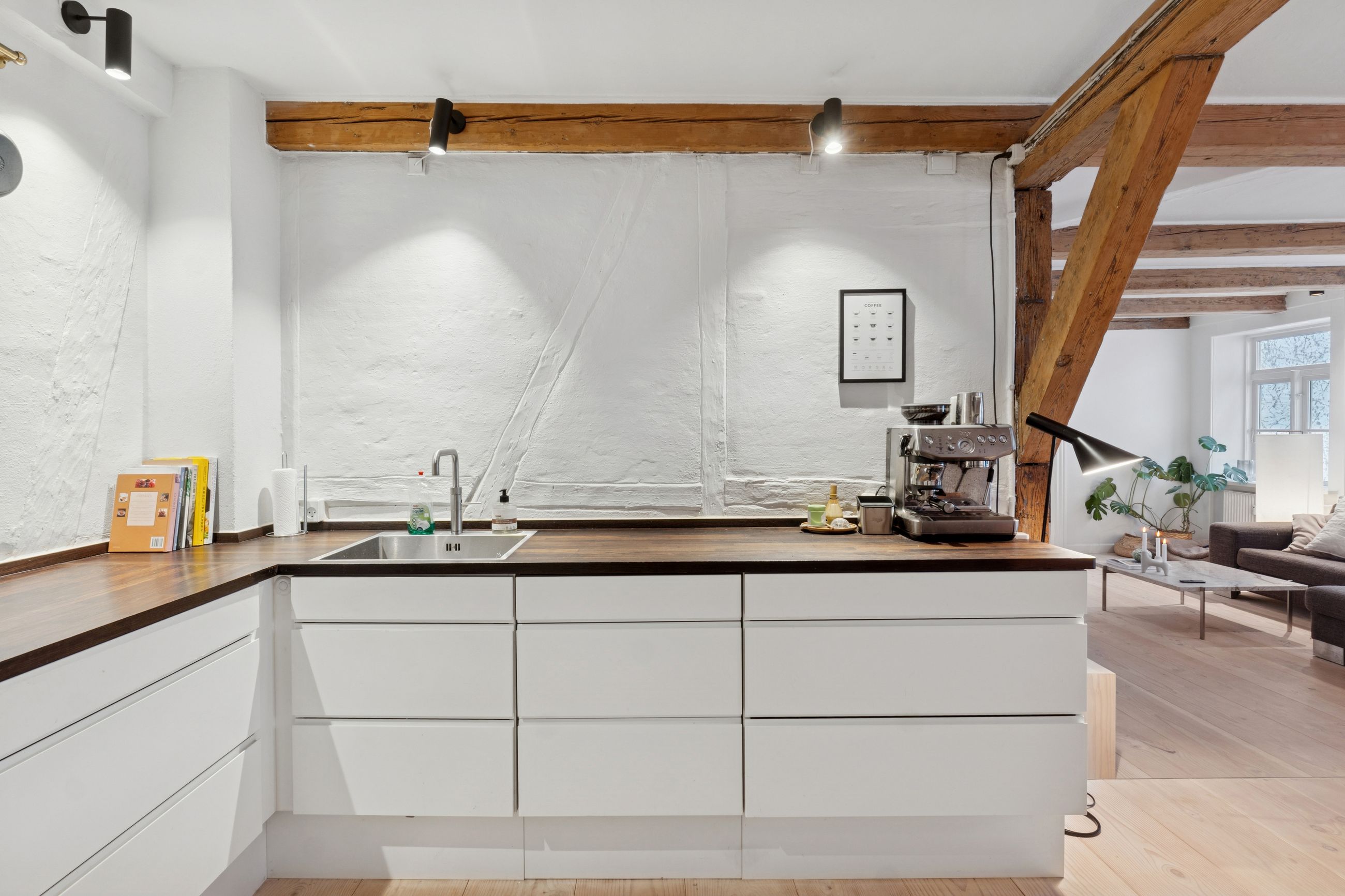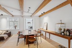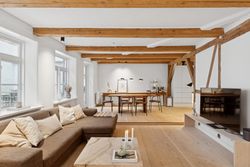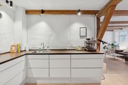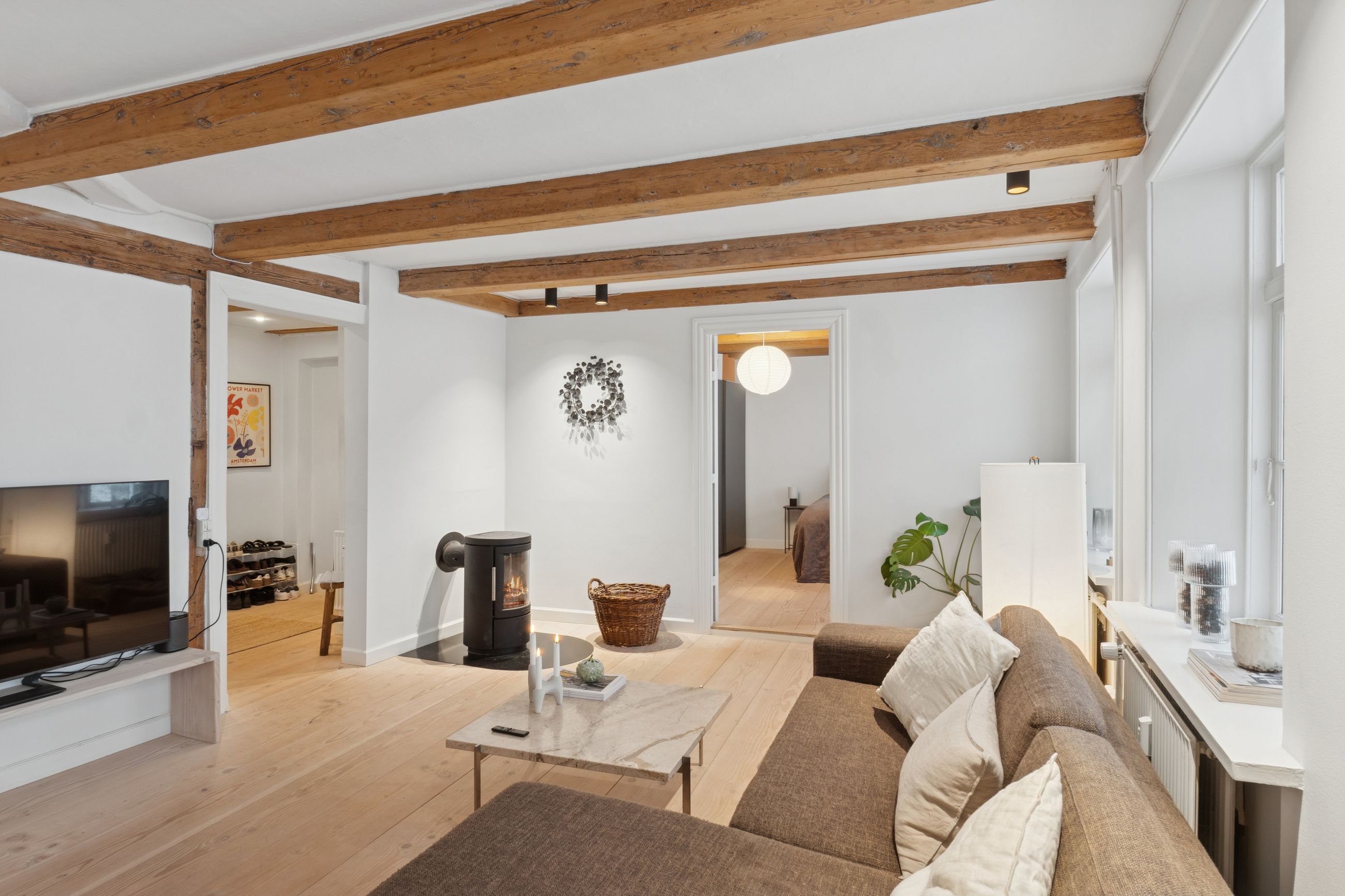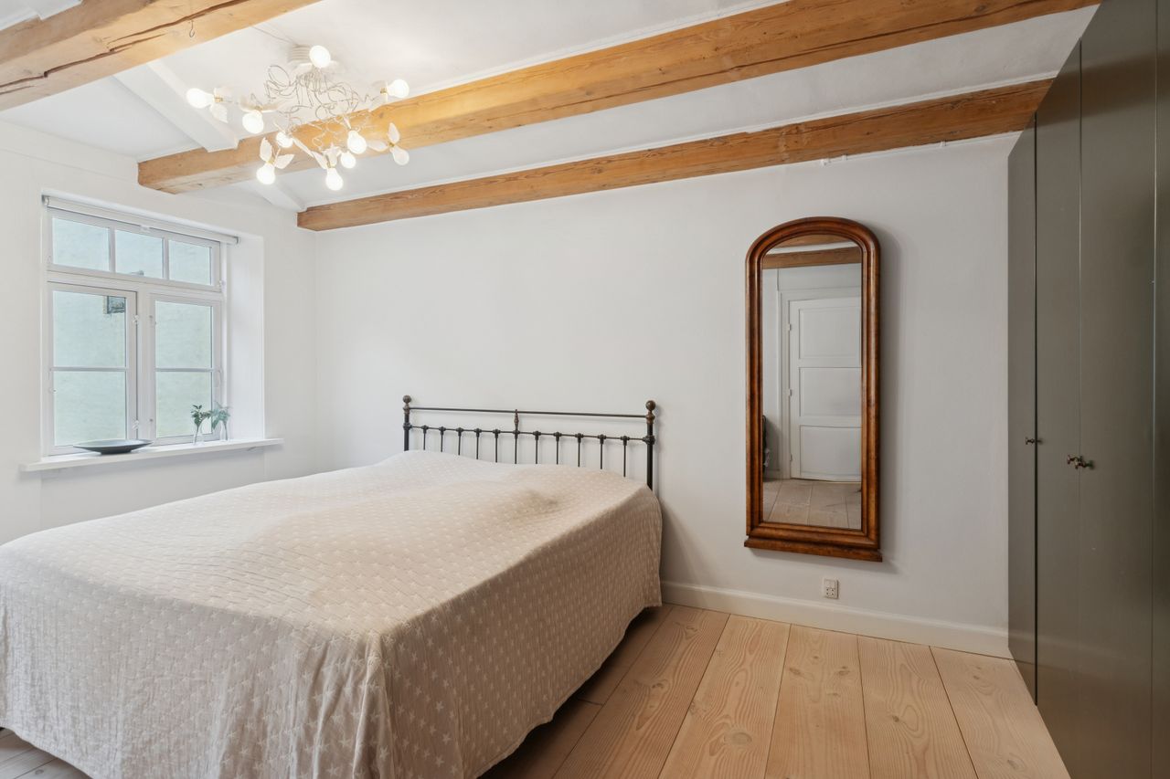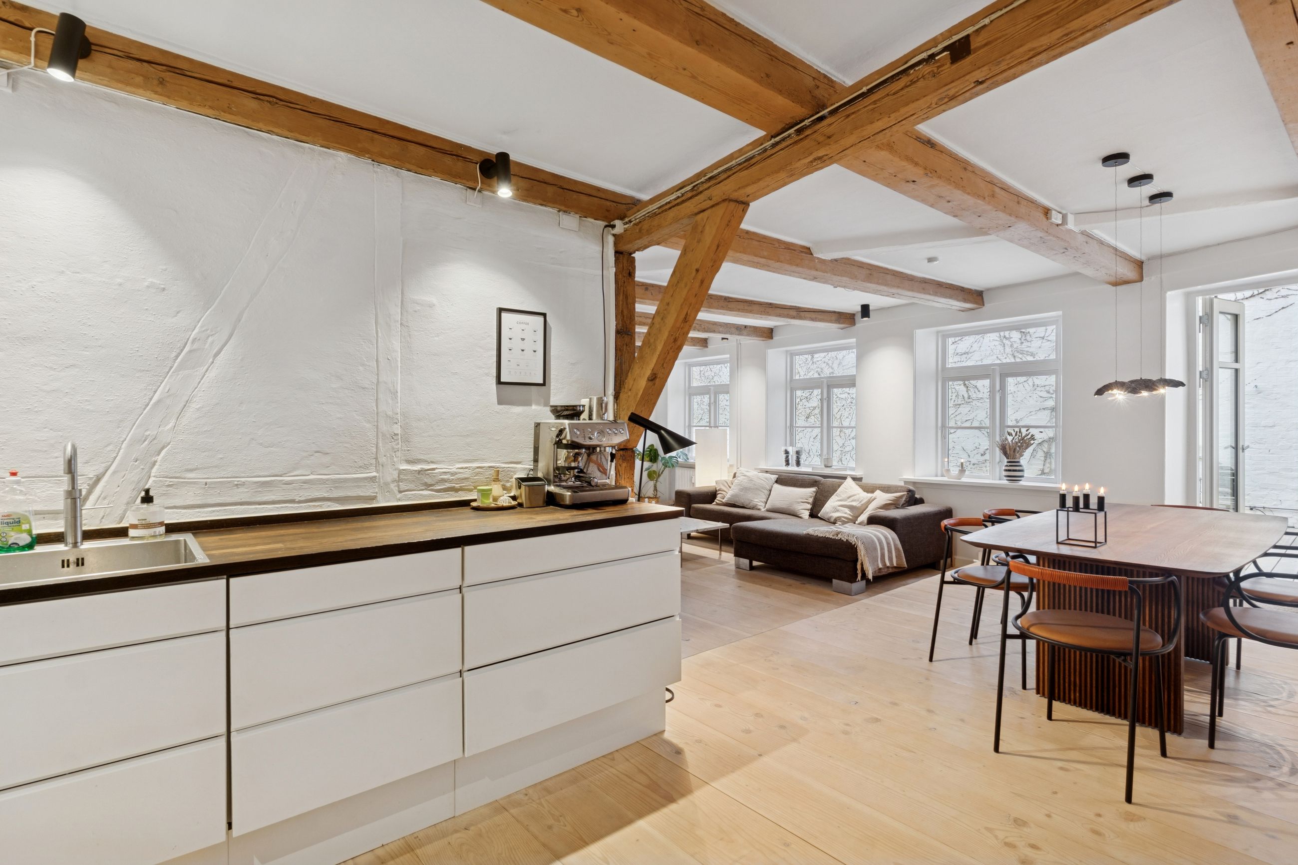 I lejligheden cementeres det positive førstehåndsindtryk, hvor store, lyse rum med markante loftsbjælker og brede plankegulve tager imod dig. Køkken-alrummet udgør boligens åbne opholdsmiljø, hvor der er masser af plads til at indrette hyggelige sektioner. Køkkenet fremstår moderne og funktionelt, og bemærk brændeovnen, der beriger stemningen yderligere i aftentimerne.