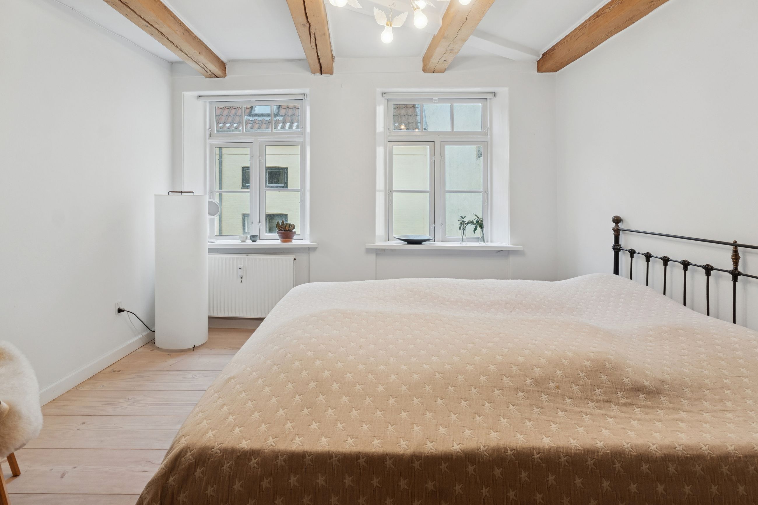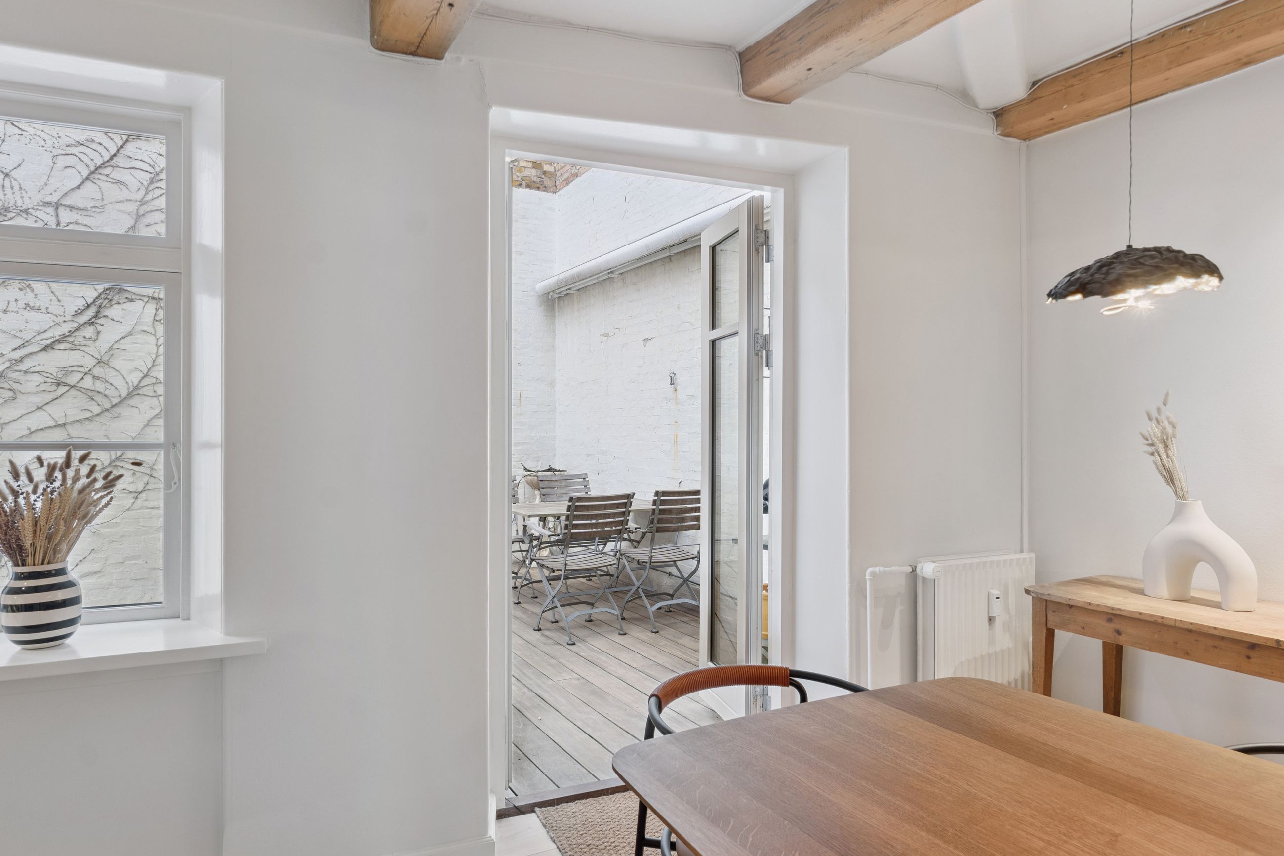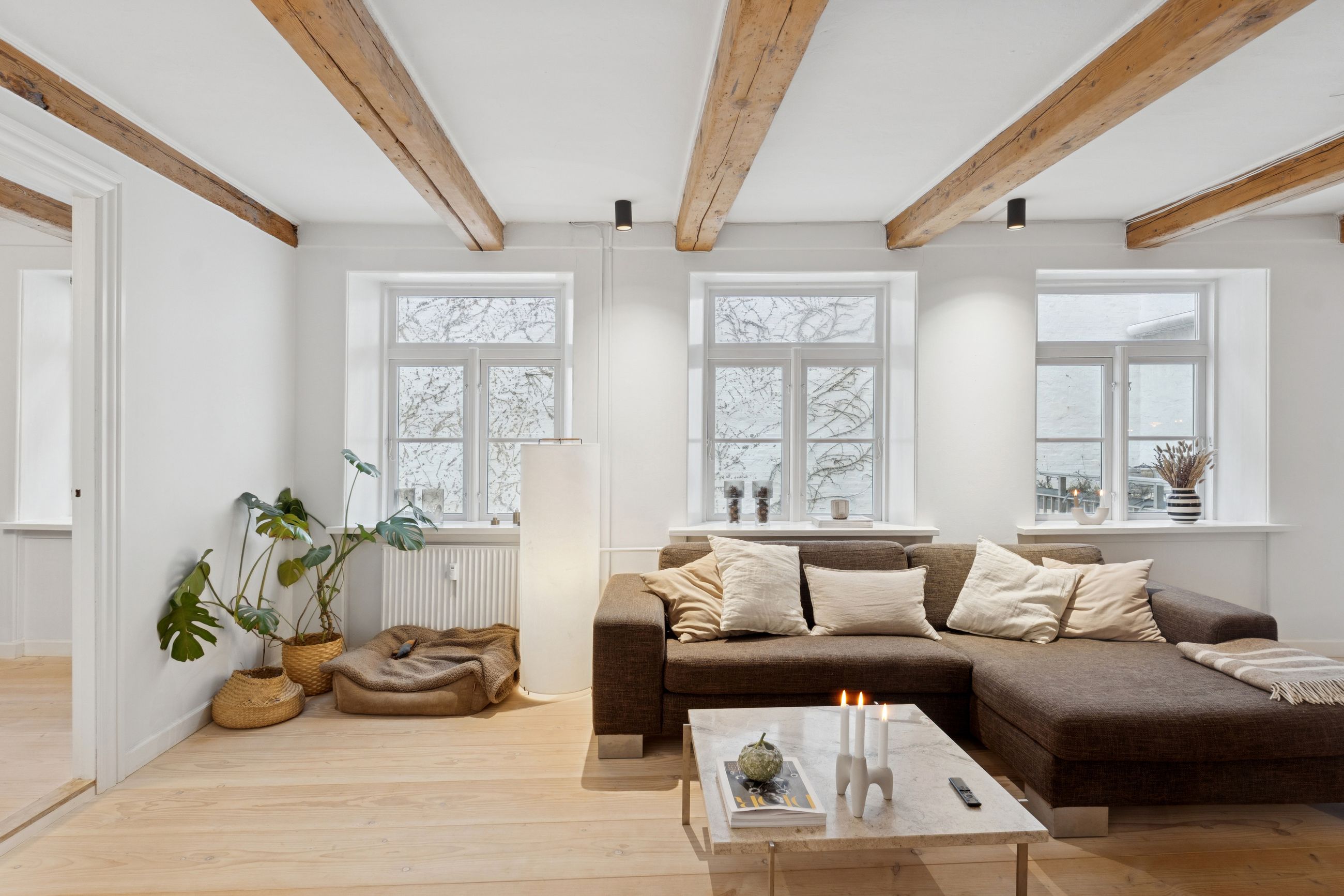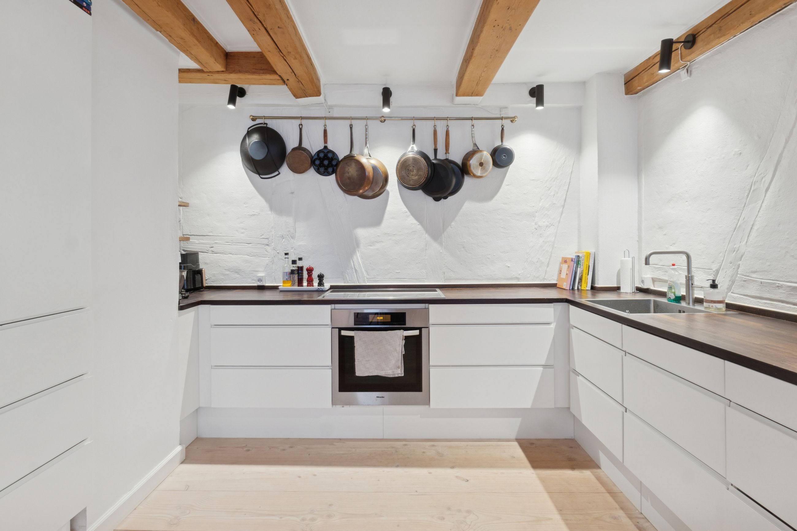 I lejligheden cementeres det positive førstehåndsindtryk, hvor store, lyse rum med markante loftsbjælker og brede plankegulve tager imod dig. Køkken-alrummet udgør boligens åbne opholdsmiljø, hvor der er masser af plads til at indrette hyggelige sektioner. Køkkenet fremstår moderne og funktionelt, og bemærk brændeovnen, der beriger stemningen yderligere i aftentimerne.