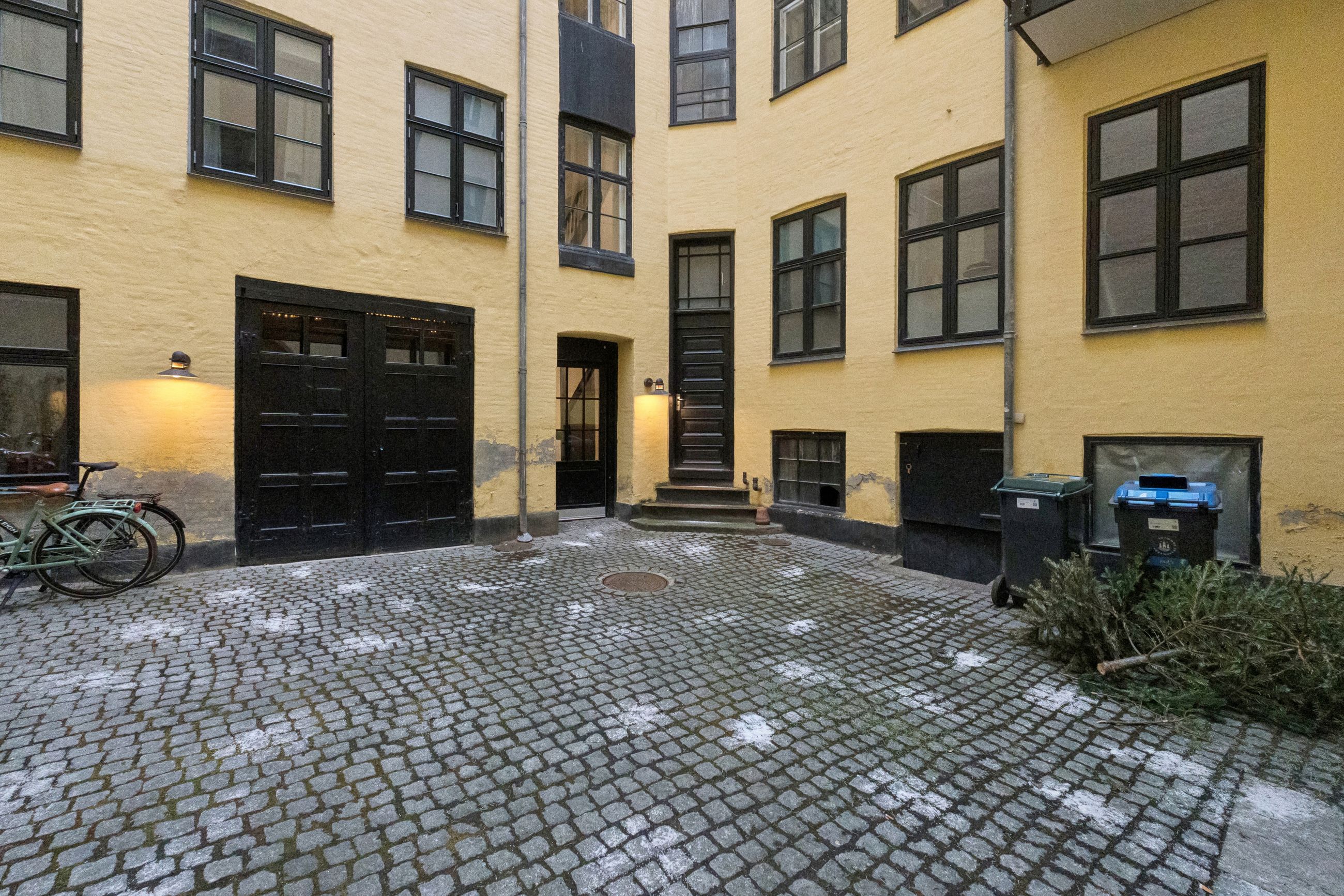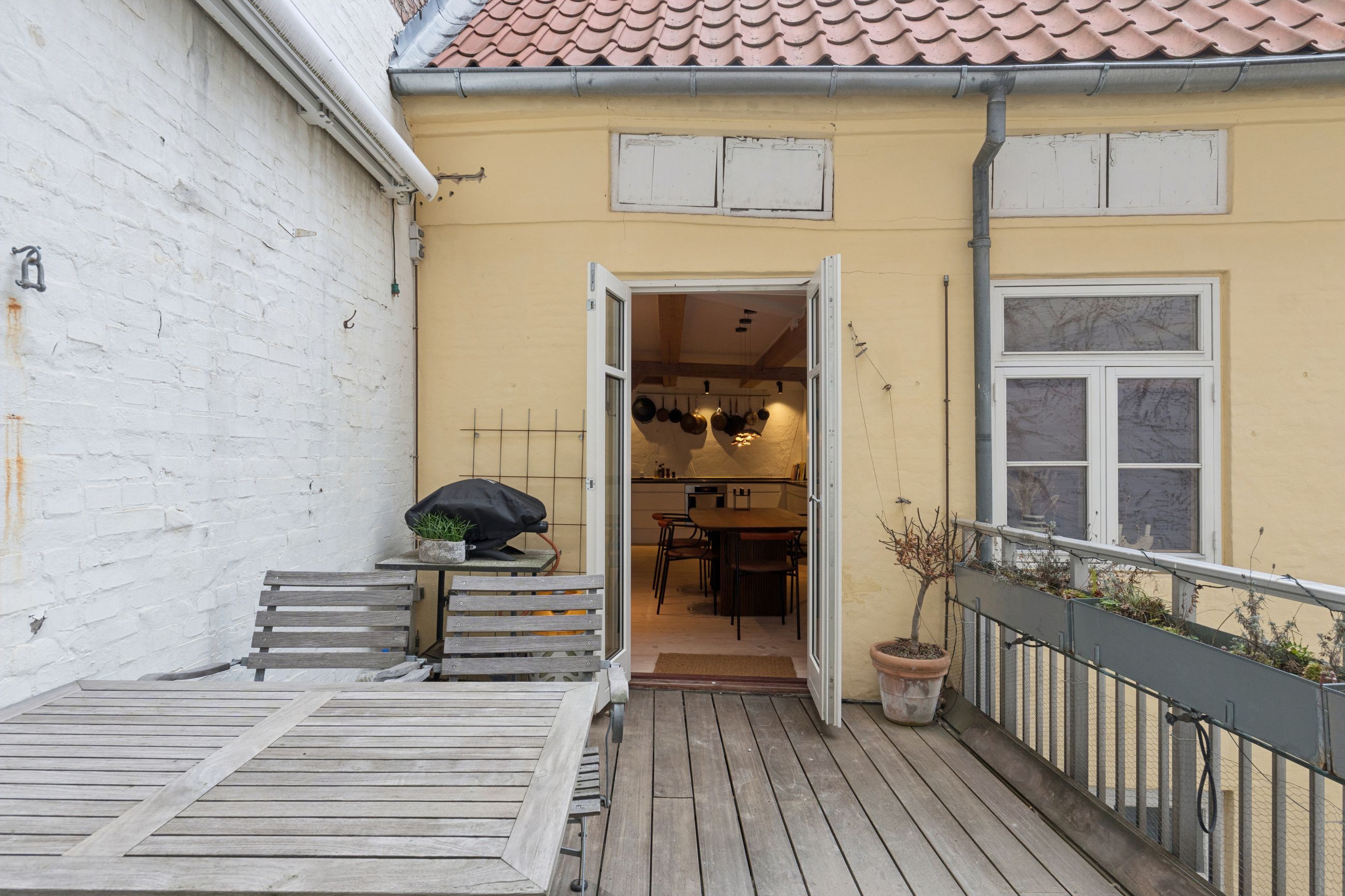 Ejendommen ligger tilbagetrukket i en stille baggård med brostensbelægning. Her mærker du tydeligt den historiske atmosfære, samtidig med at du føler dig skærmet fra byens pulserende liv.