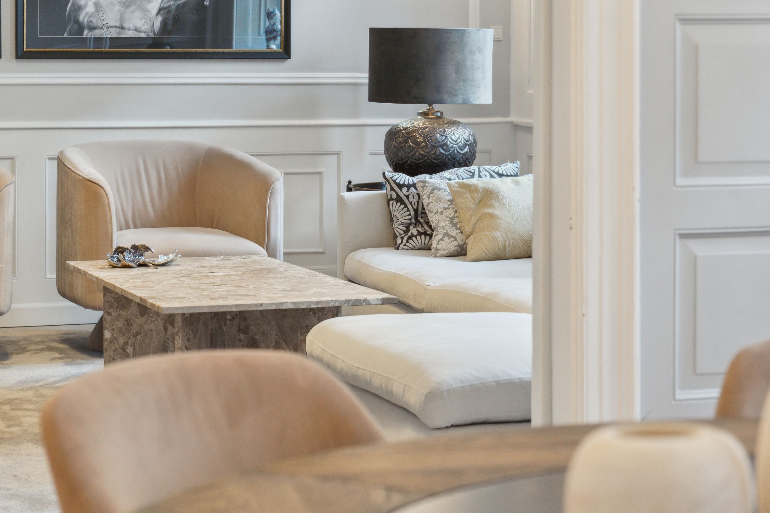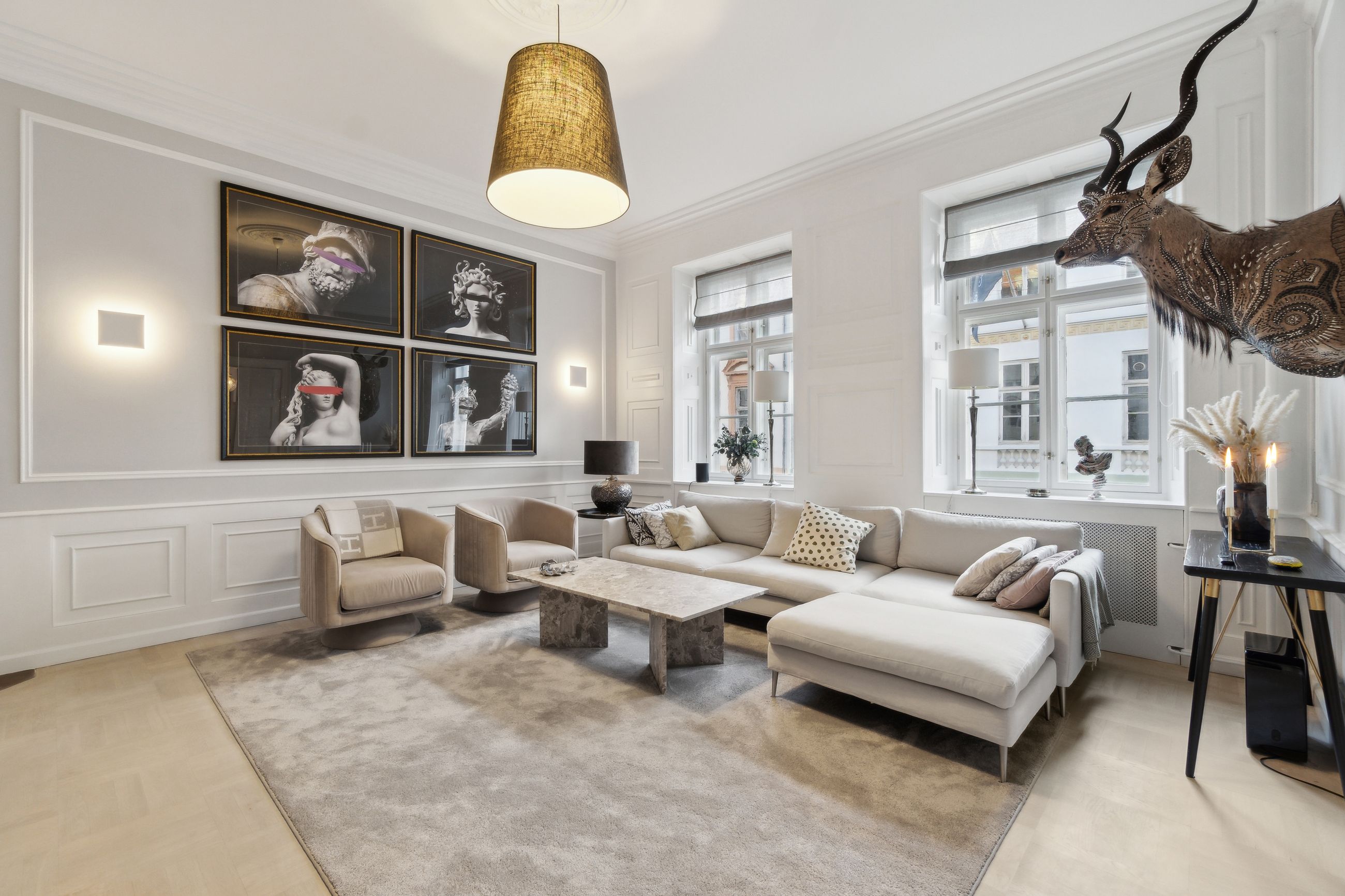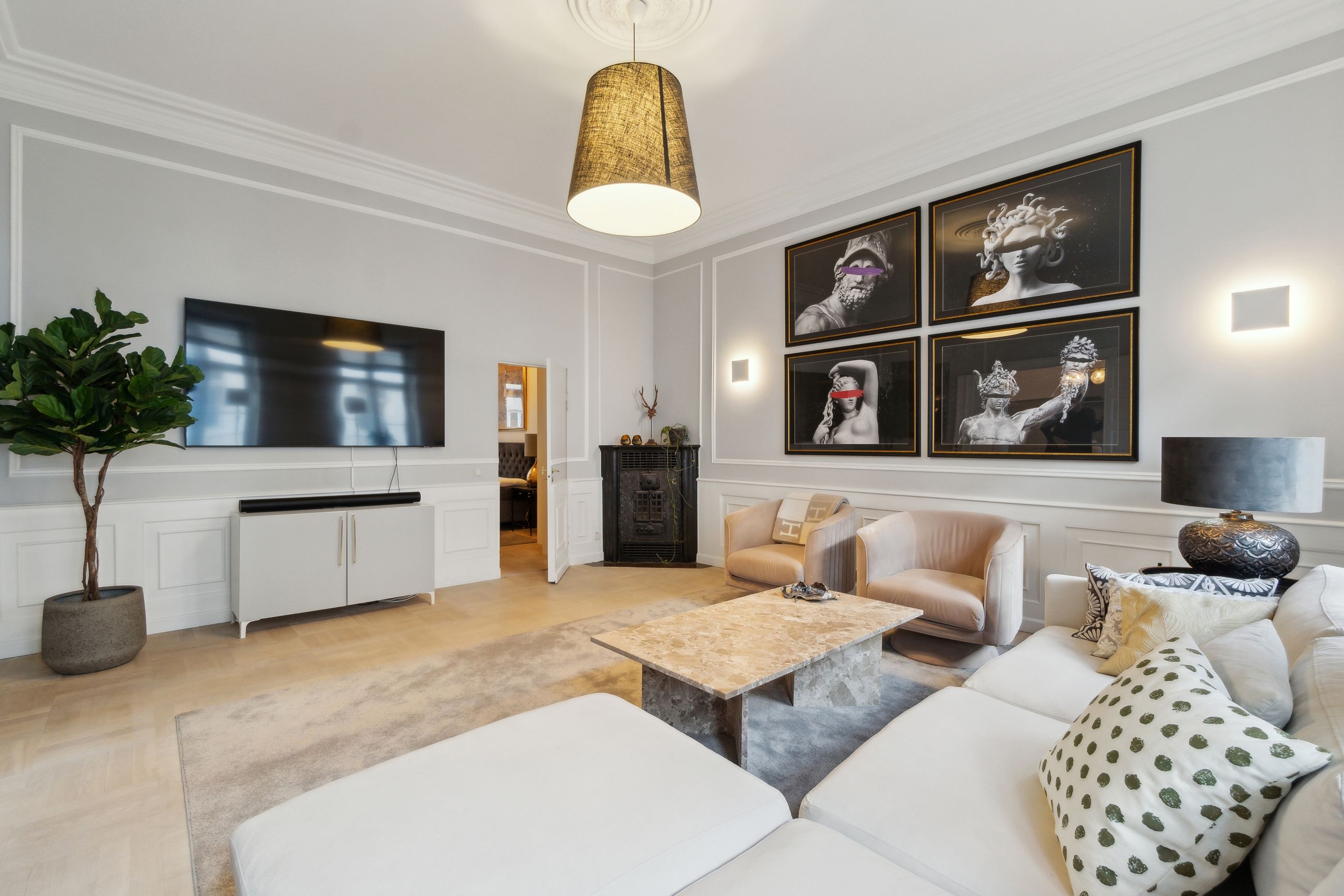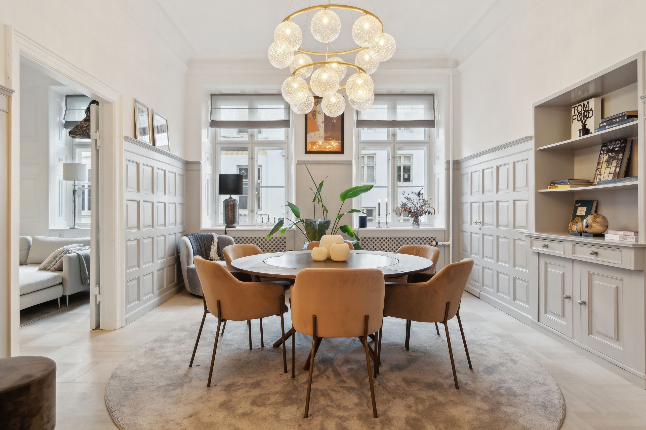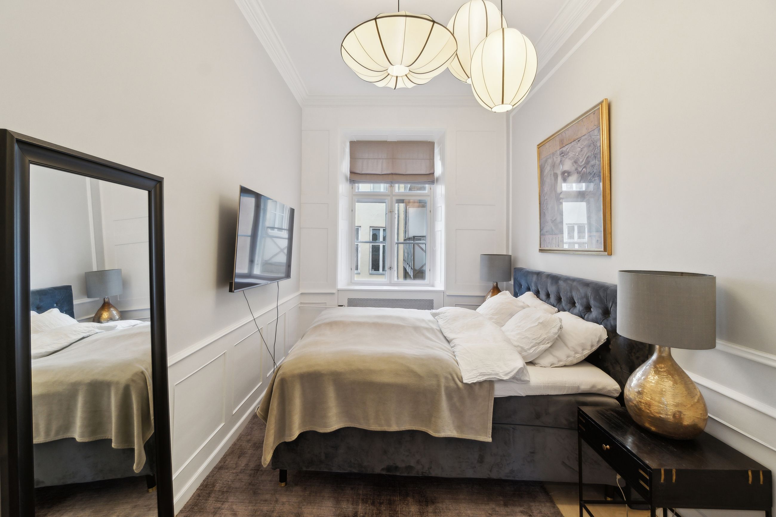Flotte detaljer, høje vægpaneler og en herskabelig stil er netop, hvad der venter jer i denne elegante