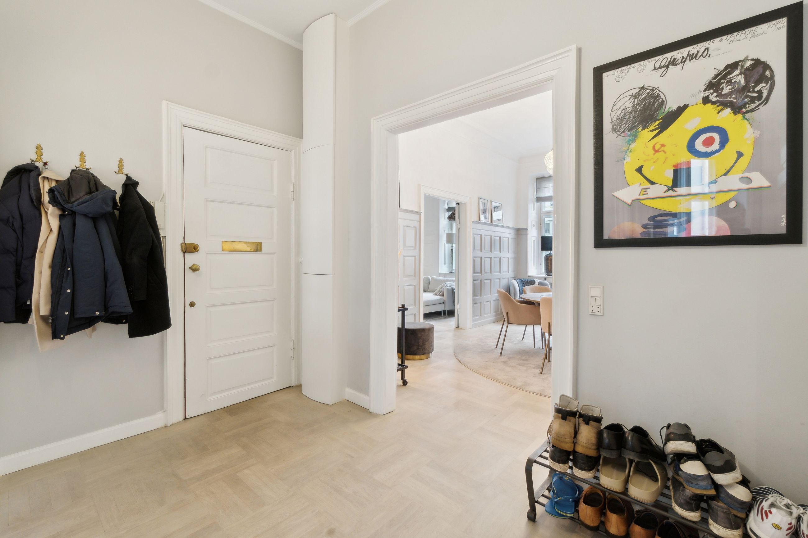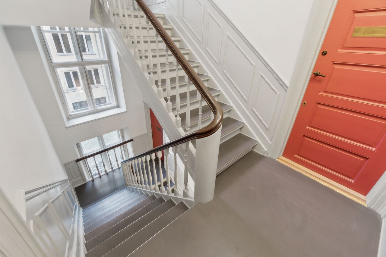 Lejligheden er placeret på første sal i en ejendom fra 1814. Indenfor kan I se frem til en gennemført