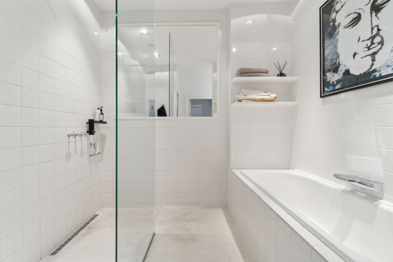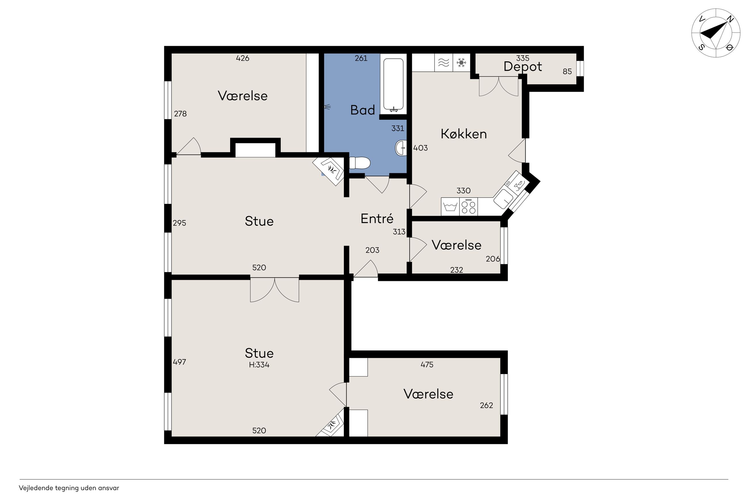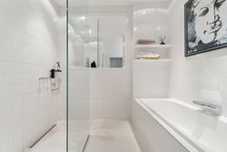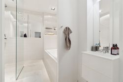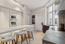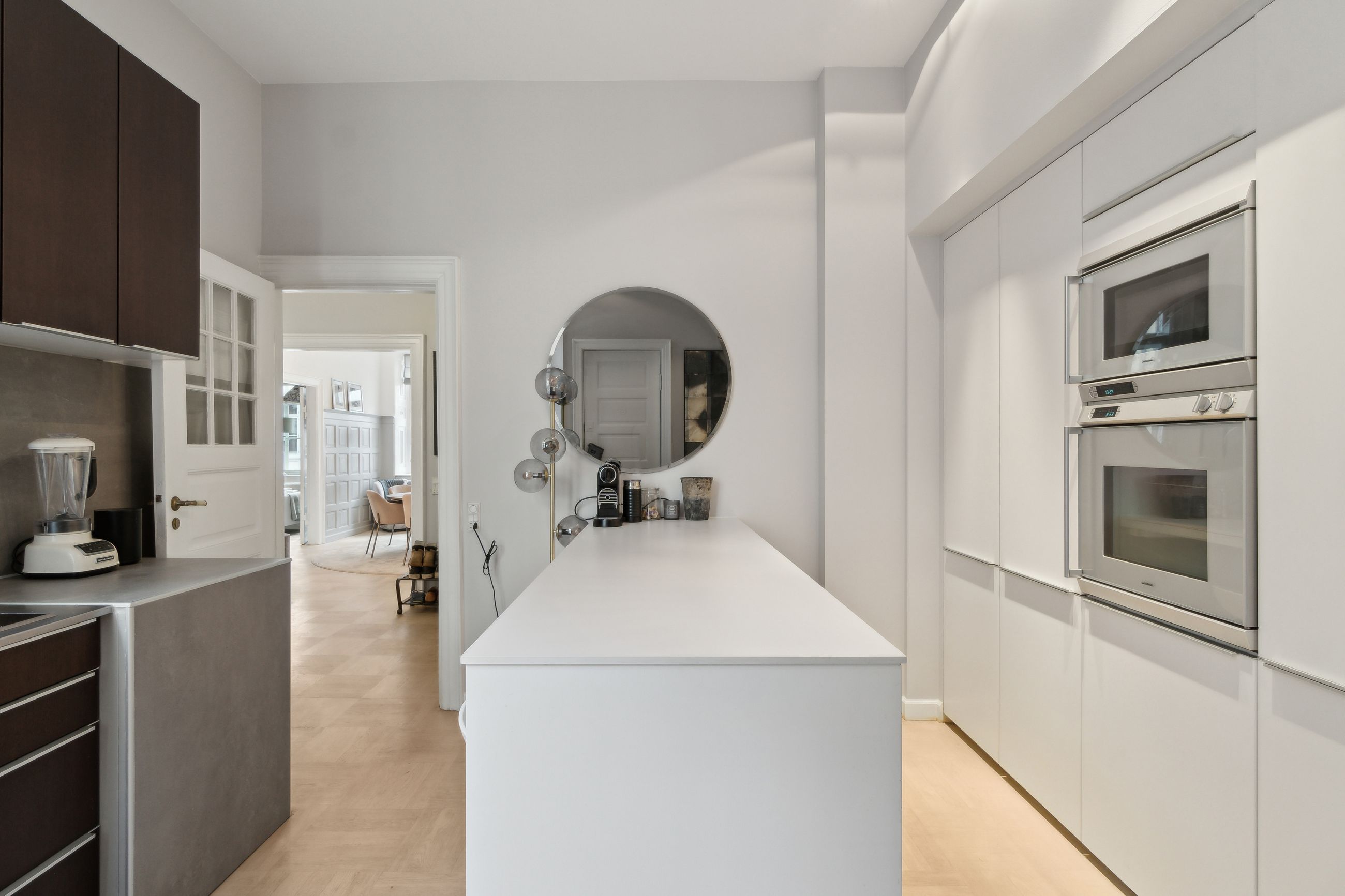 spisestue og opholdsstue. Køkkenet præsentere sig moderne, og så er der etableret et siddeområde med plads til 6, hvor det hvide bord matcher sektionen med indbyggede skabe til køkkenremedierne. Køkkenet er fra Poggenpohl og hårde hvidevarer fra Gaggenau. Videre møder I et lækkert badeværelse med både badekar og bruseniche, og som det sidste rummer hjemmet tre gode værelser og et depot. I 2 af værelserne er indbyggede skabe, også fra Poggenpohl.
