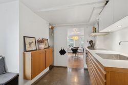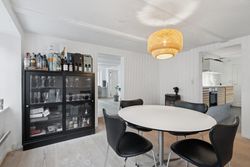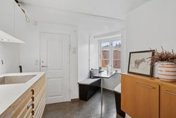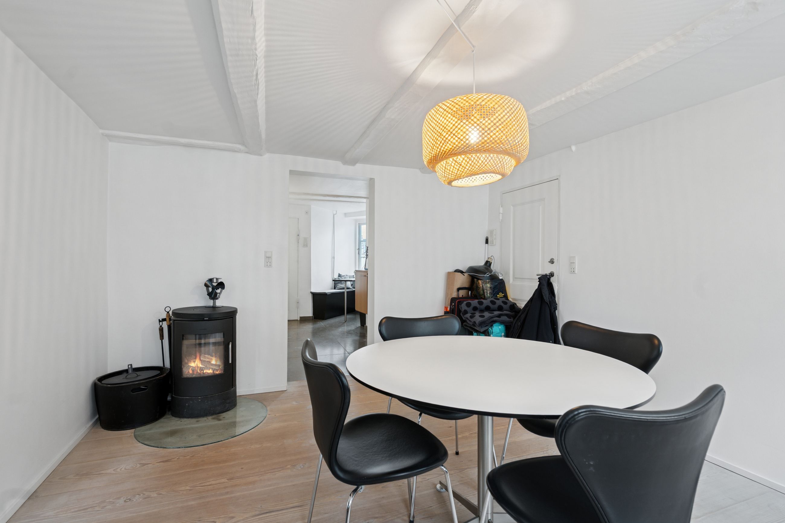 Inden døre starter rundturen i det pæne køkken med en hyggelig spisekrog, og herfra går turen videre til spisestuen med brændeovn. Tilstødende ligger hjørnestuen, hvor pladsen er god og lysindfaldet pragtfuldt, da de mange vinduespartier gavmildt inviterer solstrålerne indenfor. Dobbeltdøre leder jer til et godt soveværelse og som det sidste har I badeværelset, der tilgås via soveværelset og byder på bruseafsnit samt rum til vaskemaskinen.