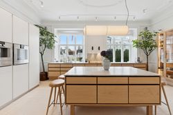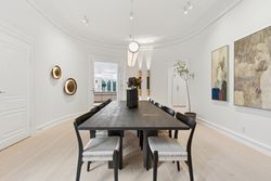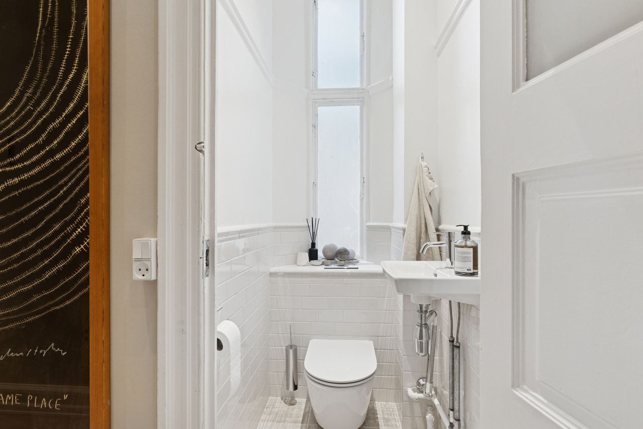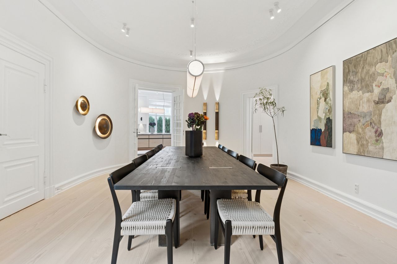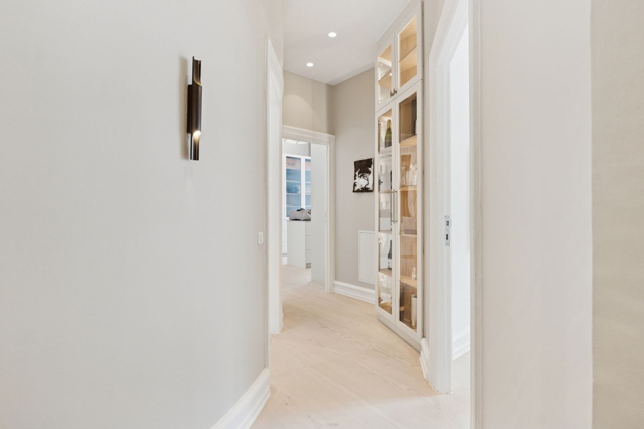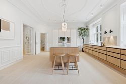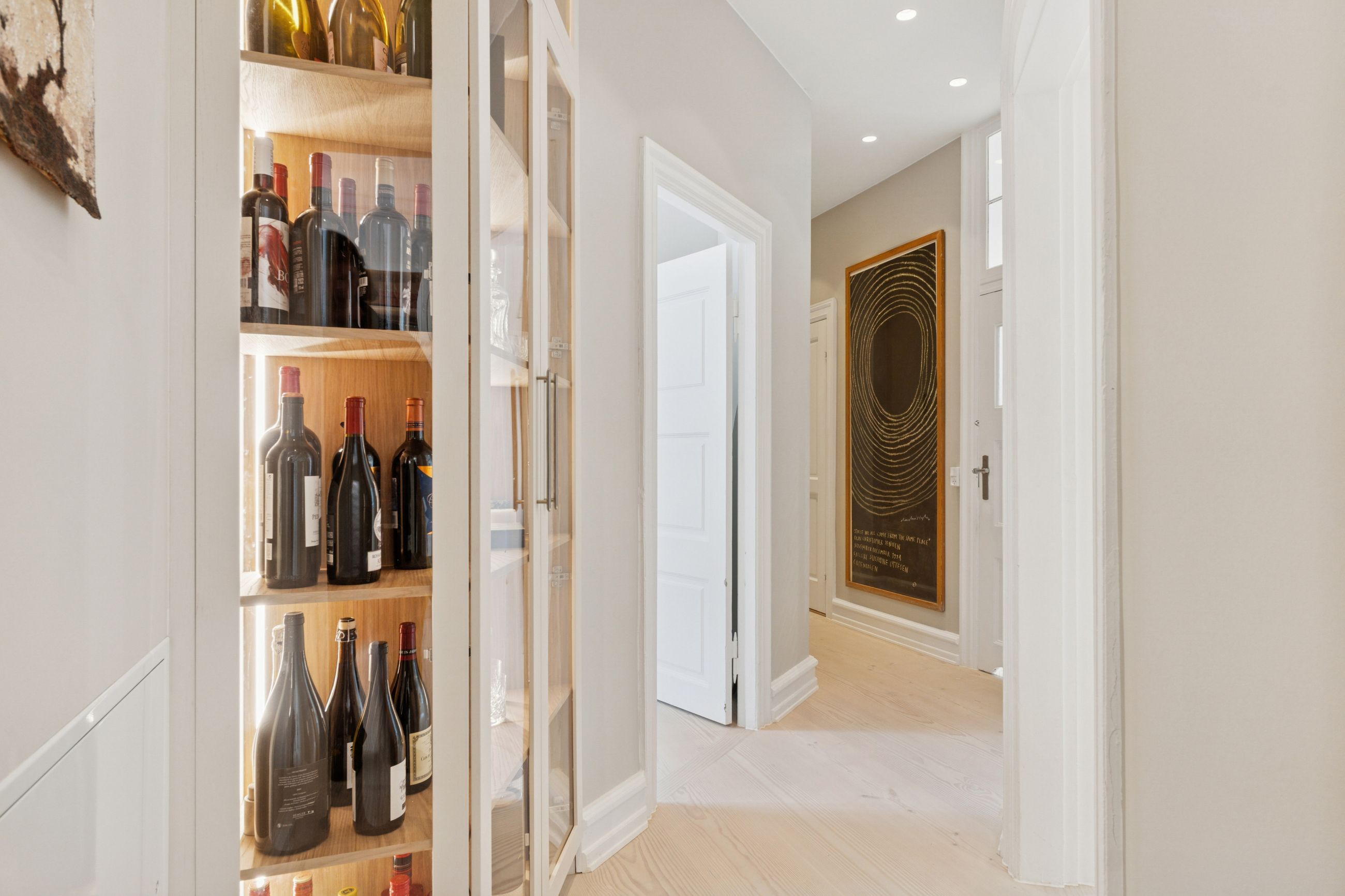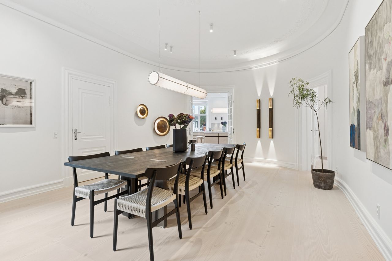 Højloftede rum med stuk og rosetter danner rammen om boligens lyse atmosfære, mens de brede nylagte Dinesen-gulve og de store vinduespartier fuldender den indbydende fornemmelse. På trods af stueplan opleves ingen klassiske gener - vinduerne ligger ca. tre meter over gadeniveau uden indkig, og der er ingen modstående bygninger i køkken- og stueområdet, blot udsigt til de flotte lyse ambassadeejendomme og den åbne himmel. Det giver et fantastisk naturligt lys hele dagen og aftensol i køkkenet på sommeraftener.