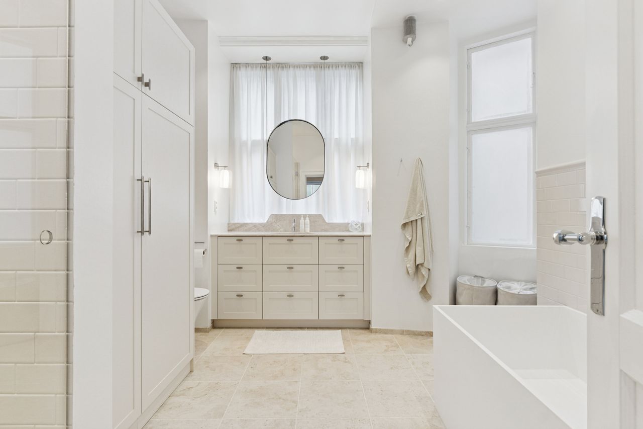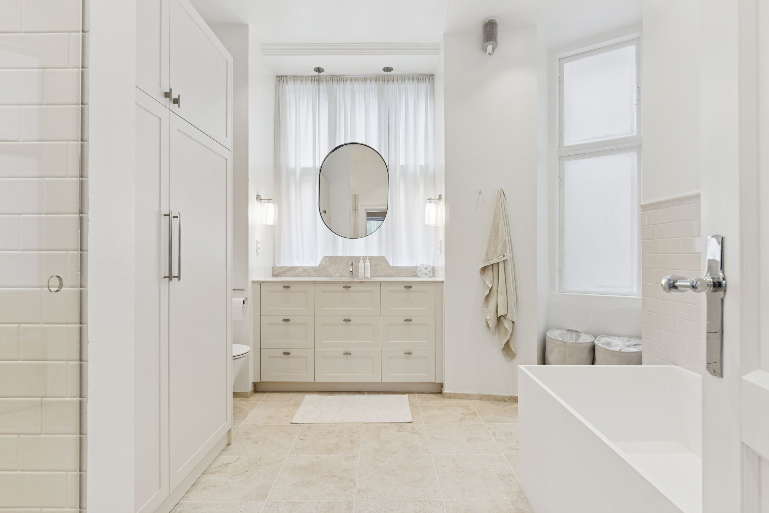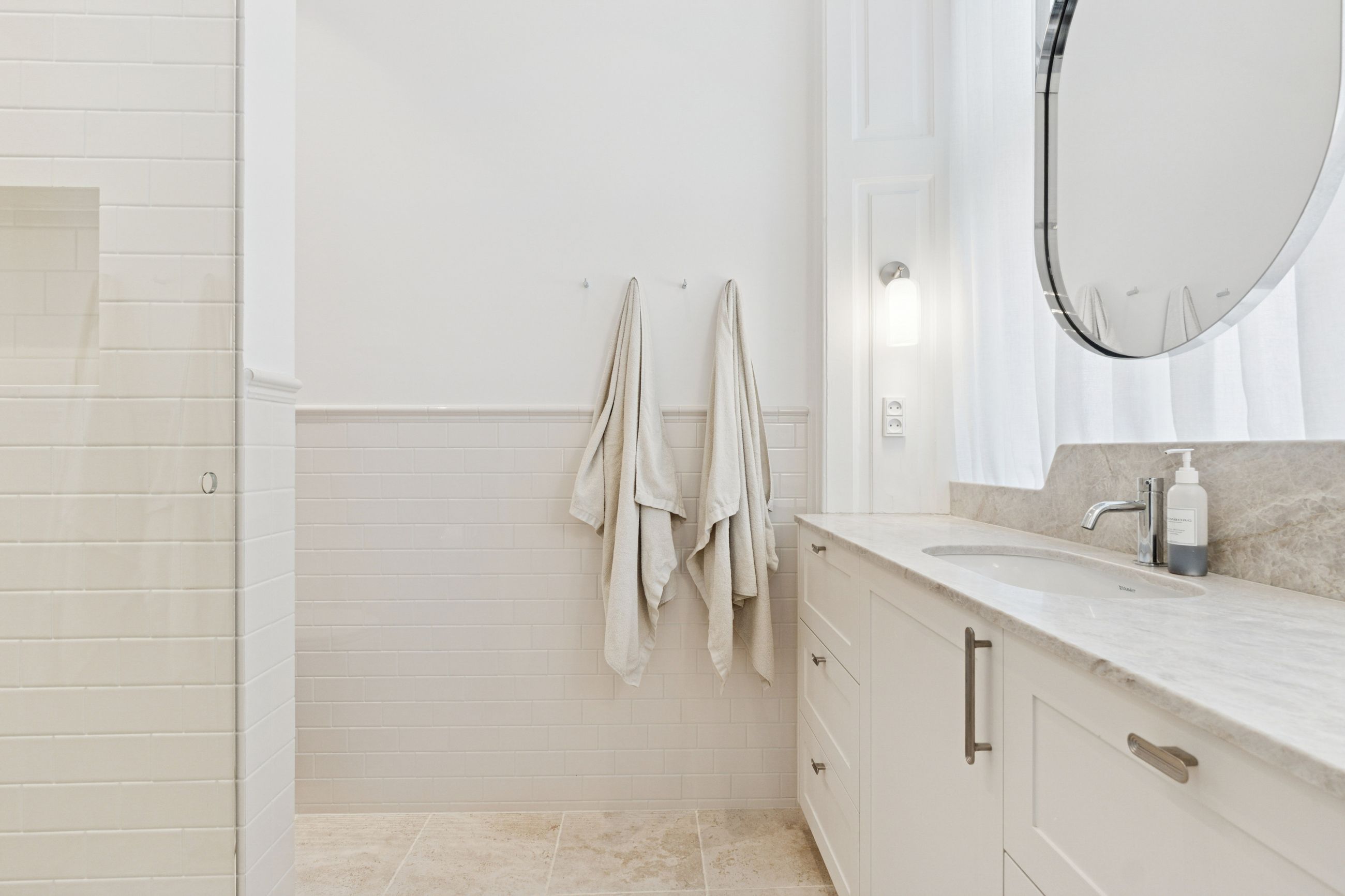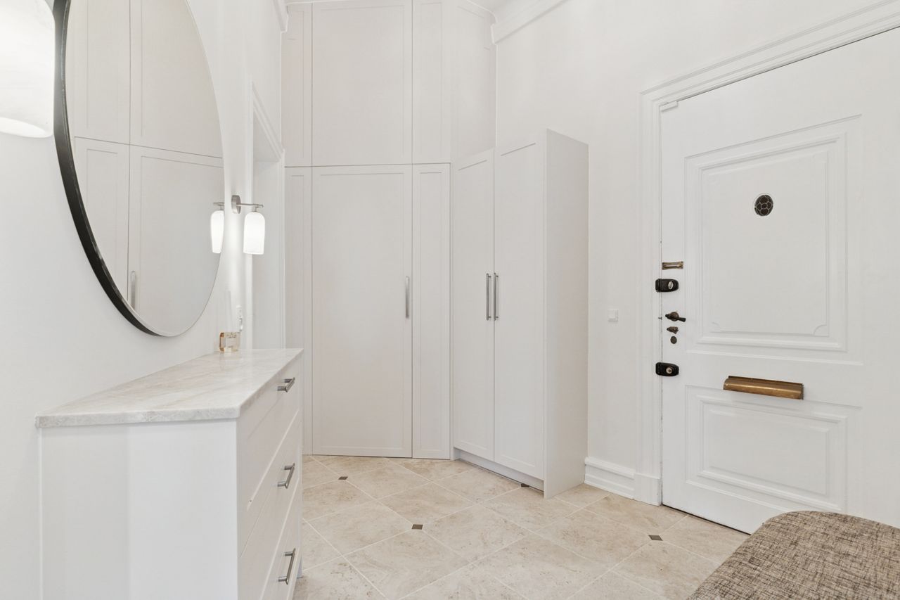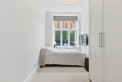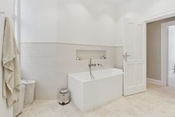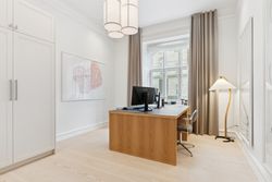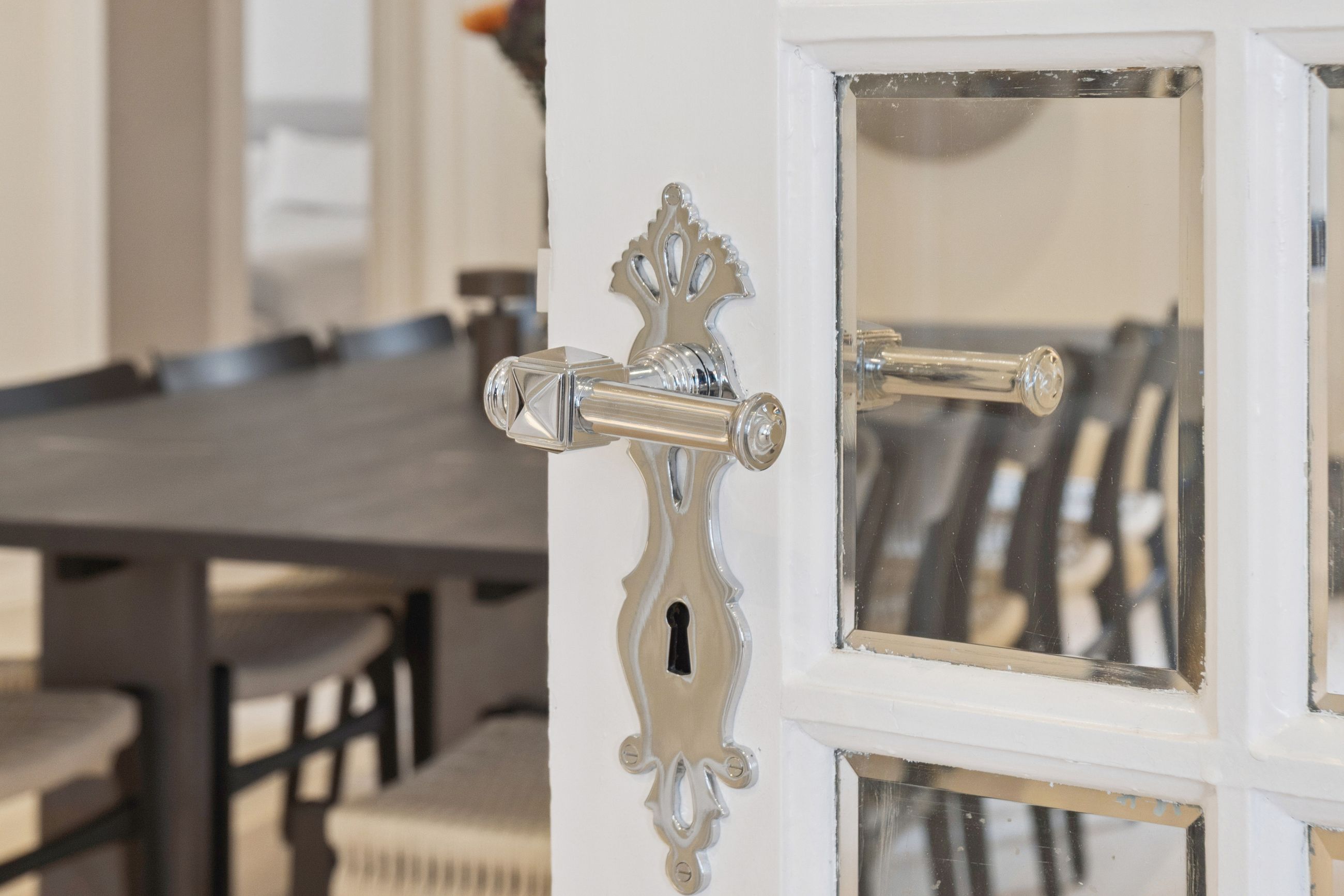 Højloftede rum med stuk og rosetter danner rammen om boligens lyse atmosfære, mens de brede nylagte Dinesen-gulve og de store vinduespartier fuldender den indbydende fornemmelse. På trods af stueplan opleves ingen klassiske gener - vinduerne ligger ca. tre meter over gadeniveau uden indkig, og der er ingen modstående bygninger i køkken- og stueområdet, blot udsigt til de flotte lyse ambassadeejendomme og den åbne himmel. Det giver et fantastisk naturligt lys hele dagen og aftensol i køkkenet på sommeraftener.