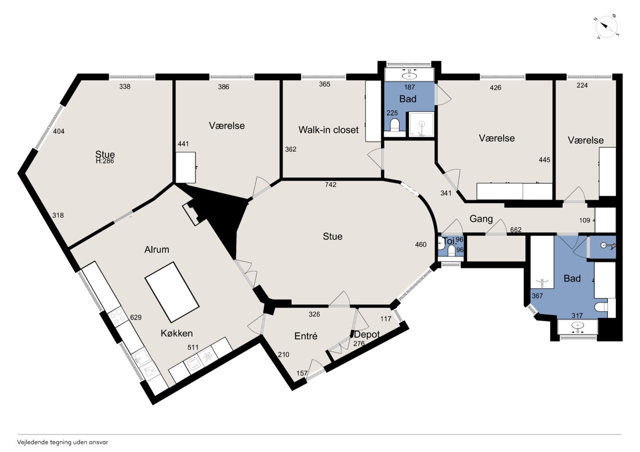 Boligens hjerte er køkken-alrummet med et flot snedkerkøkken og masser af plads til madlavningen og selskabelige stunder. Herfra er der adgang til to store stuer, der let indrettes som spise- og dagligstue. Planløsningen rummer desuden tre værelser og et walk-in-closet, der også snildt kan omdannes til et fjerde værelse. Hertil kommer to stilrene badeværelser, hvoraf det ene har både brus og kar, mens det andet er tilknyttet soveværelset som privat brusebadeværelse. Som det sidste er der et gæstetoilet samt et praktisk depotrum.