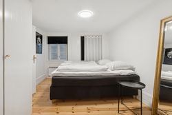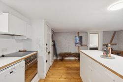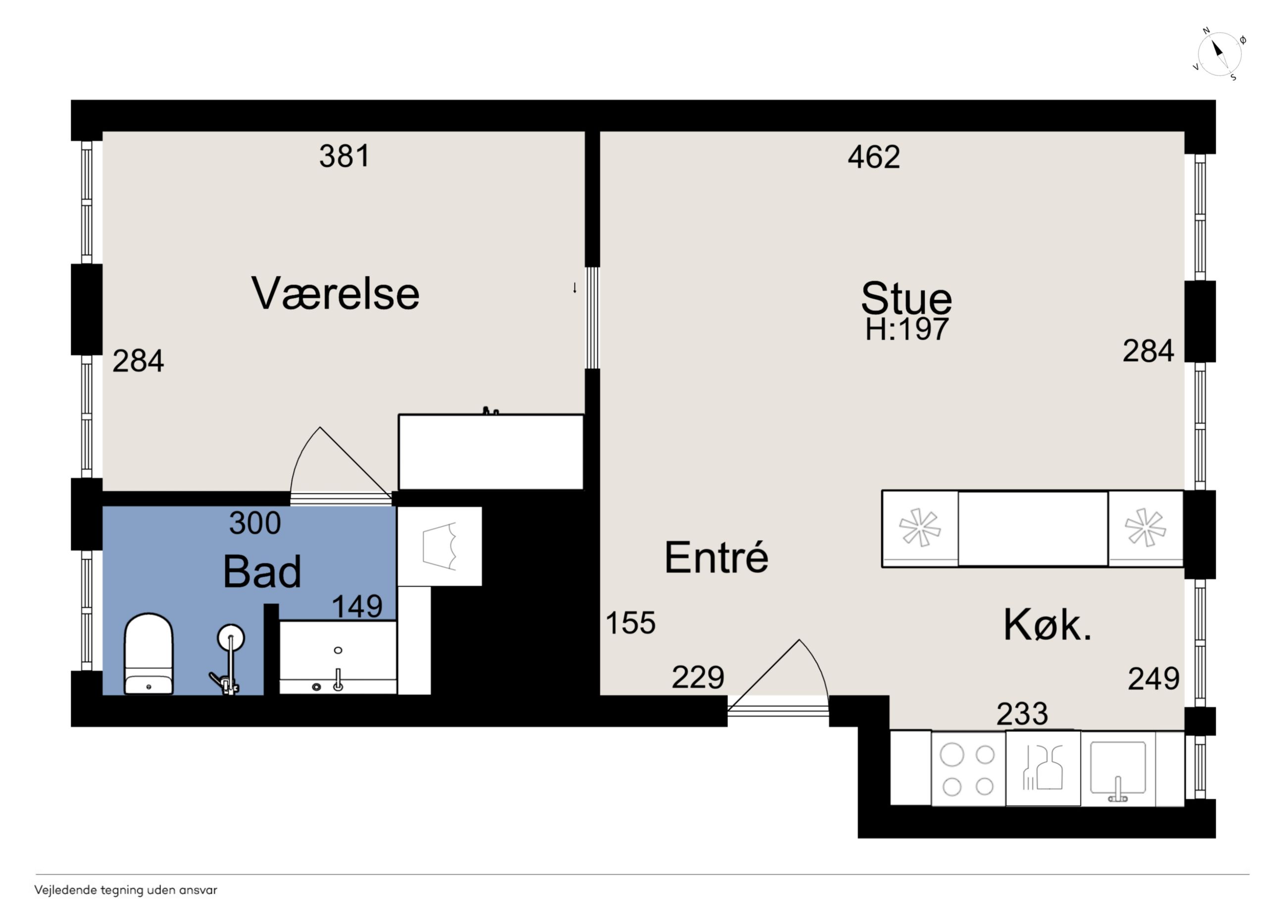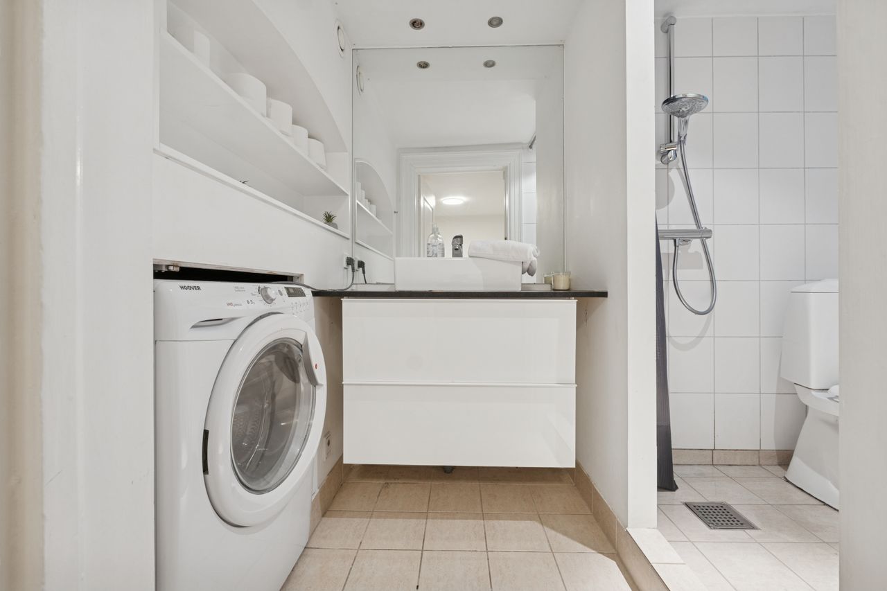 Hjemmet har et åbent opholdsmiljø med et klassisk køkken, hvor øen inviterer til samvær på tværs af aktiviteter, og stuen har plads til både spisebordet og sofaen. Videre venter værelset, som også har en fornuftig størrelse, og det er værd at bemærke det klassiske gulv, som løber gennem lejligheden. Til slut byder boligen på det nydelige badeværelse med brus og plads til vaskemaskinen.