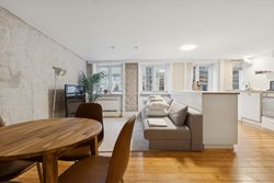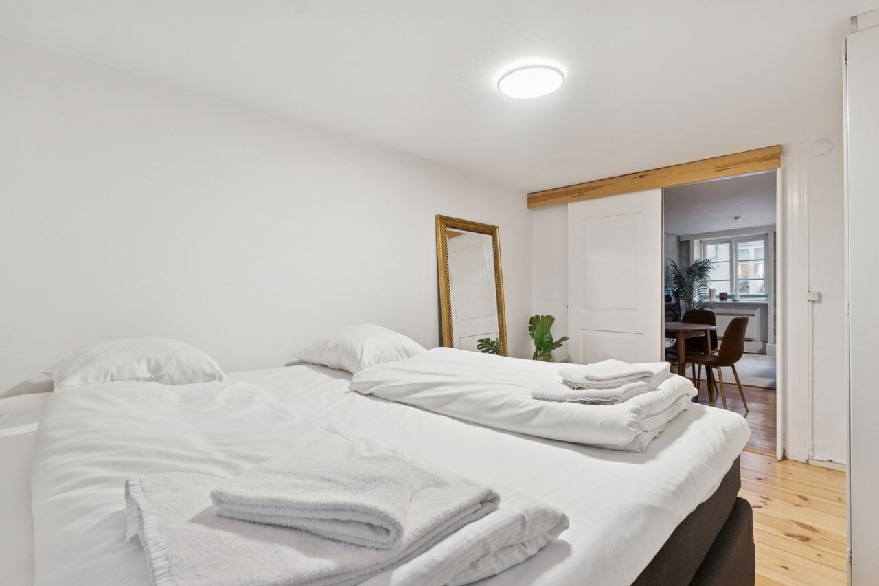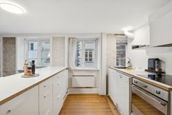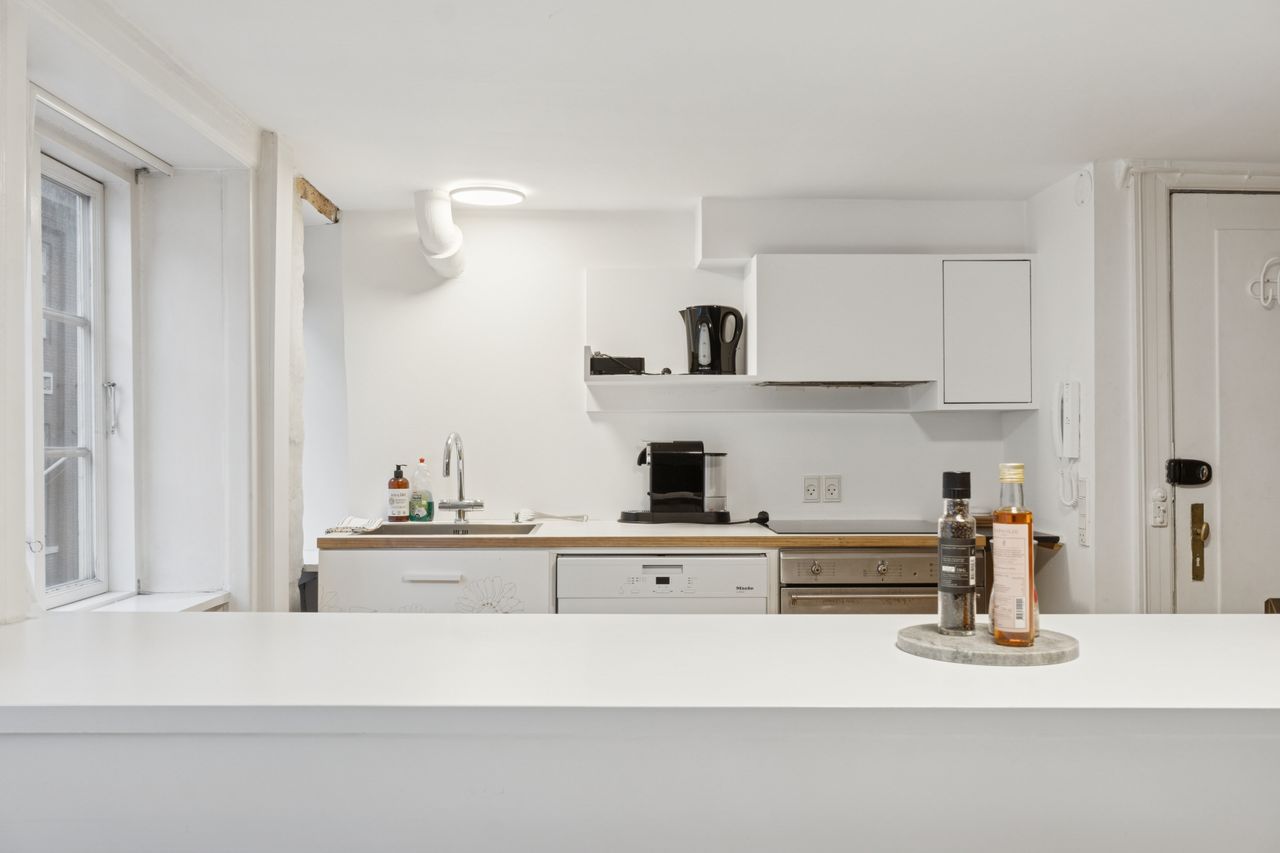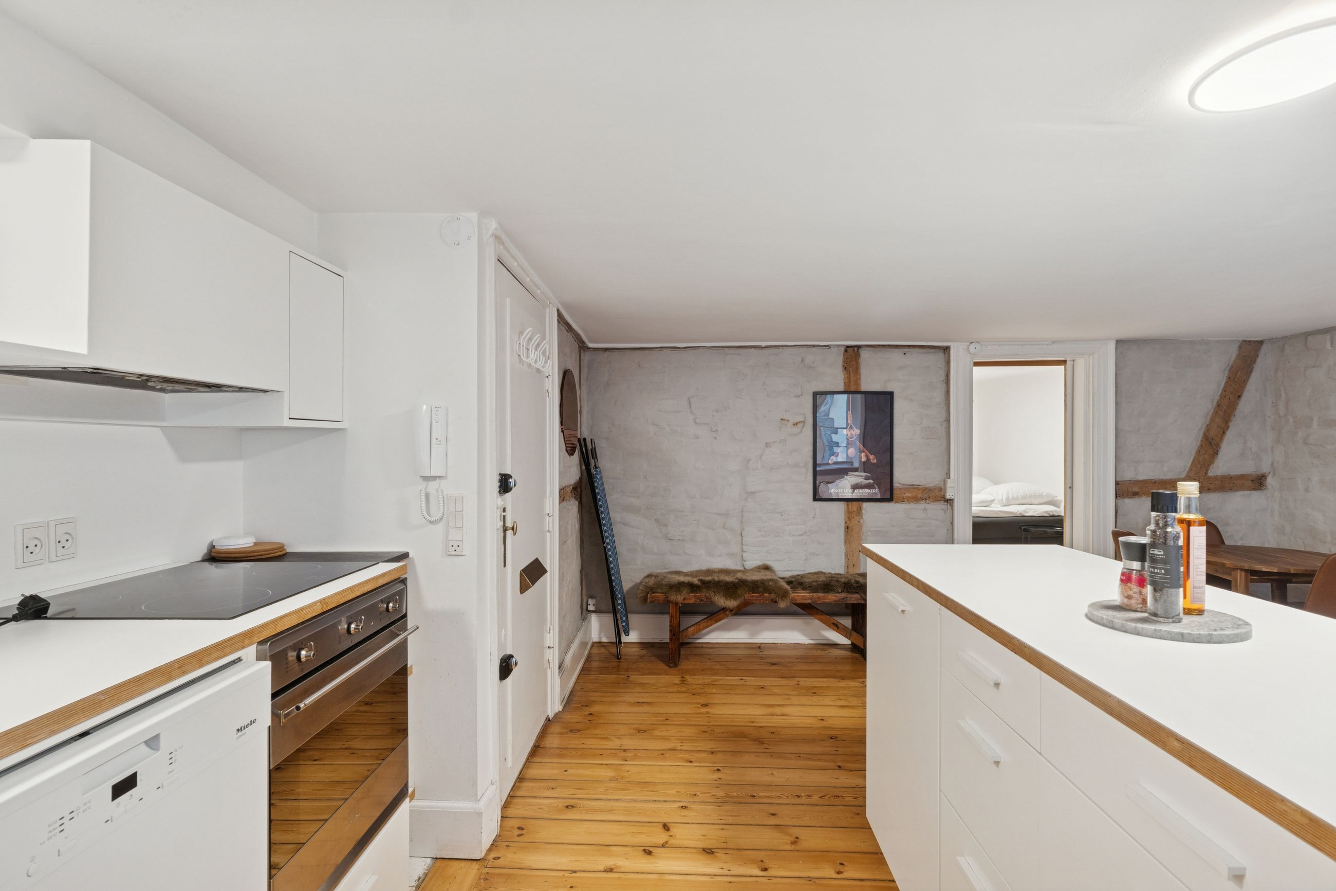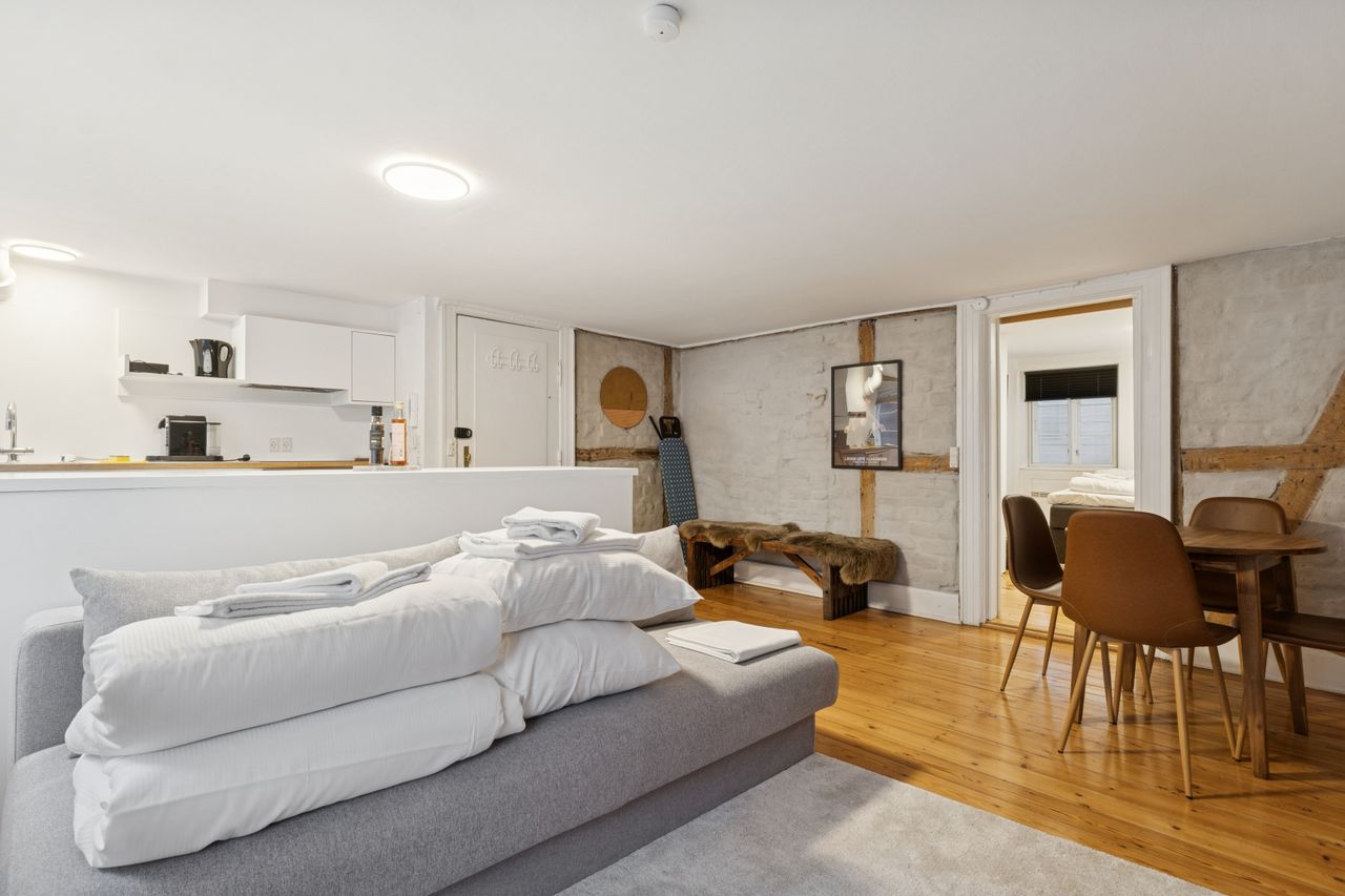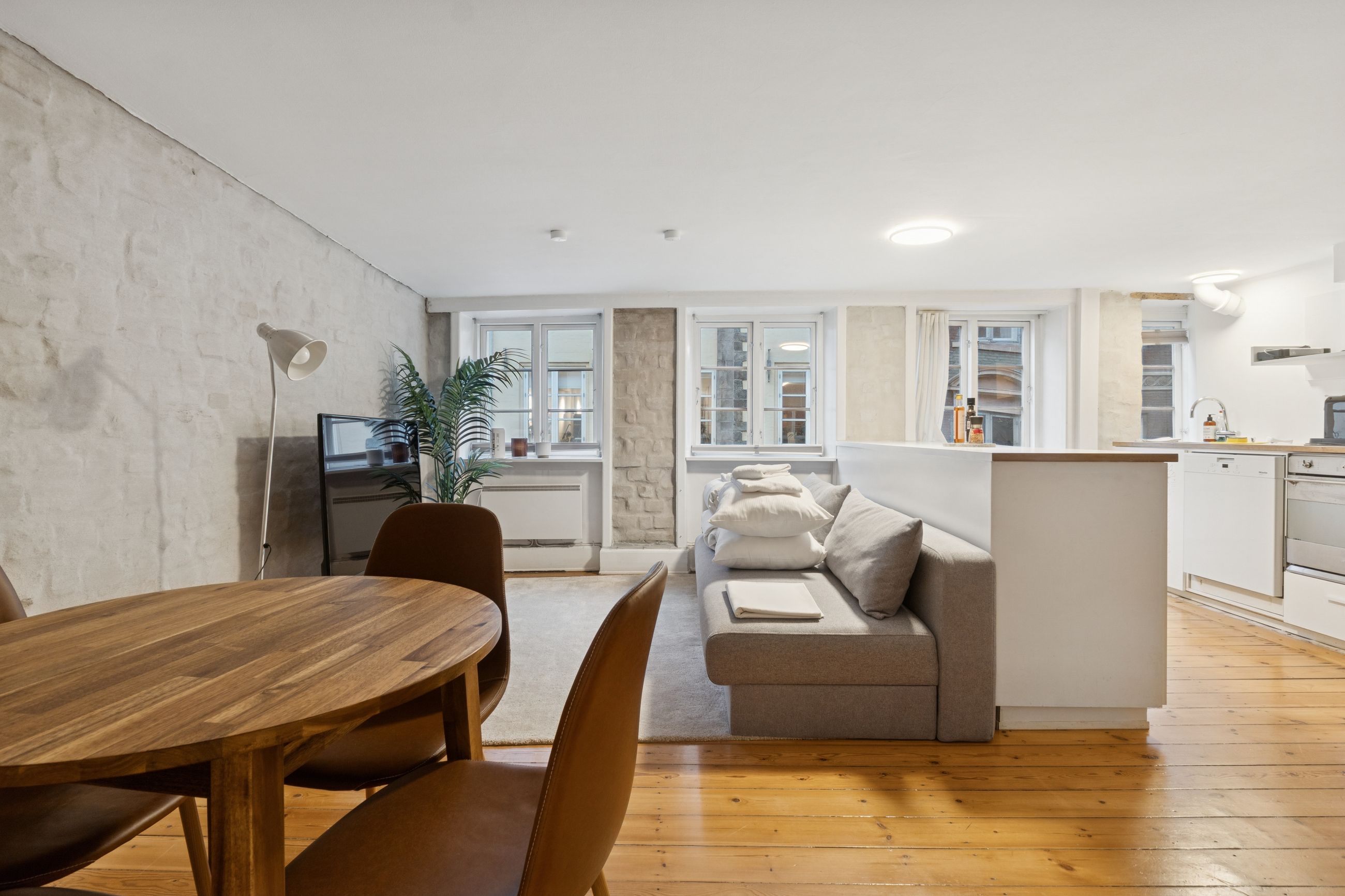 Beliggenheden bliver ikke meget mere central end for denne lejlighed, der har Nytorv og Rådhuspladsen lige rundt om hjørnet. Boligen er lys og velindrettet, og med det synlige bindingsværk er der charmerende referencer til byggeåret 1798, som vidner om, at ejendommen er en del af det historiske København.