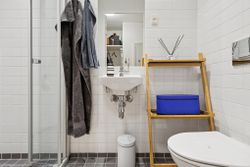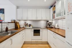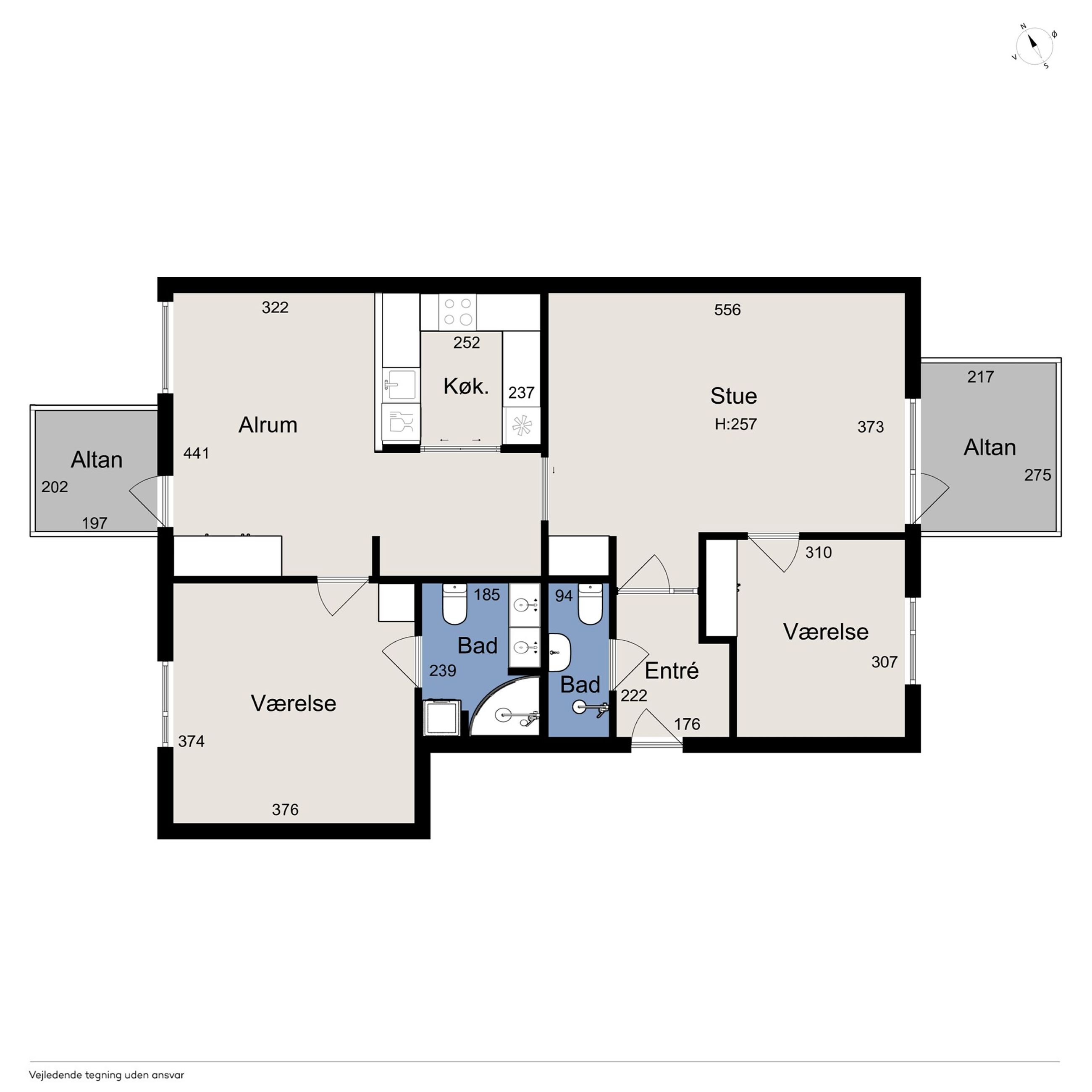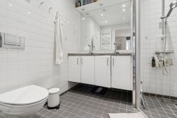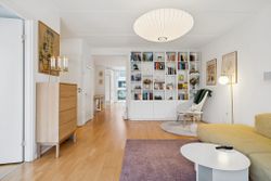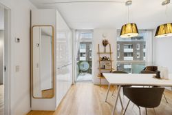 Lejligheden ligger på tredje sal i en nydelig ejendom fra 2006. Elevatoren sørger for nem og bekvem adgang, og inden døre er det stuen og køkken-alrummet, der løber med opmærksomheden. I sidstnævnte ses et pænt og enkelt køkken med hvide fronter, og i alrumsafdelingen såvel som i stuesektionen vil I især bide mærke i den måde, som lyset strømmer ind gennem vinduerne. De to værelser ligger i hver ende af boligen. Det største har tilknyttet et badeværelse, og endnu et badeværelse er at finde ved entréen.
