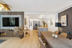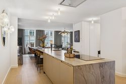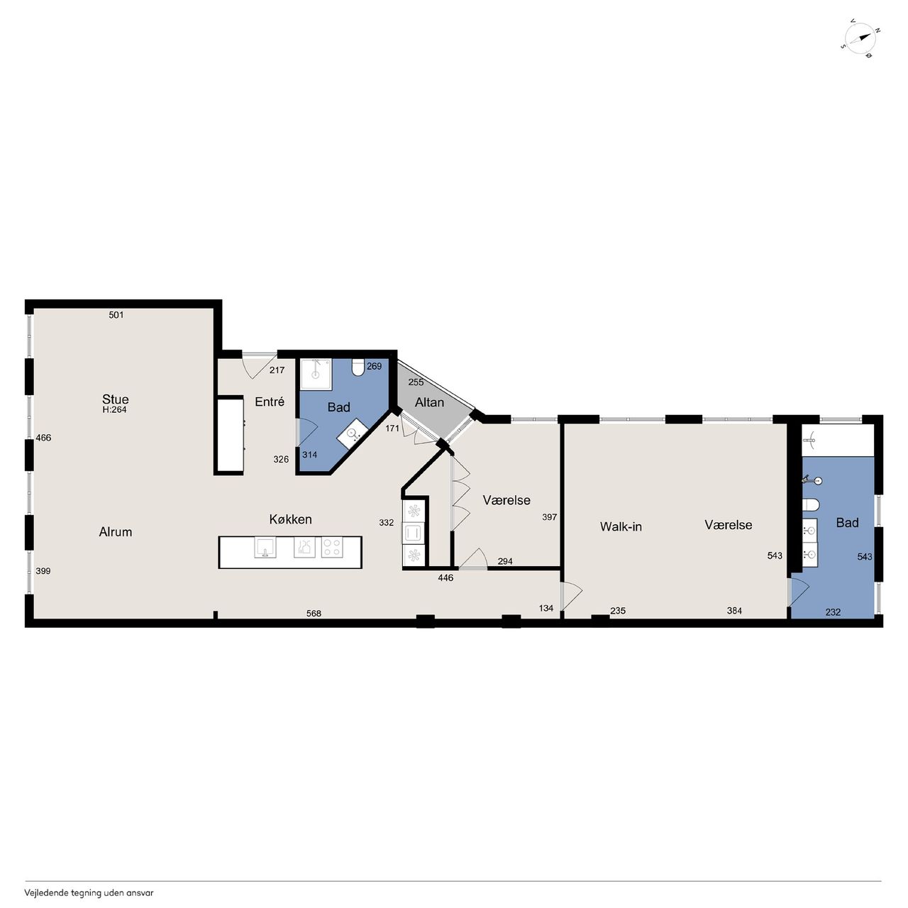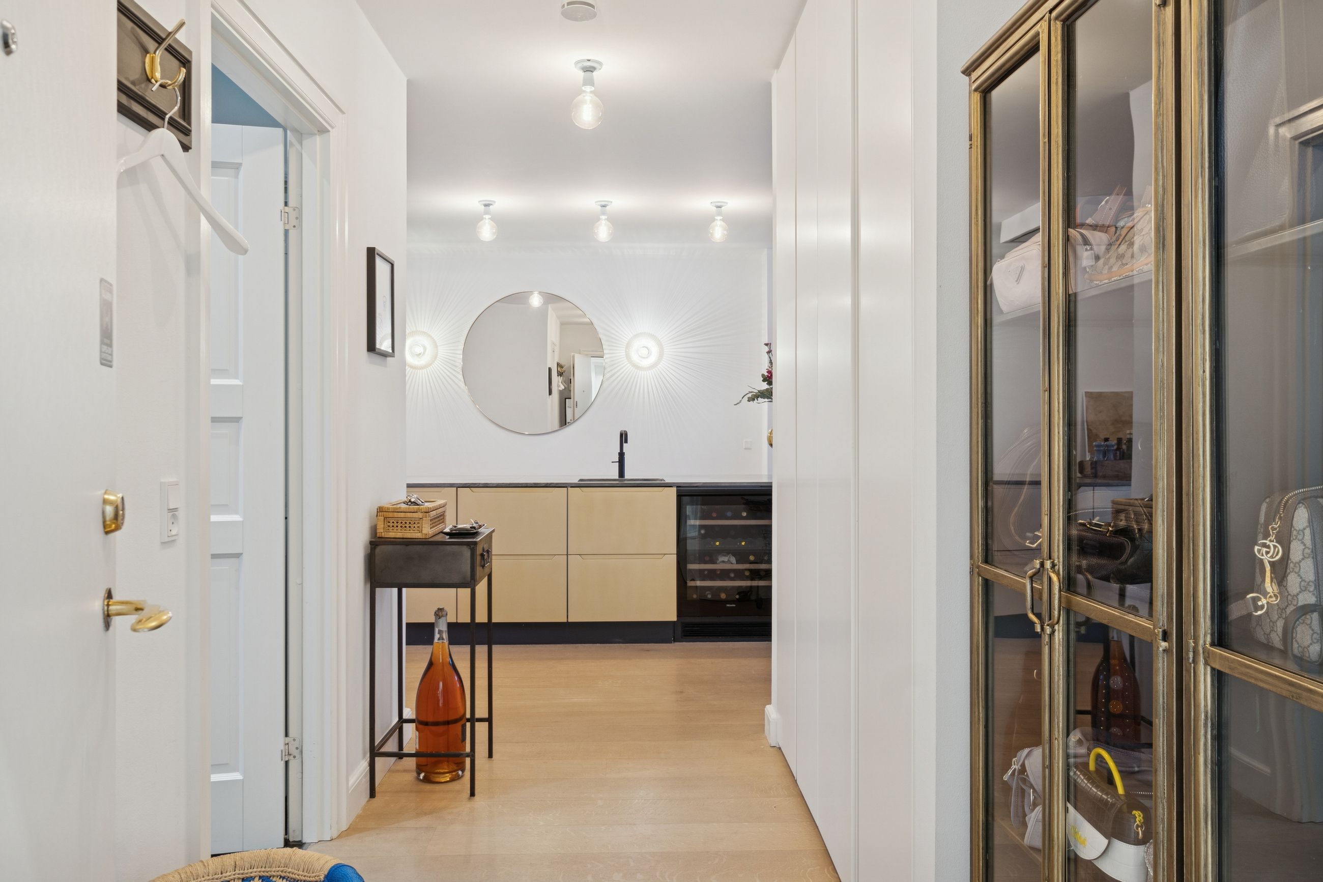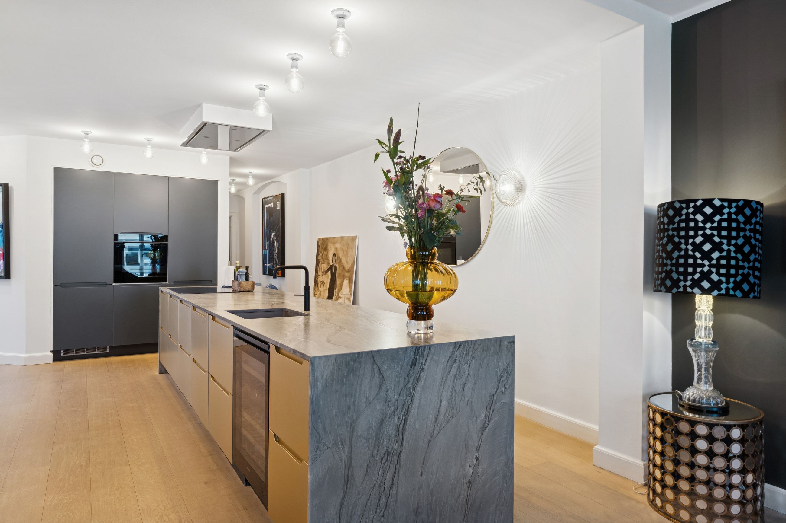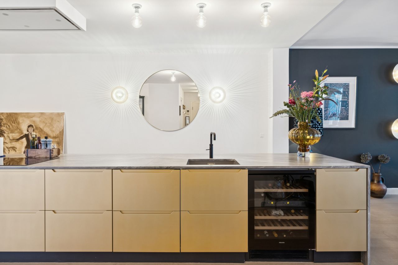 Lejlighedens køkken, alrum og stue ligger i åben forlængelse af hinanden og danner et naturligt samlingspunkt både til hverdag og ved gæstetid. Køkkenet er indrettet med en stor køkkenø med plads til barstole og samvær samt et vinkøleskab og rigelig opbevaring. Herfra er der udgang til en altan med kig til gårdhaven – et oplagt sted til morgenkaffen eller en pause midt på dagen.