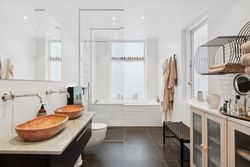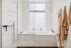 Boligen rummer ydermere to værelser og to badeværelser. Det ene værelse er indrettet som en regulær mastersuite med stort walk-in-closet og eget badeværelse med separat bruseniche, badekar, dobbeltvask og god opbevaringsplads. Derudover findes endnu et badeværelse samt en rummelig entré, der skaber en praktisk og indbydende ankomst. Lejligheden er istandsat med øje for livsnyderen, der ser sætter pris på detaljen.