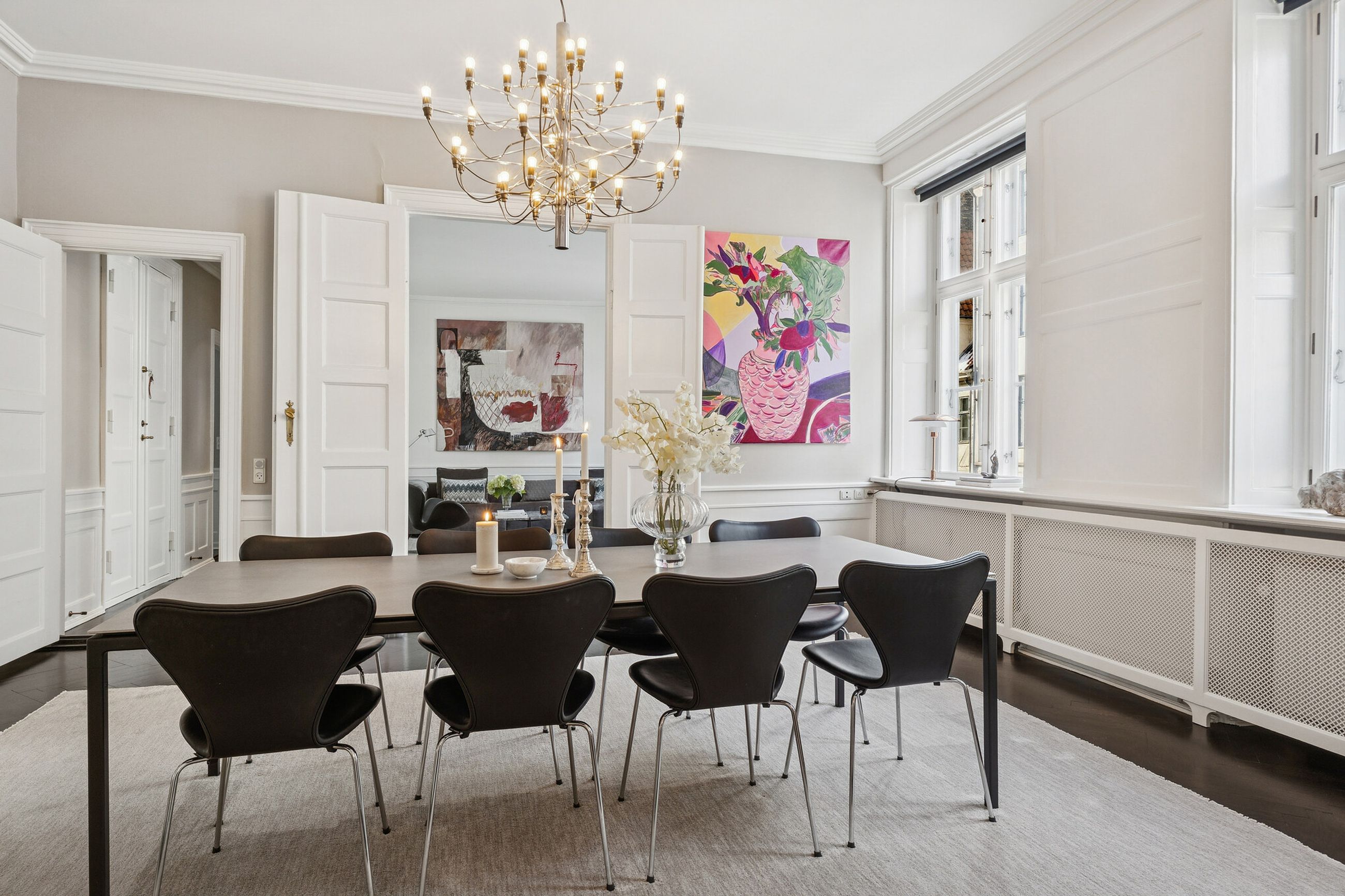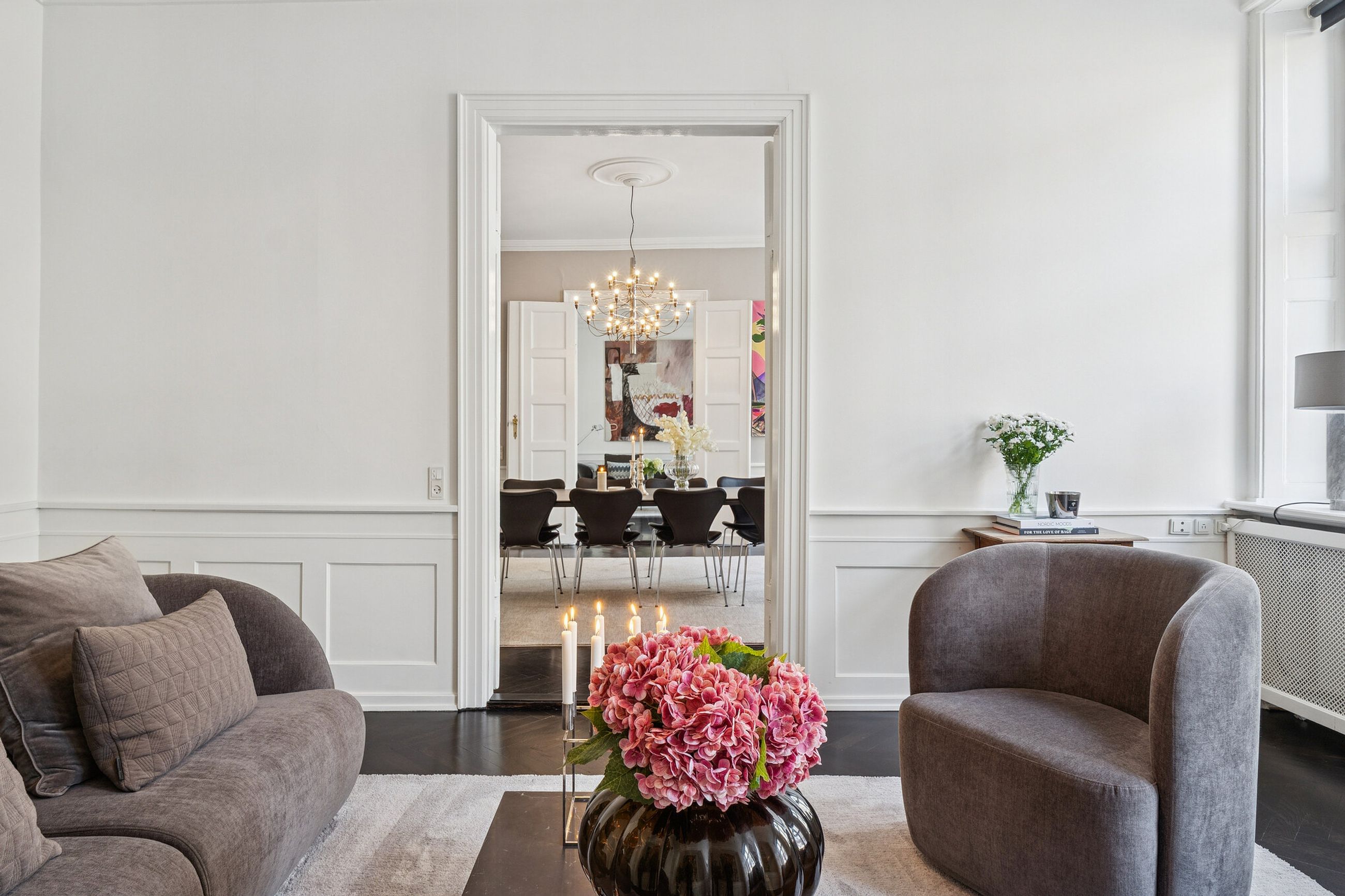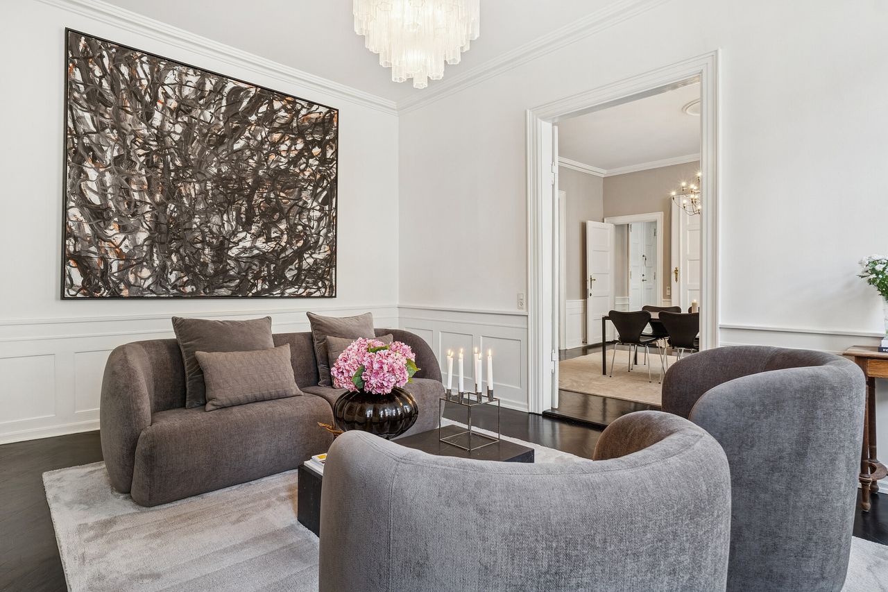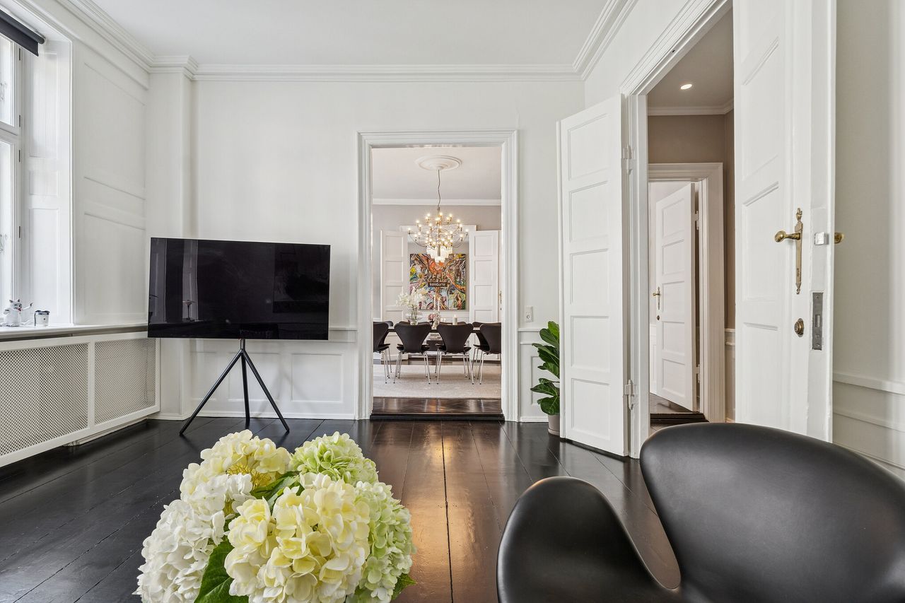 Allerede ved første skridt indenfor fornemmes formatet. Tre imponerende stuer en suite ligger på rad og række og byder op til både selskabelighed og stilfuld hverdag.