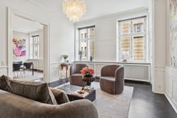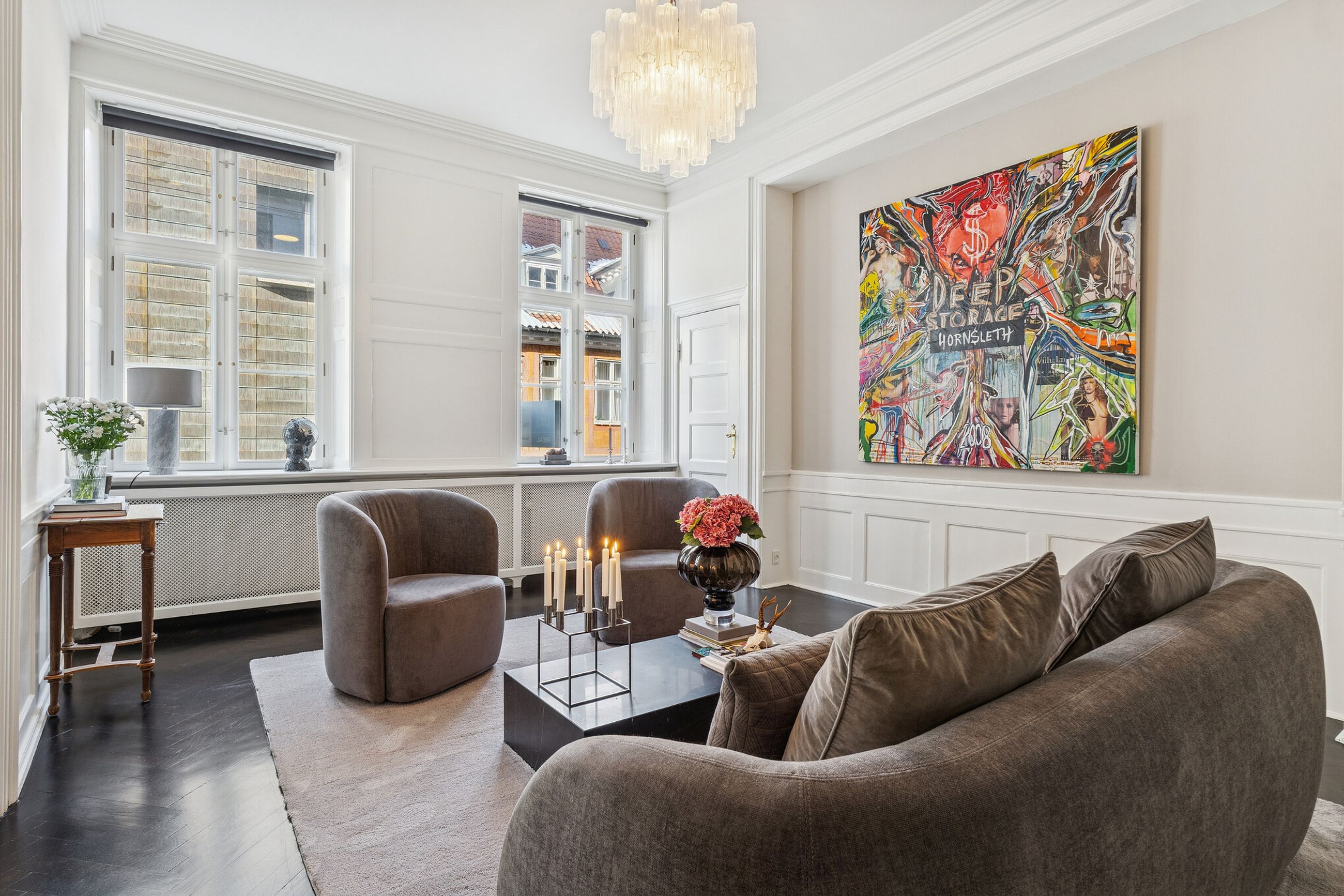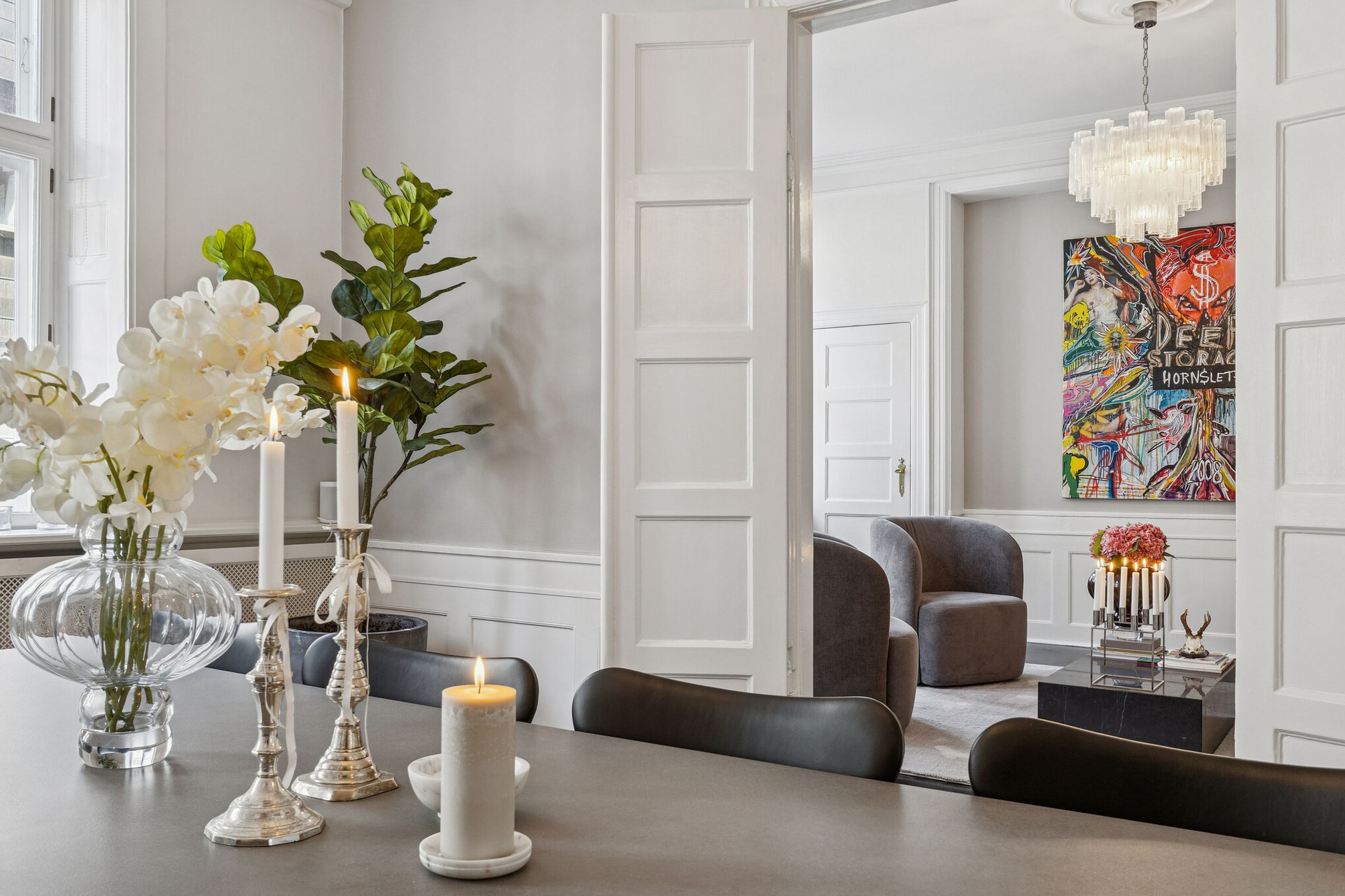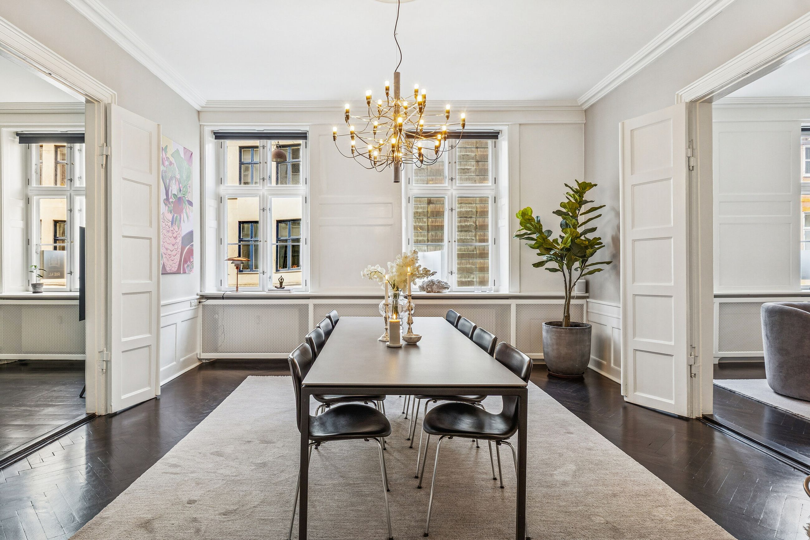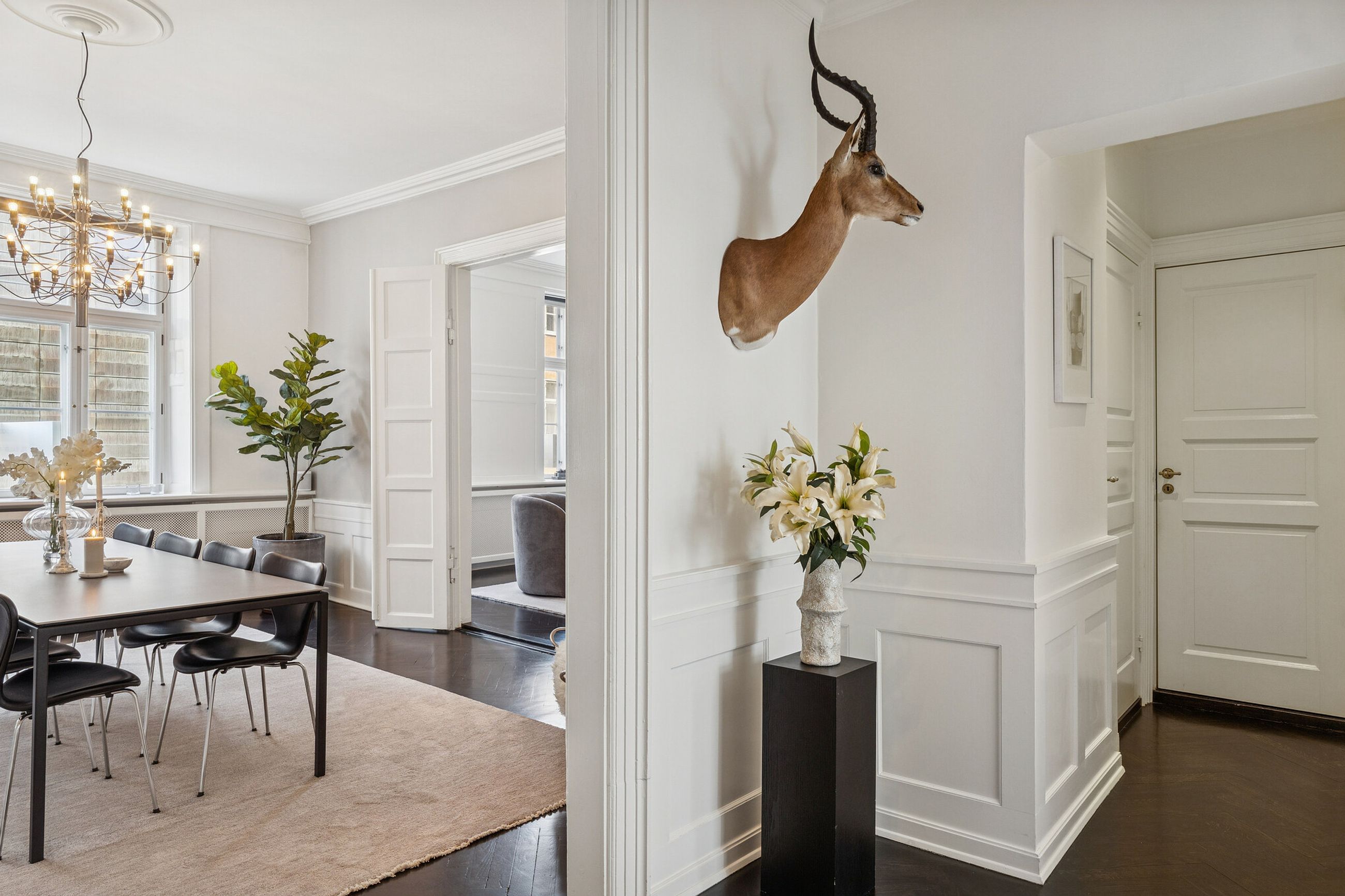 Allerede ved første skridt indenfor fornemmes formatet. Tre imponerende stuer en suite ligger på rad og række og byder op til både selskabelighed og stilfuld hverdag.