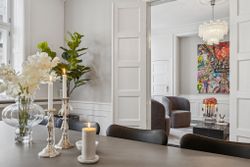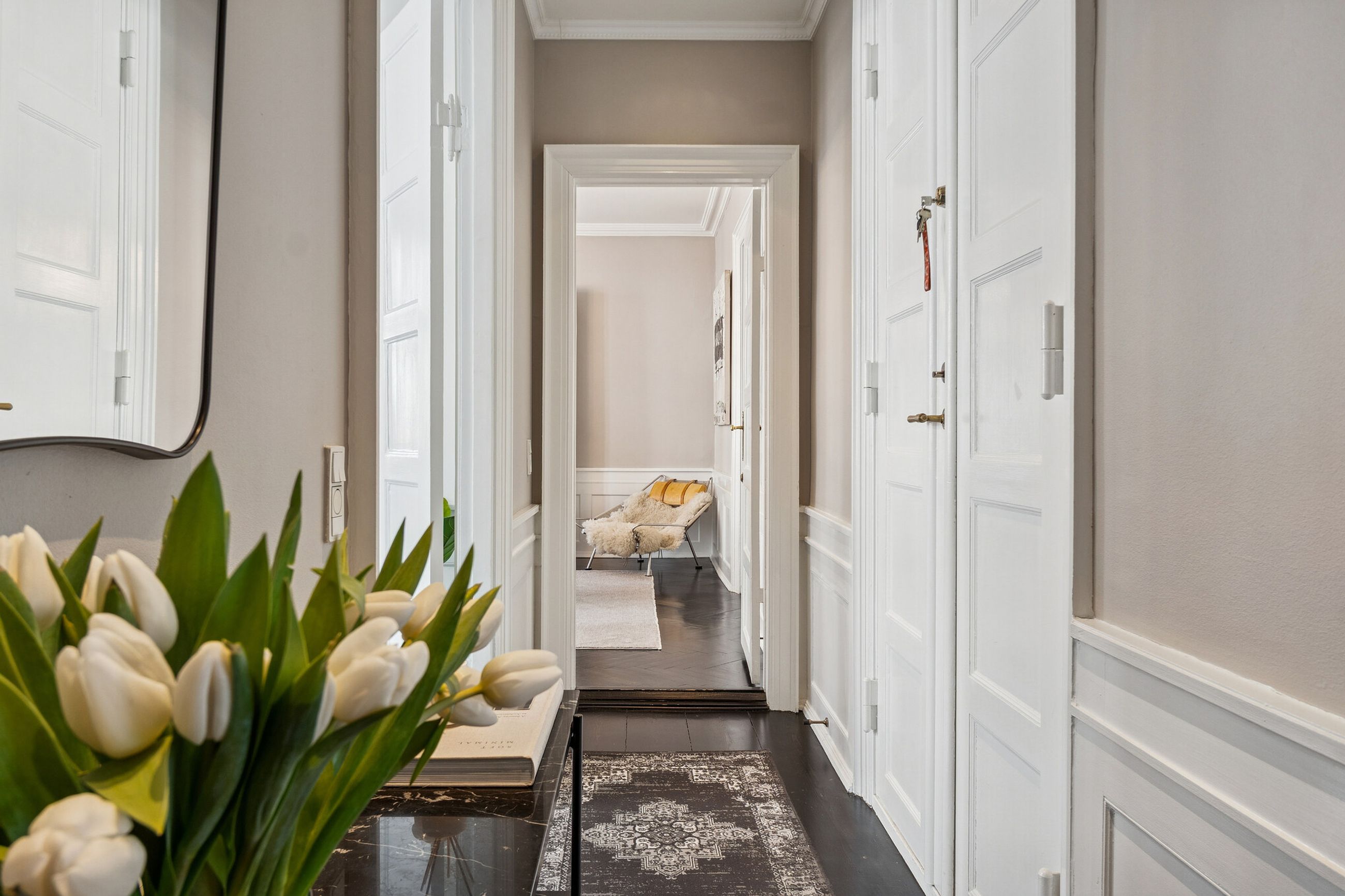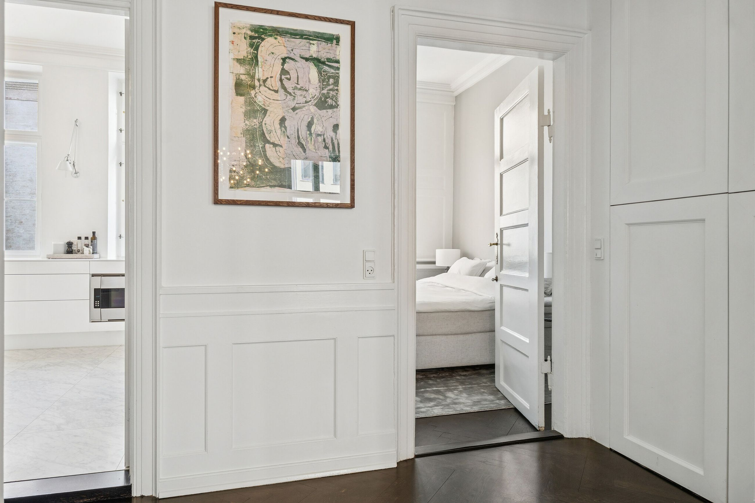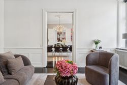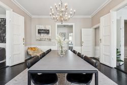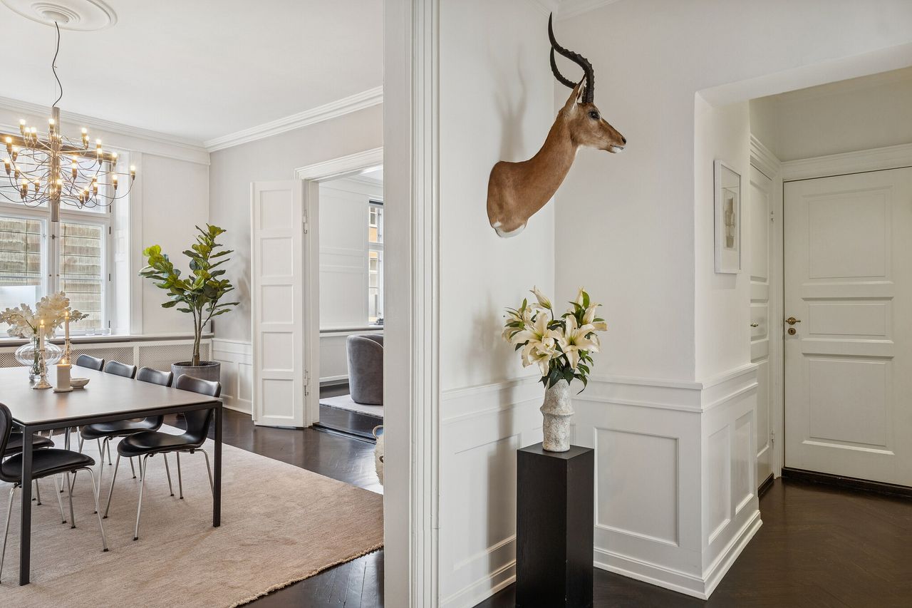 Lyset bevæger sig elegant gennem rummene og fremhæver de klassiske detaljer: høje paneler, stukarbejde, fyldnings- og fløjdøre med originale greb samt brede plankegulve og sildebensparket. Loftshøjden er gavmild, proportionerne harmoniske, og atmosfæren både historisk og tidløs.