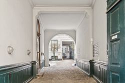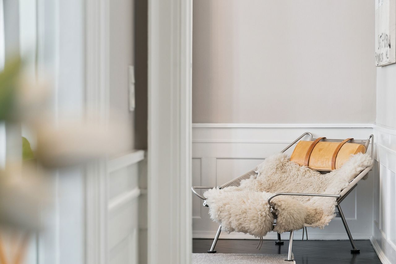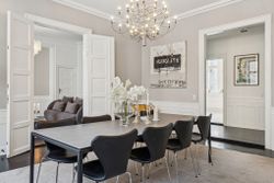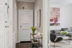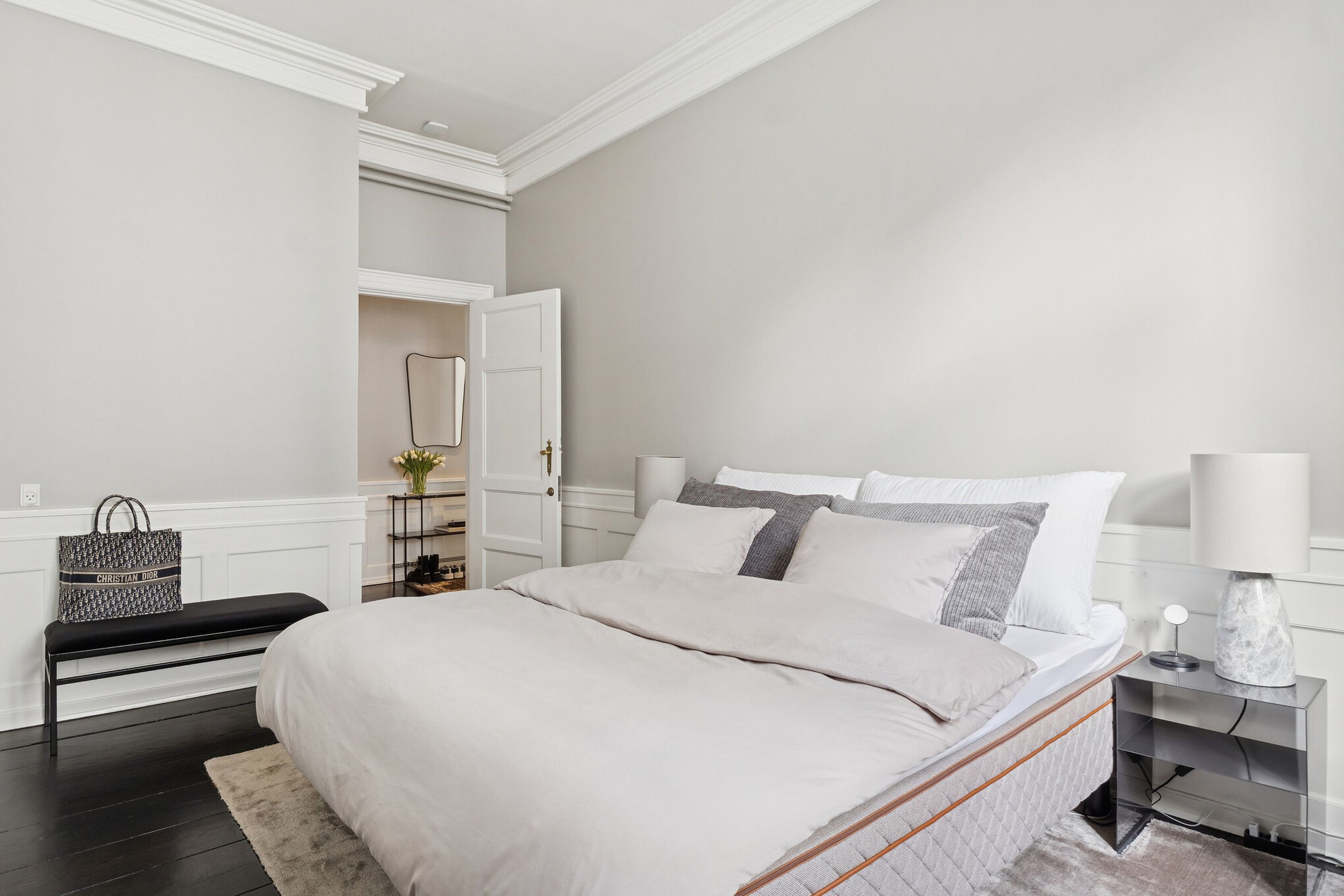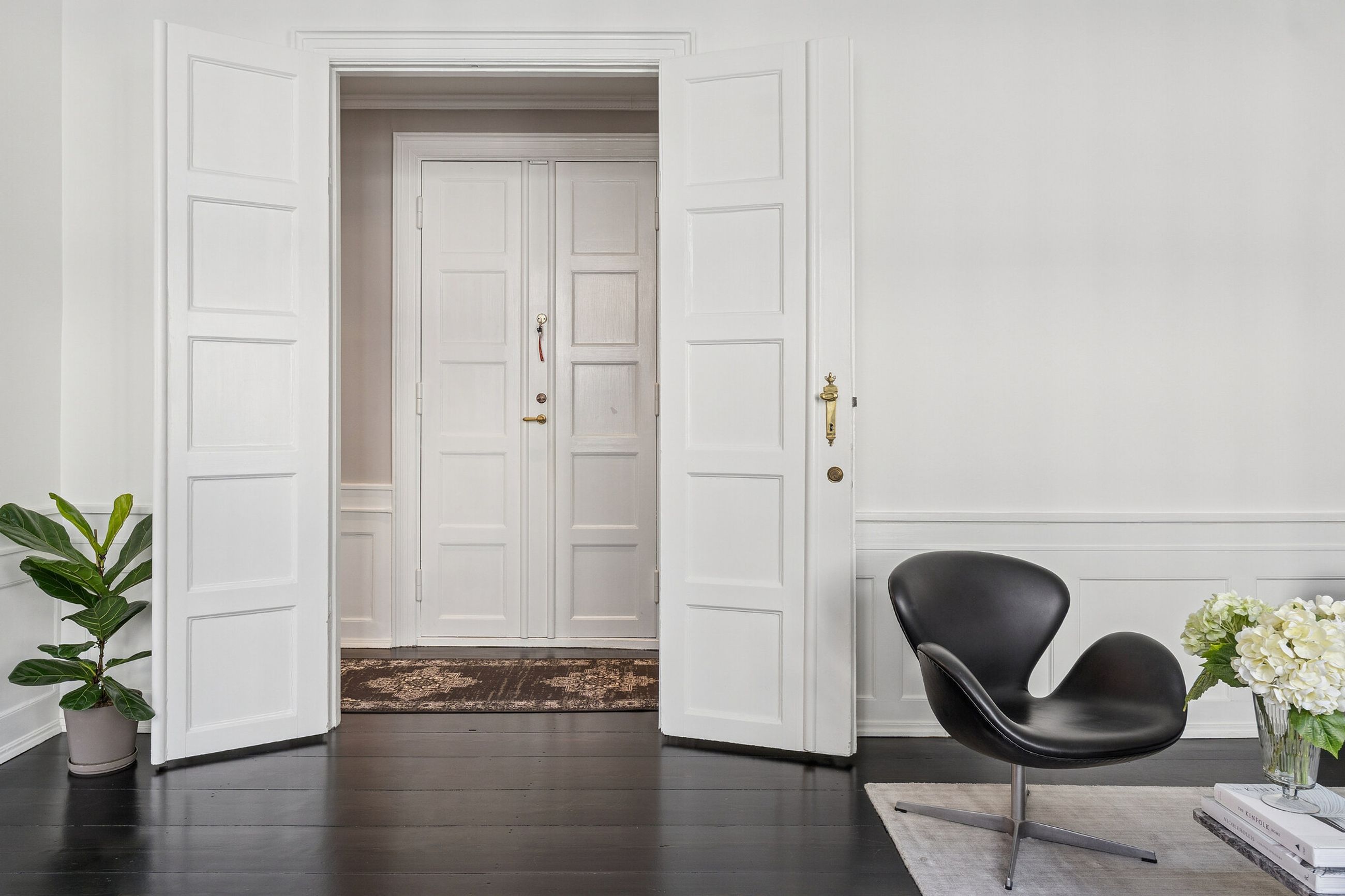 Lyset bevæger sig elegant gennem rummene og fremhæver de klassiske detaljer: høje paneler, stukarbejde, fyldnings- og fløjdøre med originale greb samt brede plankegulve og sildebensparket. Loftshøjden er gavmild, proportionerne harmoniske, og atmosfæren både historisk og tidløs.