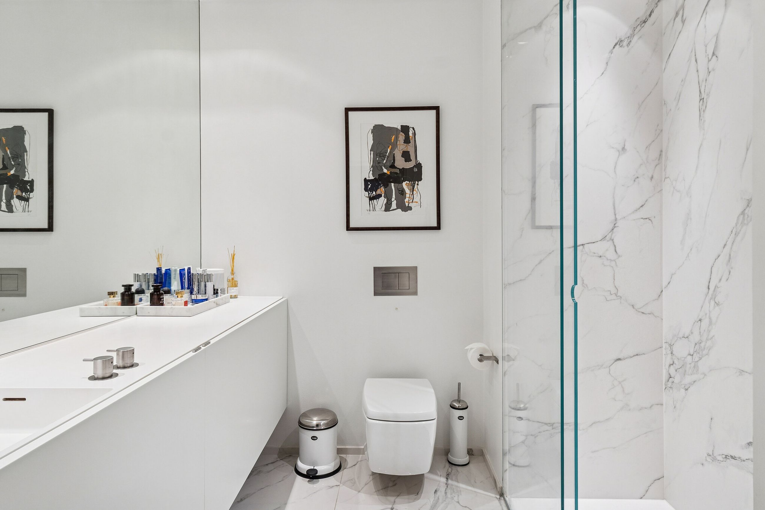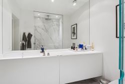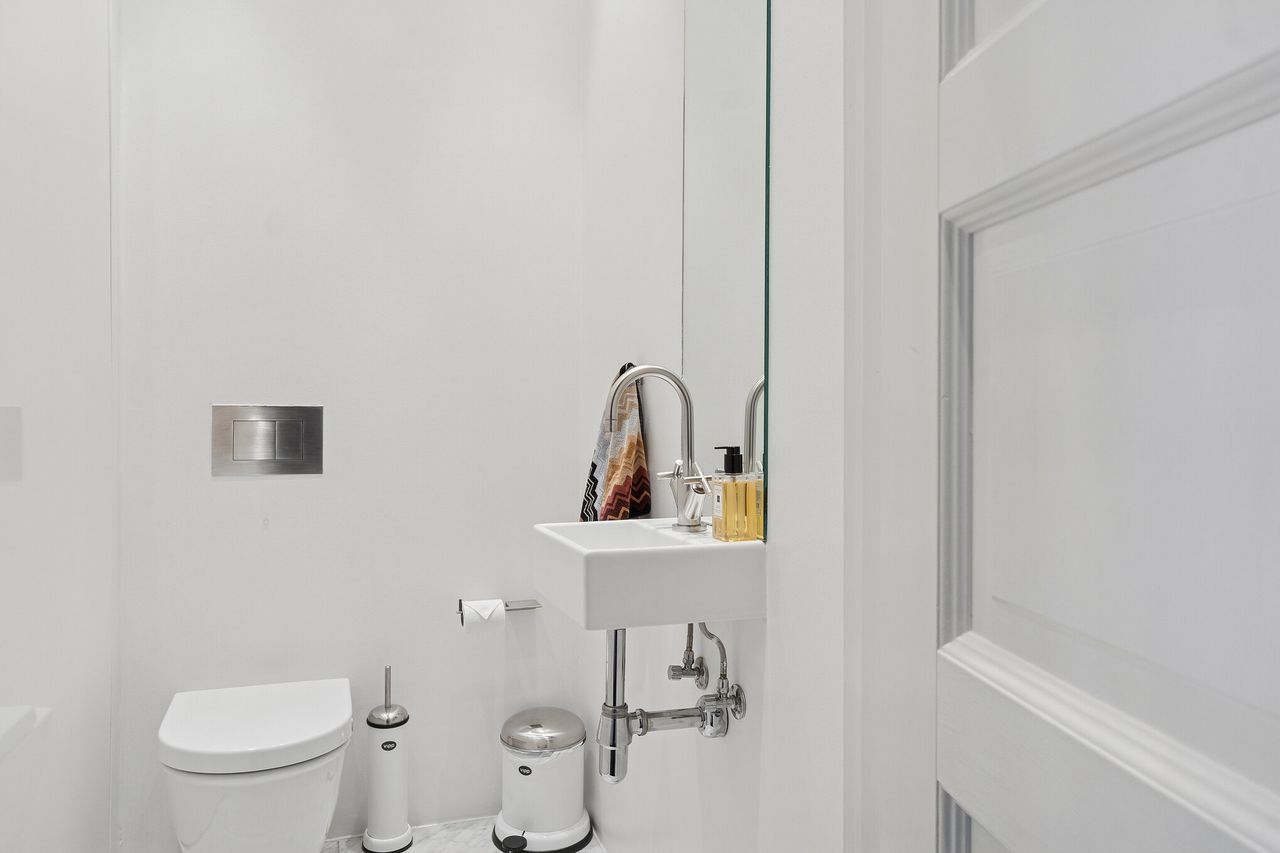 Boligen rummer et stort badeværelse udført med luksuriøse detaljer og eksklusive materialer, hvor æstetik og komfort går op i en højere enhed. Hertil kommer et pænt og indbydende gæstetoilet – en væsentlig kvalitet i en herskabslejlighed, hvor både hverdag og gæstebud skal fungere ubesværet.