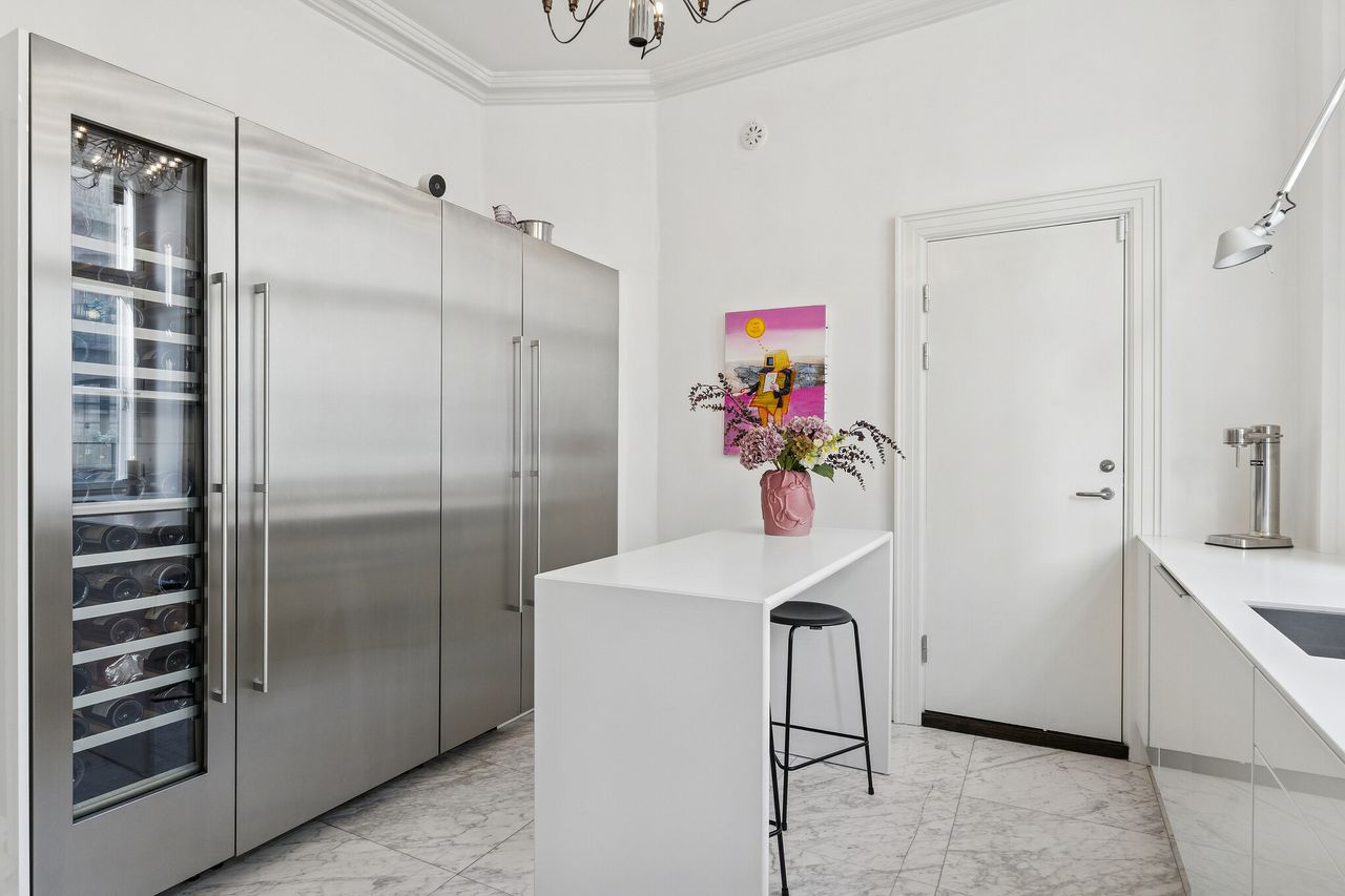 Samtalekøkkenet er fuldt udstyret med eksklusive elementer og Gaggenau-hvidevarer, der danner rammen om både hverdagsmåltider og gastronomiske ambitioner.