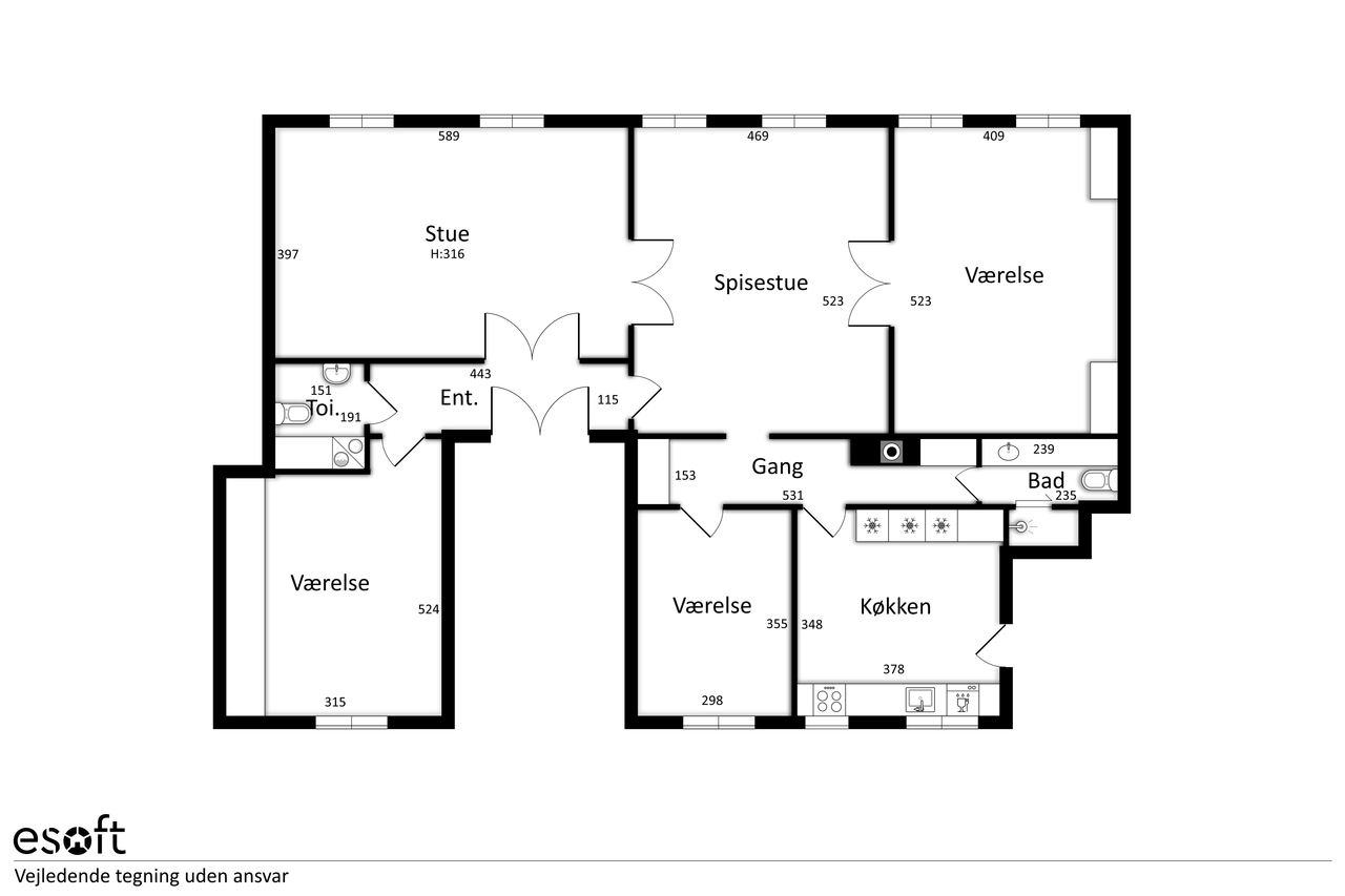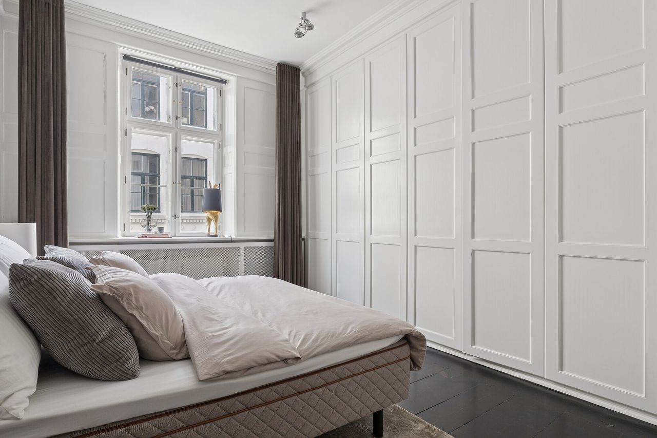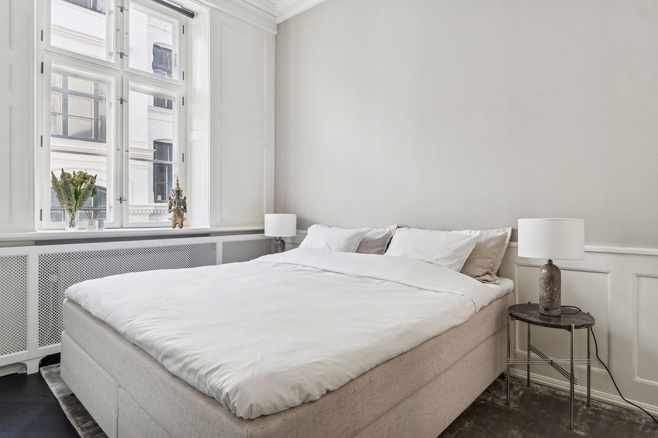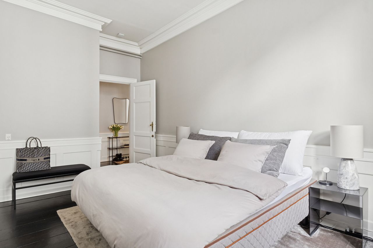 Boligens 184 kvadratmeter er disponeret med en gennemtænkt planløsning, hvor repræsentative opholdsrum balanceres af private gemakker. To store soveværelser – heraf det ene med fuld skabsvæg – skaber ro og komfort, mens radiatorskjulere elegant binder hjemmet sammen som en gennemgående detalje.