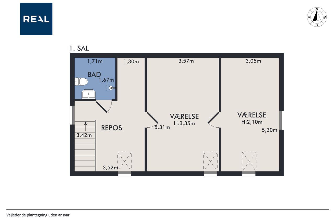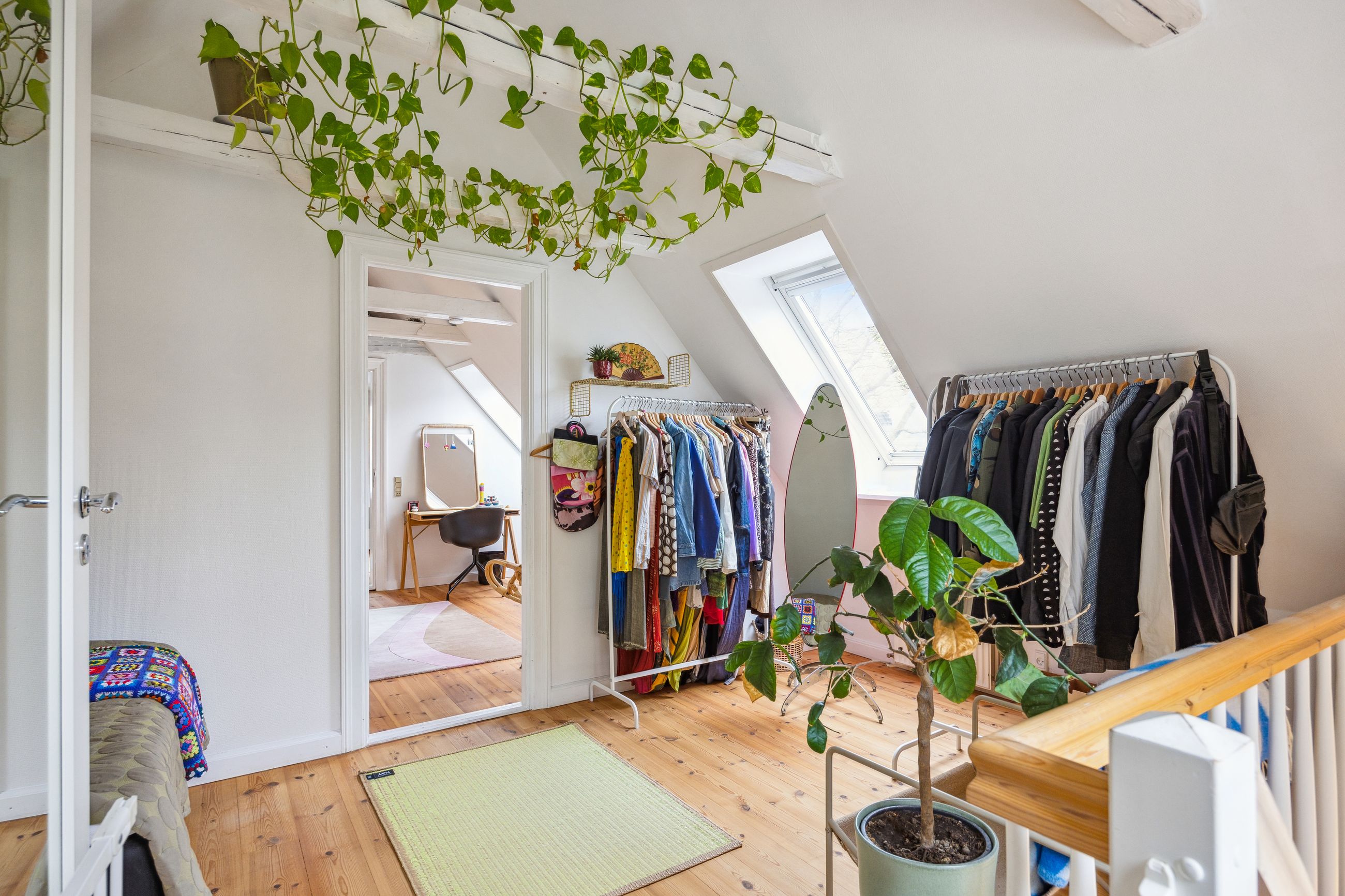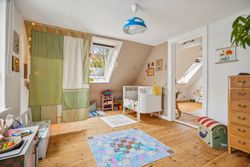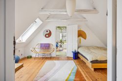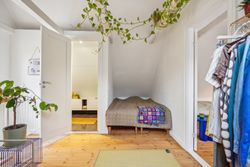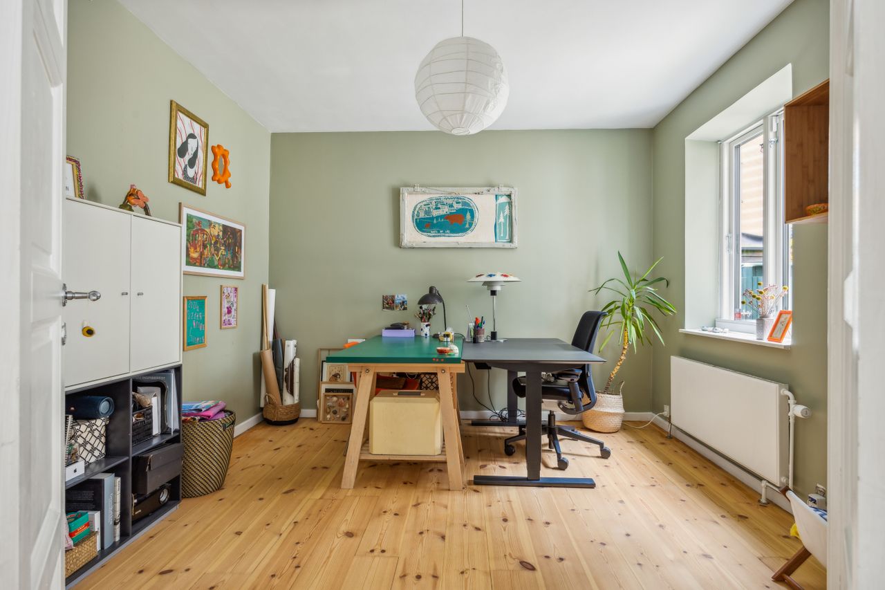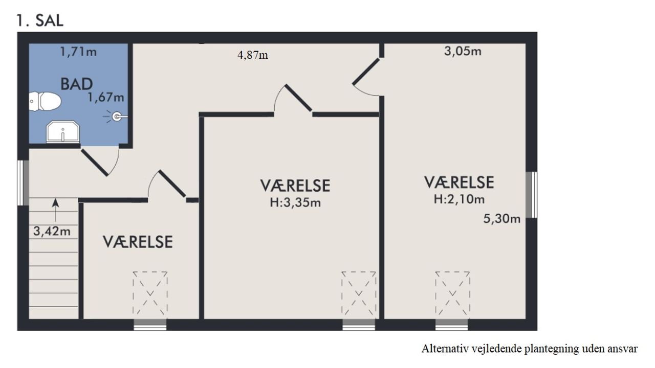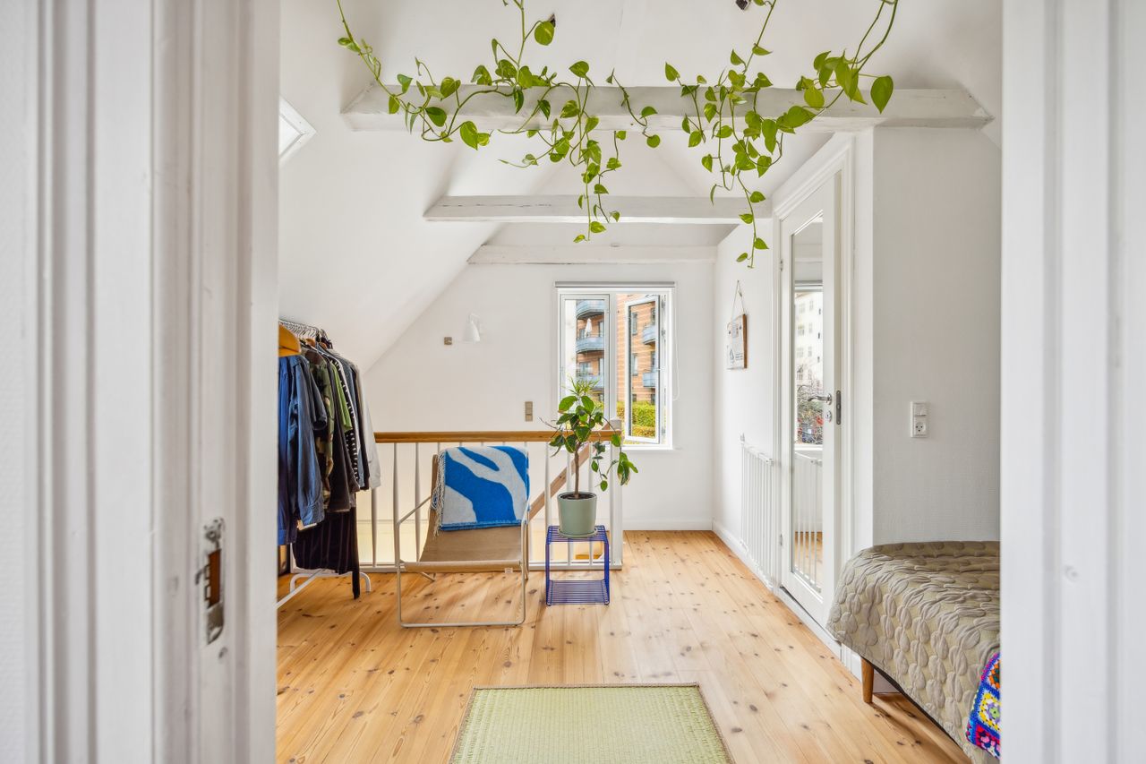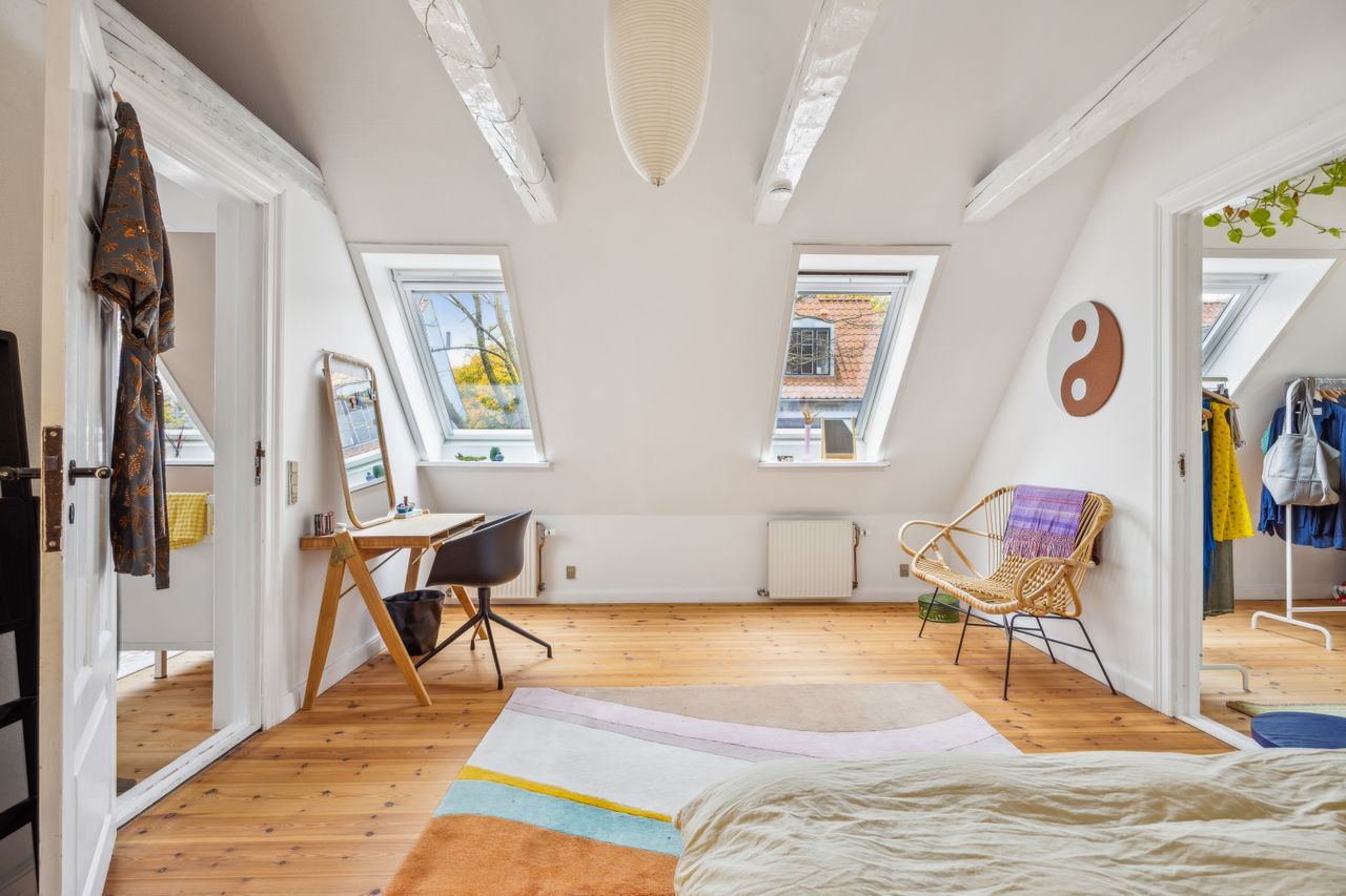 Førstesalen råder over et badeværelse nr. 2 og tre værelser. Etagen byder desuden på en skøn atmosfære, for lyset strømmer indenfor, og lofterne er ført til kip overalt bortset fra på det bagerste værelse, hvor der er indrettet en hems. Desuden har vi med et plan at gøre, hvor væggene nemt kan ændres.