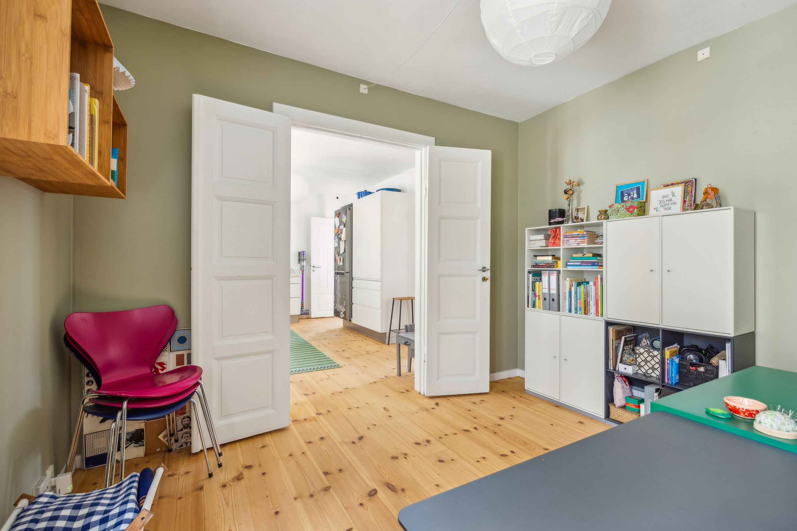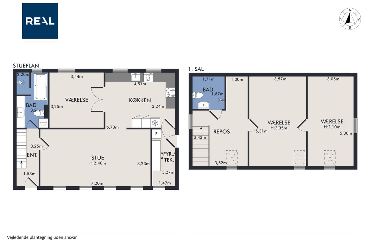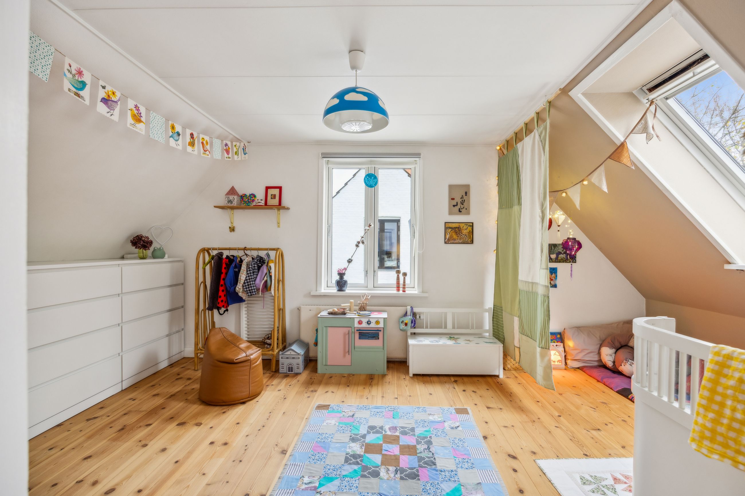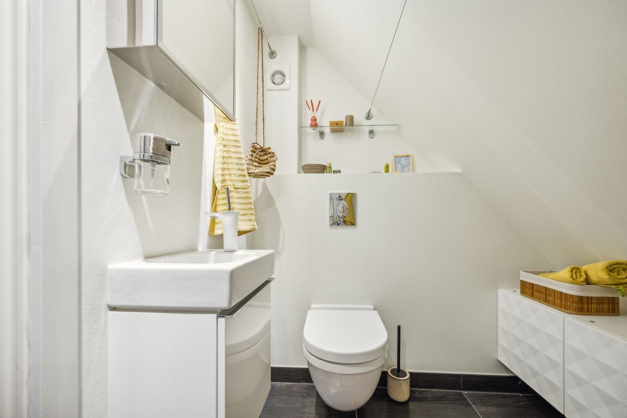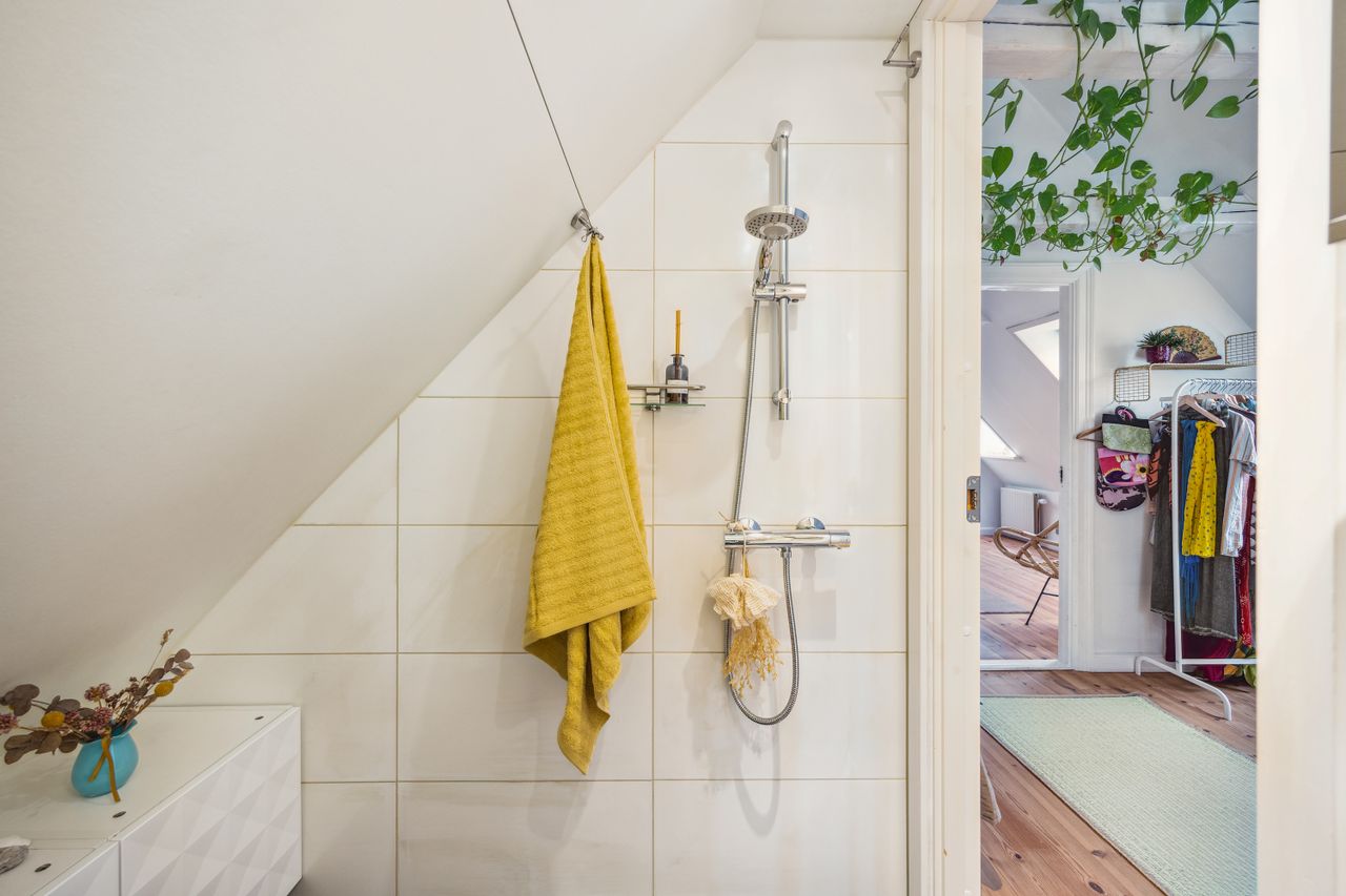 Førstesalen råder over et badeværelse nr. 2 og tre værelser. Etagen byder desuden på en skøn atmosfære, for lyset strømmer indenfor, og lofterne er ført til kip overalt bortset fra på det bagerste værelse, hvor der er indrettet en hems. Desuden har vi med et plan at gøre, hvor væggene nemt kan ændres.
