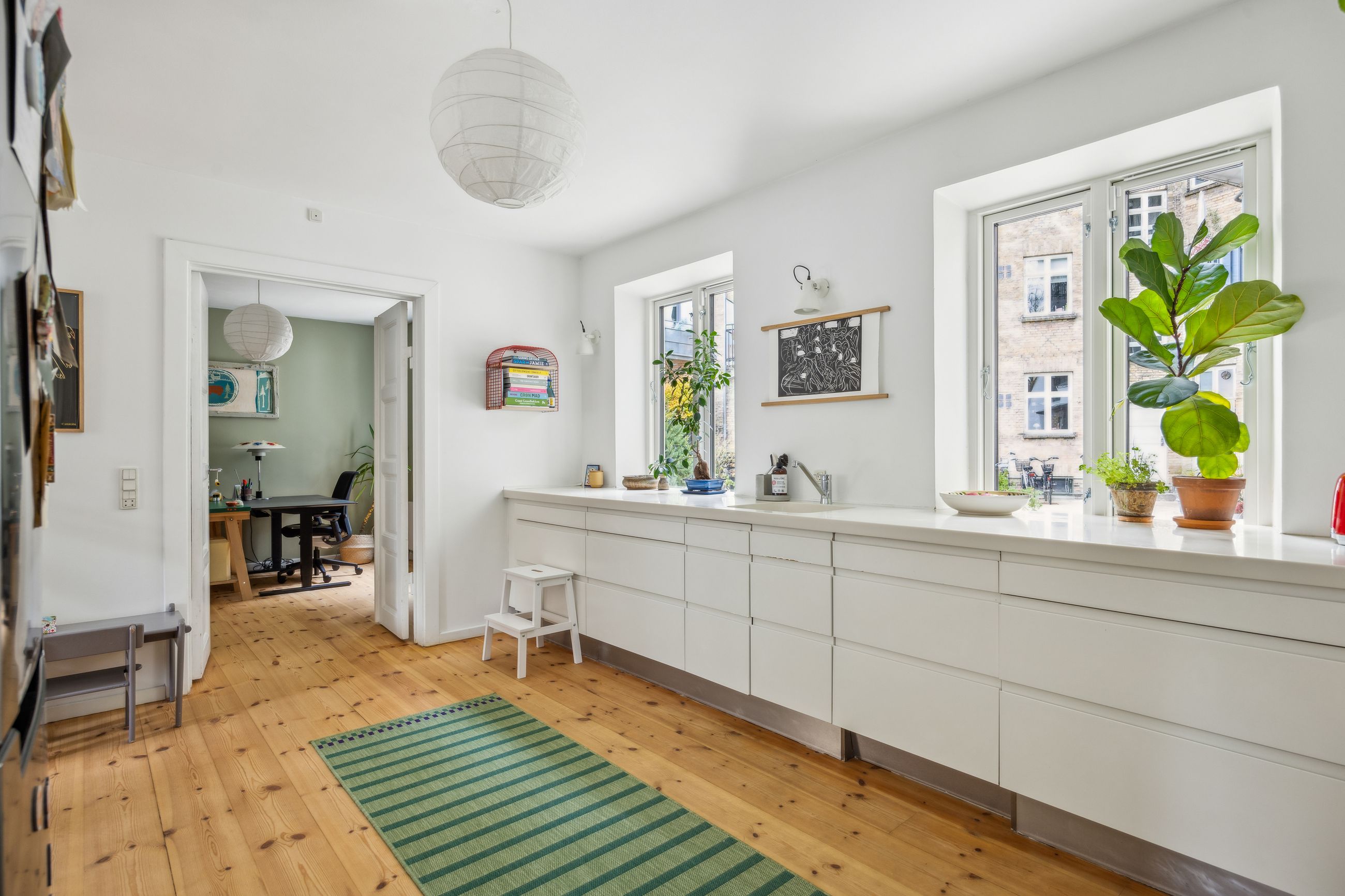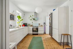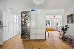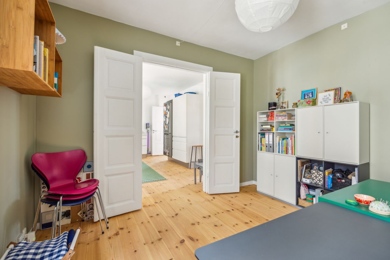 Den venlige atmosfære og den smagfulde indretning byder jer velkommen i stueplan, hvor I finder et fantastisk opholdsmiljø med delvist åben forbindelse mellem stuen og køkkenet. Det store HTH-køkken er lækkert indrettet med grebsfrie elementer samt en eksklusiv Corian-bordplade, der sætter prikken over i’et, og her er rigelig plads til at have børnene med i køkkenet. Samtidig har I udsigt til stuen, som strækker sig syv meter i længden og dermed giver plads til at samle hele familien! Til stueplan hører også et stort badeværelse, stort soveværelse og slutteligt et mindre teknikrum, der med fordel kan bruges som kontor. Herfra er også adgang til andelsboligforeningens gårdmiljø.
