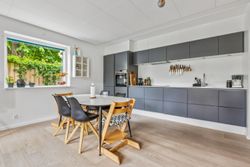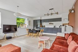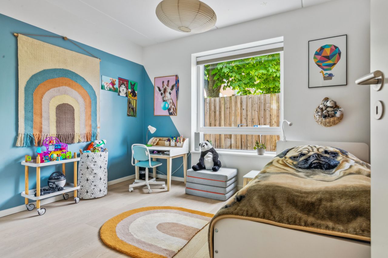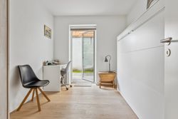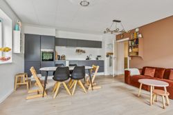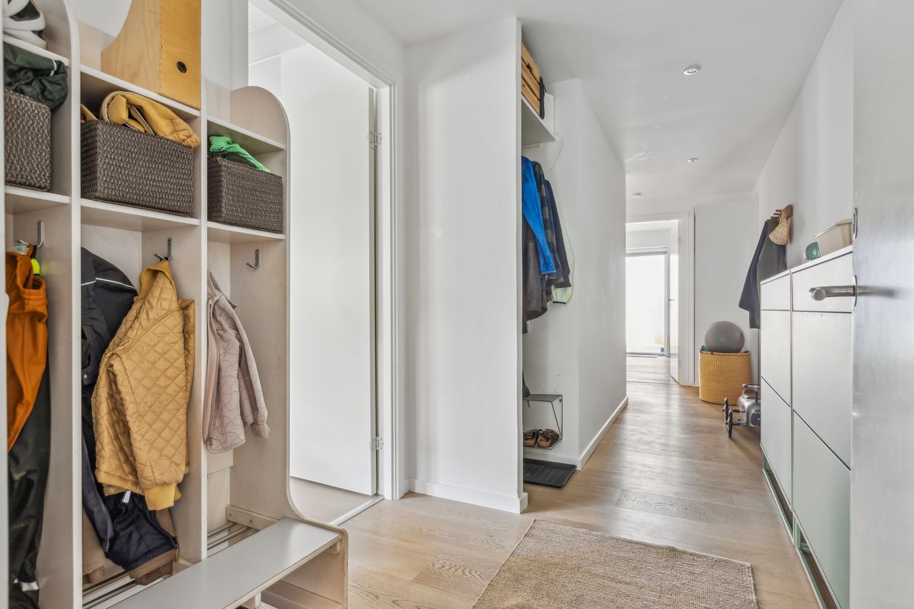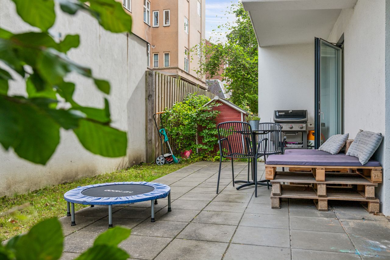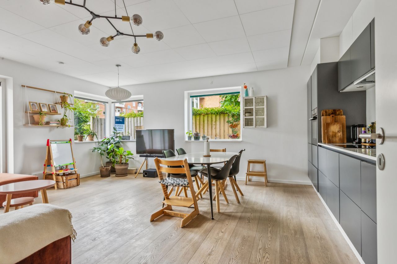 Lejligheden byder på en rummelig og indbydende entré, som leder dig videre ind i det store køkken-alrum, der er i åben forbindelse med opholdsstuen. Herfra er der direkte udgang til forhaven. Boligen rummer hele tre store soveværelser, hvilket gør den ideel til børnefamilien, par med behov for hjemmekontor eller dem, der bare ønsker ekstra plads. Herfra er der direkte udgang til en stor, sydvendt baghave – perfekt til udeliv og afslapning i solen. Dertil kommer et rummeligt badeværelse med moderne fliser og vaskesøjle. De brede plankegulve i eg skaber en varm og eksklusiv atmosfære, mens det stilrene Svane-køkken fra 2018 fuldender helhedsindtrykket af moderne kvalitet.