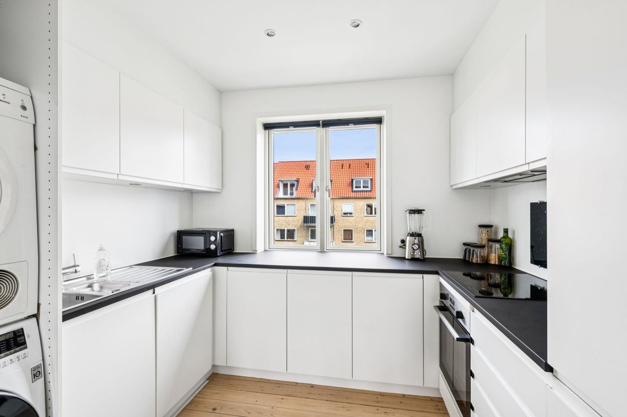 Lejligheden byder på 58 m2 fordelt på entré, rummelig stue, soveværelse, køkken og badeværelse. Hjertet i boligen er det flotte Kvik-køkken fra 2023, holdt i hvide, stilrene elementer kombineret med en kontrastfyldt sort bordplade – en moderne og funktionel løsning, der både er indbydende og praktisk i hverdagen. Herudover får du en planløsning uden spildplads, et dejligt lysindfald samt charmerende detaljer som de originale plankegulve.