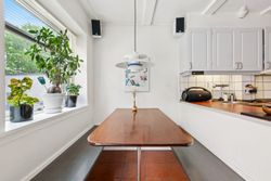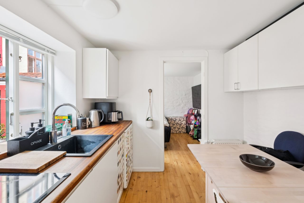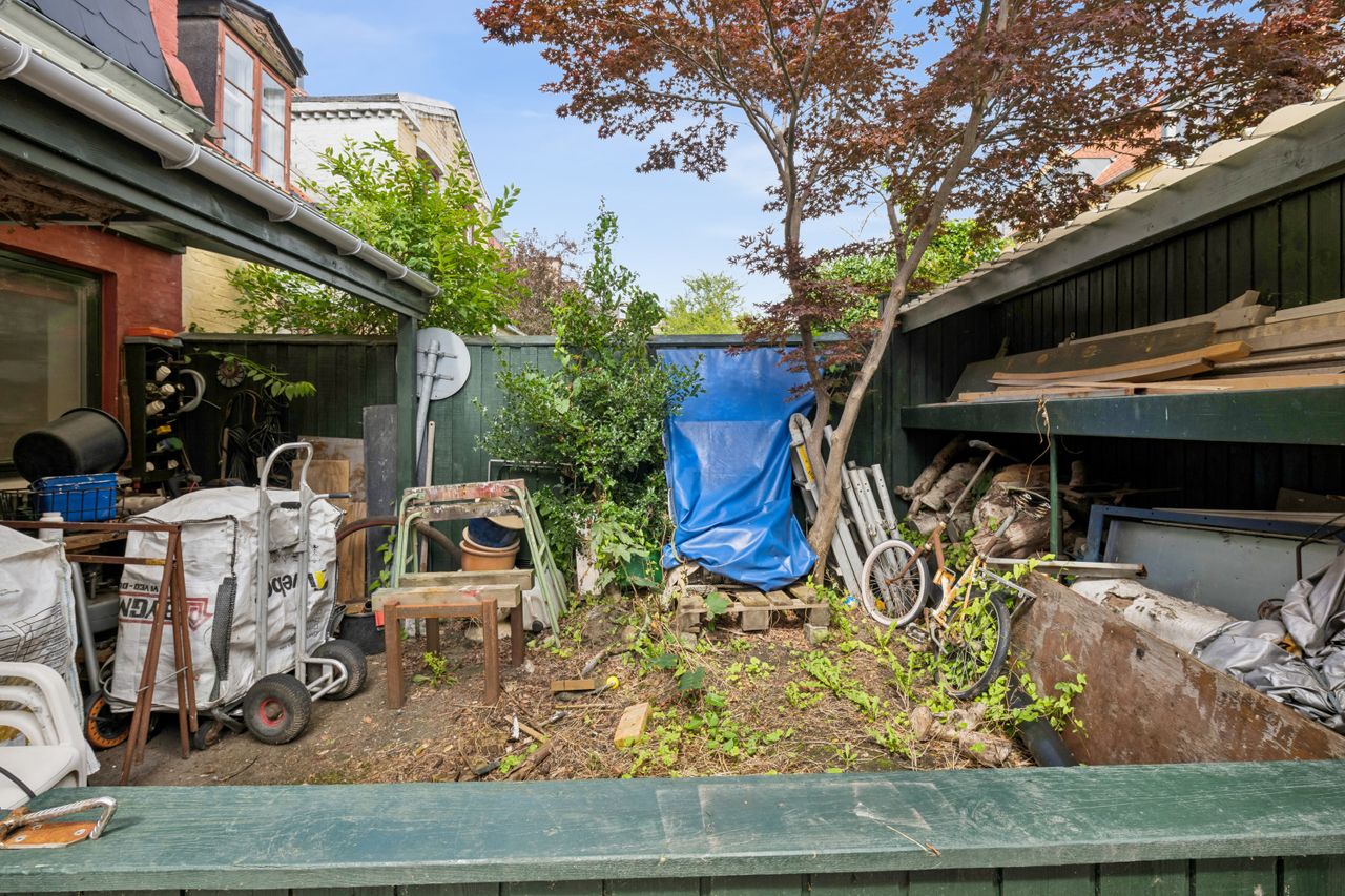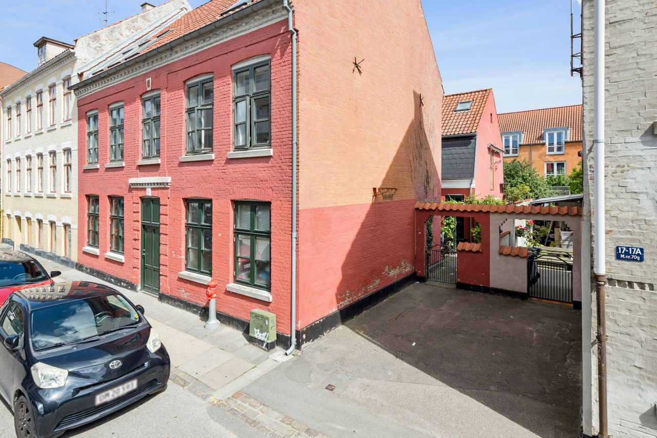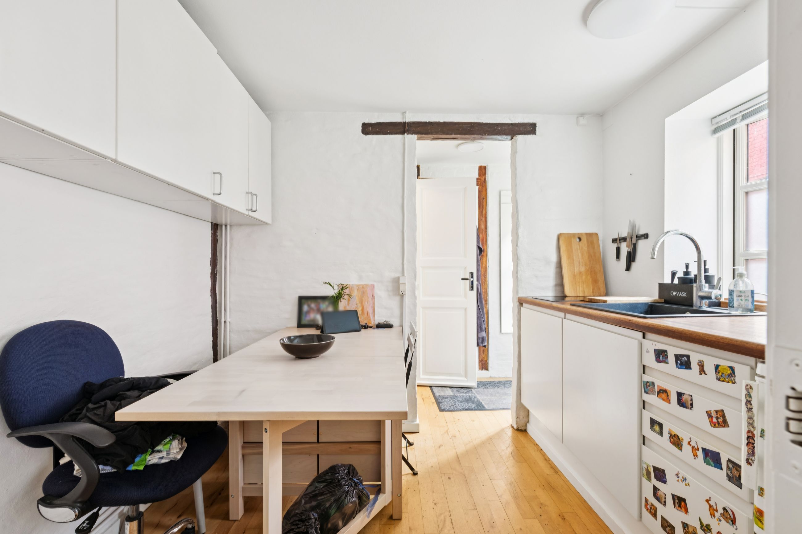 Lejligheden strækker sig over 86 kvadratmeter og er opdelt i to separate dele, hver med sin egen entré. Den første del byder på et rummeligt køkken med spiseplads, hvor man kan nyde måltiderne i lyse omgivelser. En stor stue inviterer til afslapning og hygge, mens det skønne soveværelse har direkte udgang til haven - et sandt fristed midt i byen. Derudover finder du et kontor samt et moderne badeværelse.