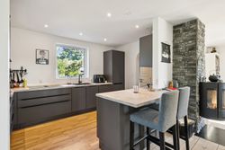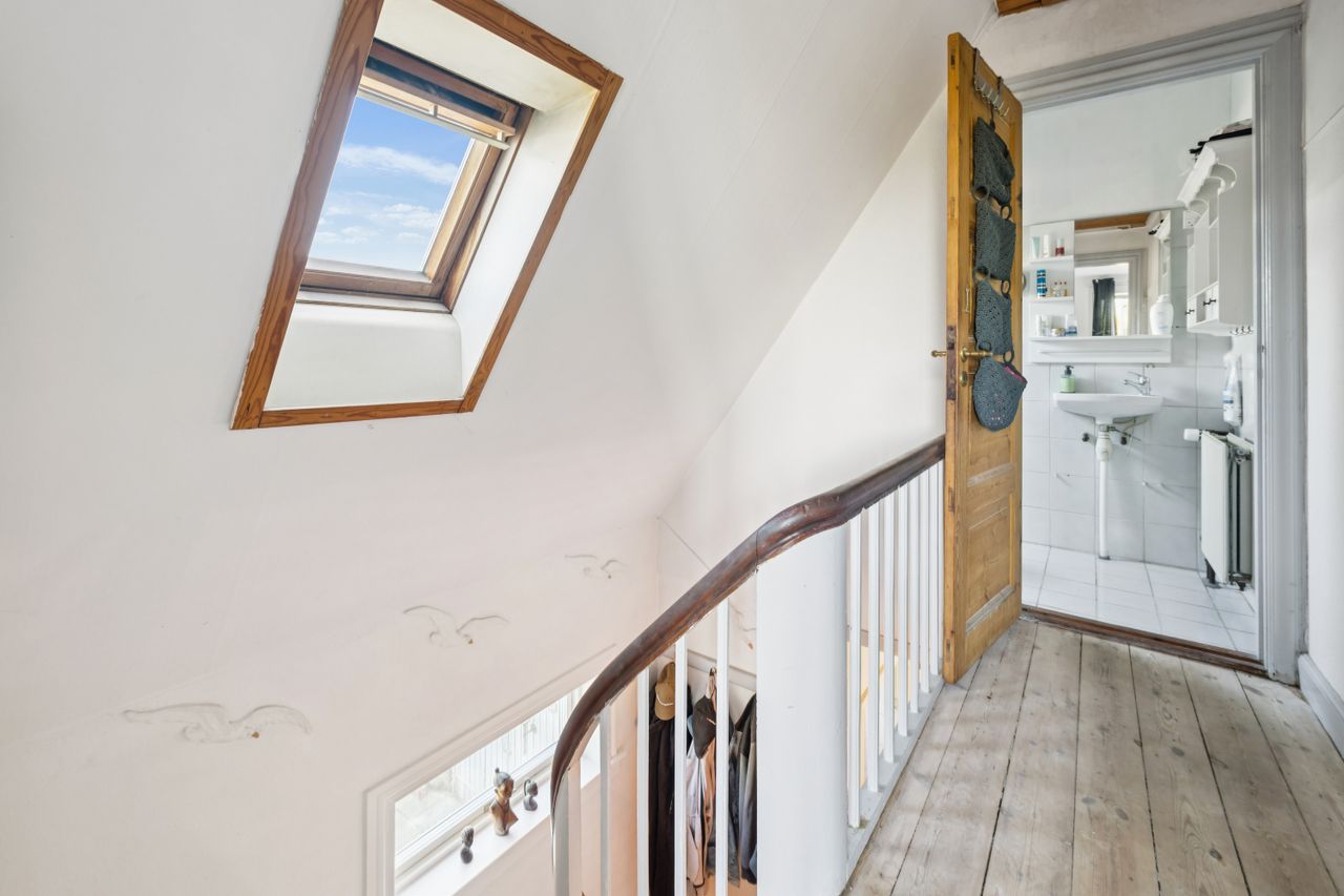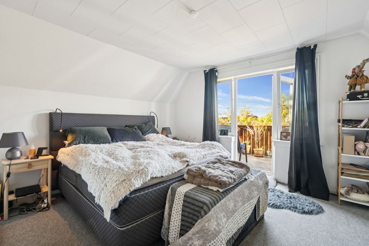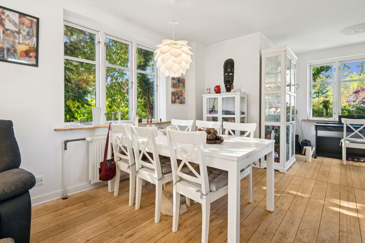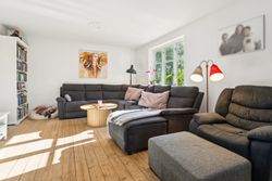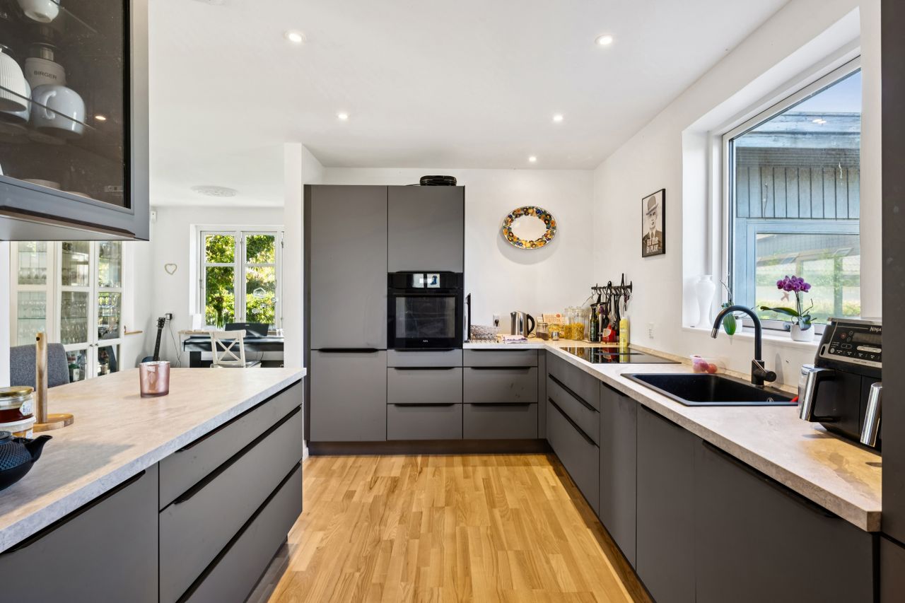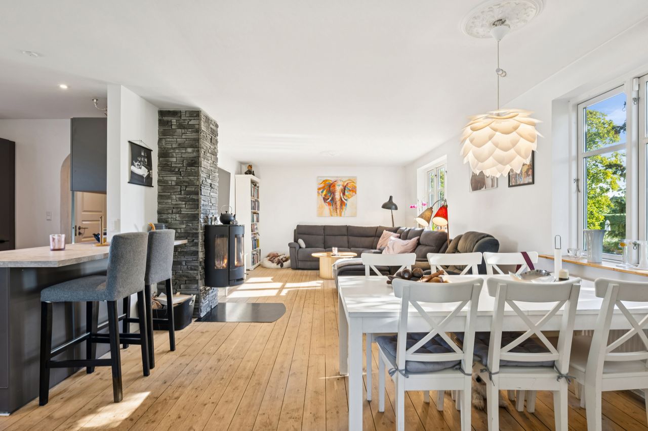Indendørs mødes man af et indbydende køkken, der er i åben forbindelse til spise- og opholdsstue. Køkkenet har plads til madlavning i fællesskab og direkte udgang til husets største terrasse, hvor sommeren kan nydes ugeneret i private rammer. Opholdsstuen fremhæves af et dejligt lysindfald fra store vinduespartier og har rum til både sofahjørne, legeområde og spiseafdeling. Husets værelser er rummelige og oplagte til børneværelser, kontor eller soveværelse, ligesom der er to badeværelser med god plads til familiens daglige rutiner.