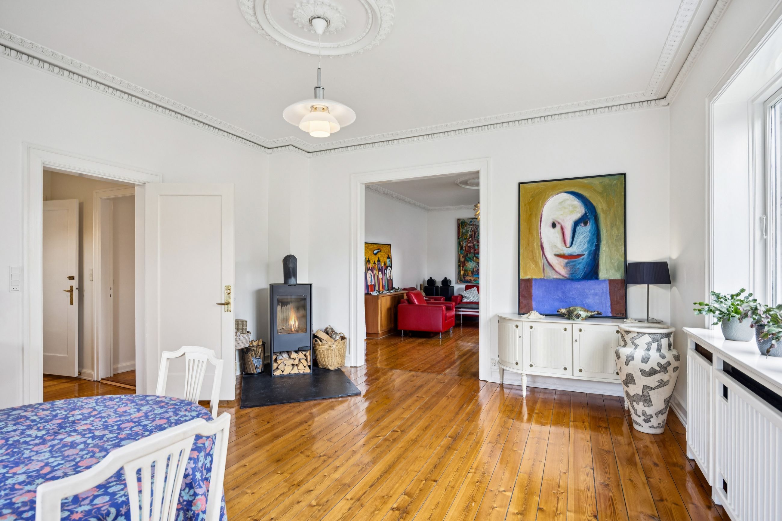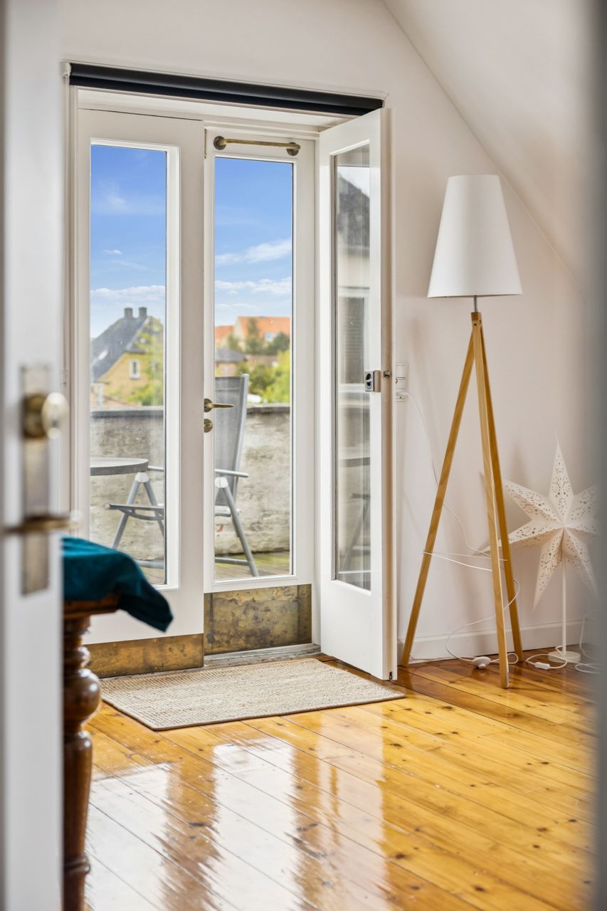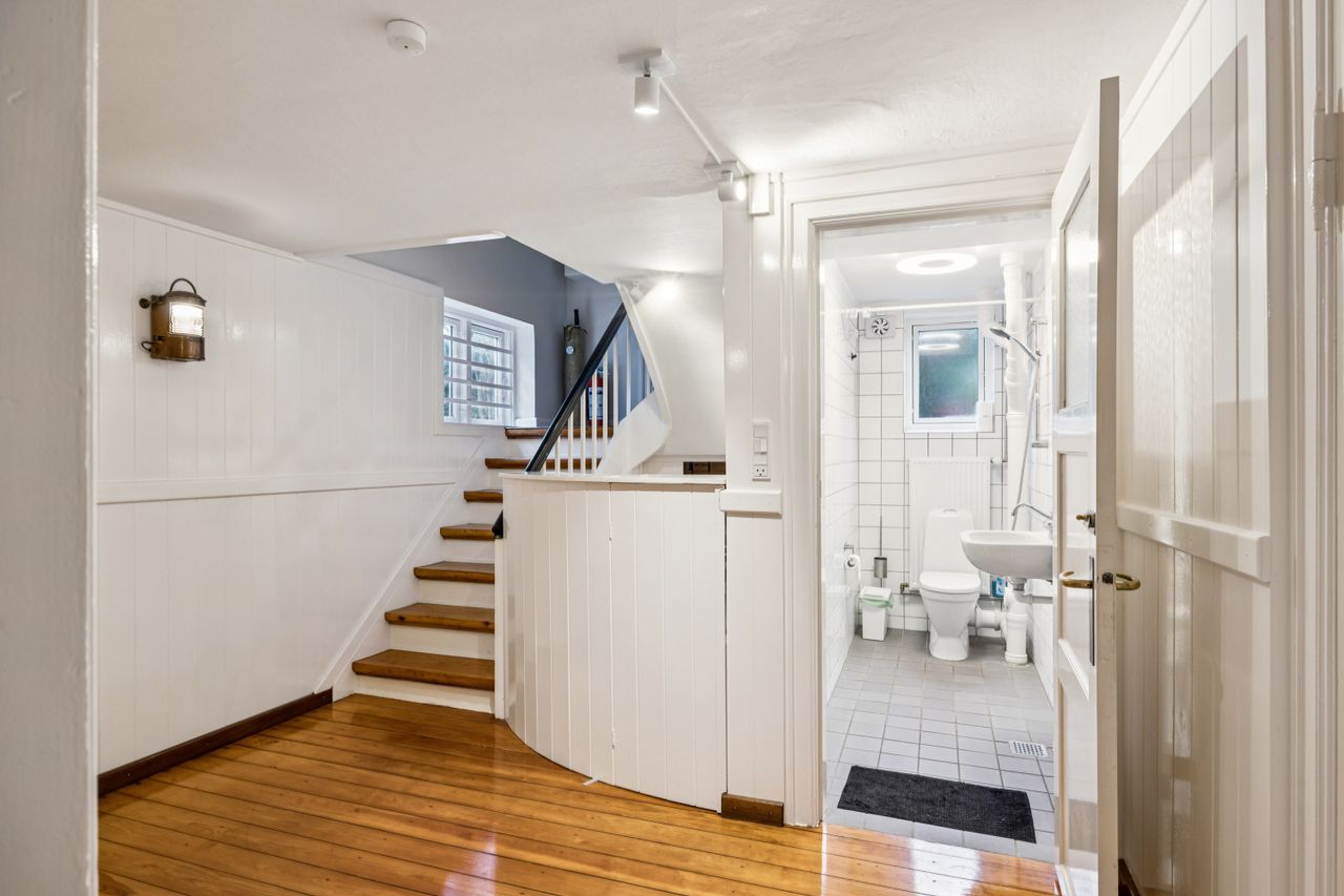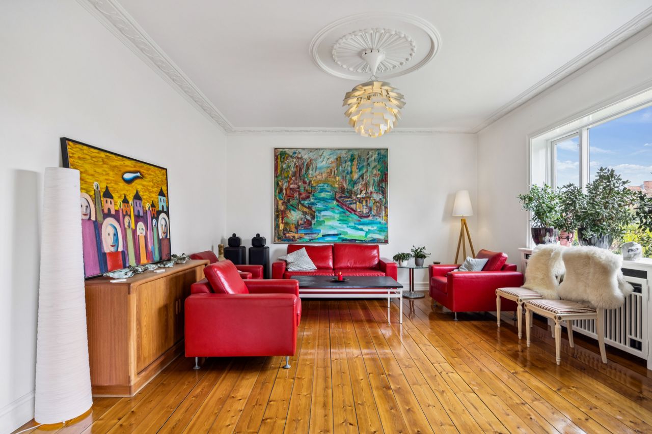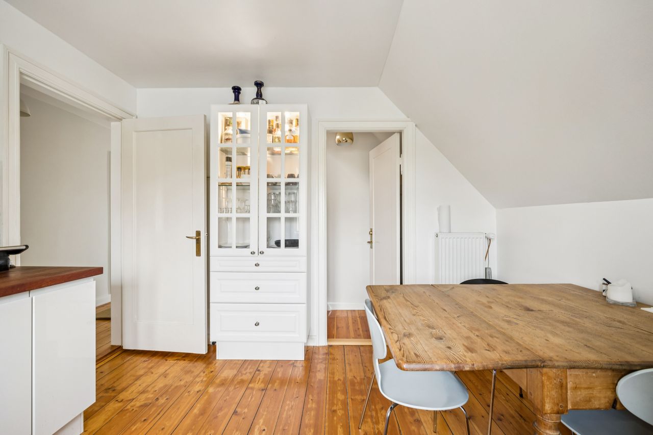 Når du træder indenfor vil det smukke trappeløb straks afsløre husets herskabelige sjæl. I stuerne breder de lakerede, massive trægulve sig under de høje lofter, der prydes af originale stuk og elegante rosetter. De store vinduespartier inviterer dagslyset ind og skaber en let og luftig stemning, der forstærker den fornemme karakter. Den sydvendte balkon forlænger opholdsrummene ud i det fri og tilbyder et roligt sted at nyde morgensolen eller eftermiddagens gyldne lys med udsigt over den grønne og velanlagte have.