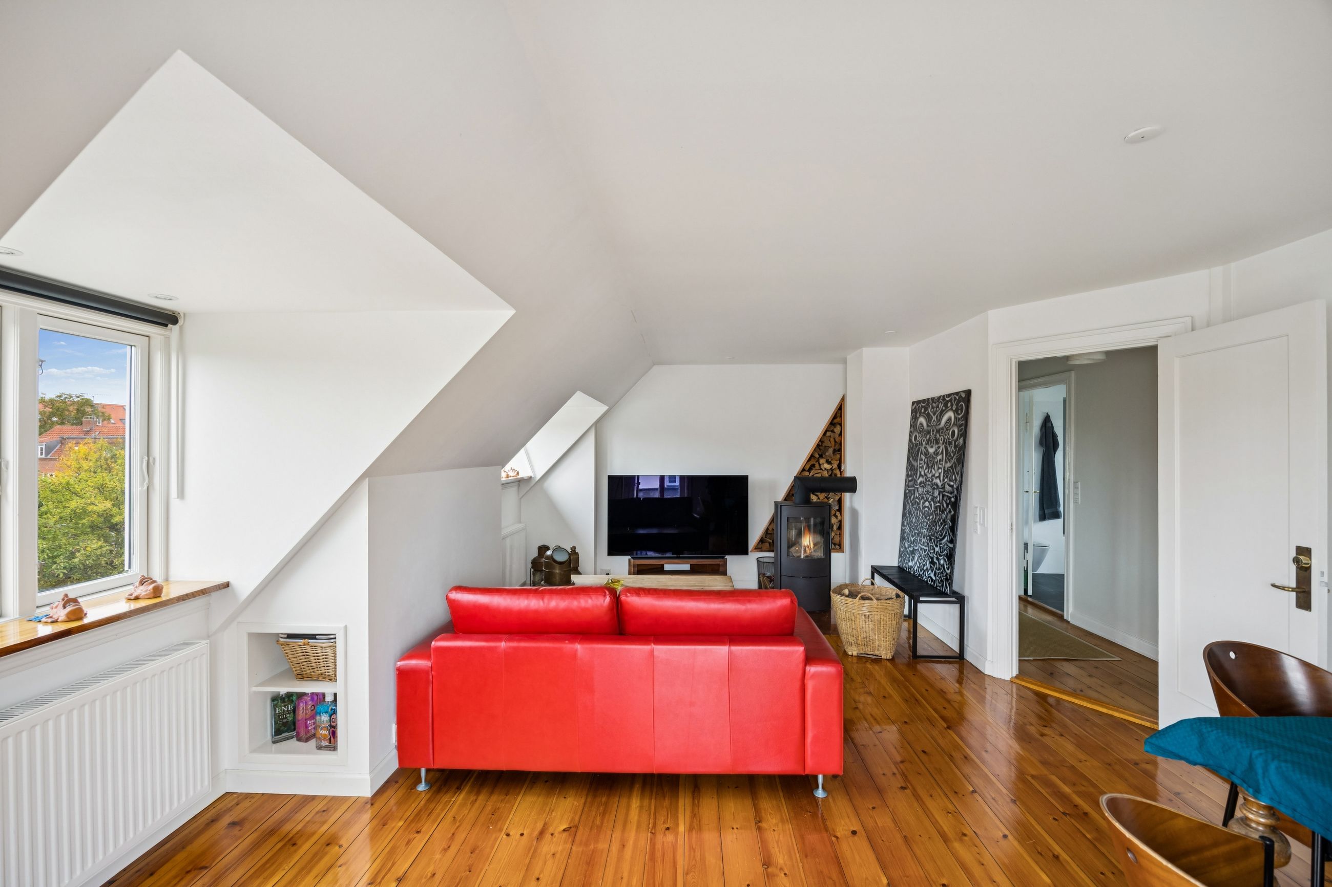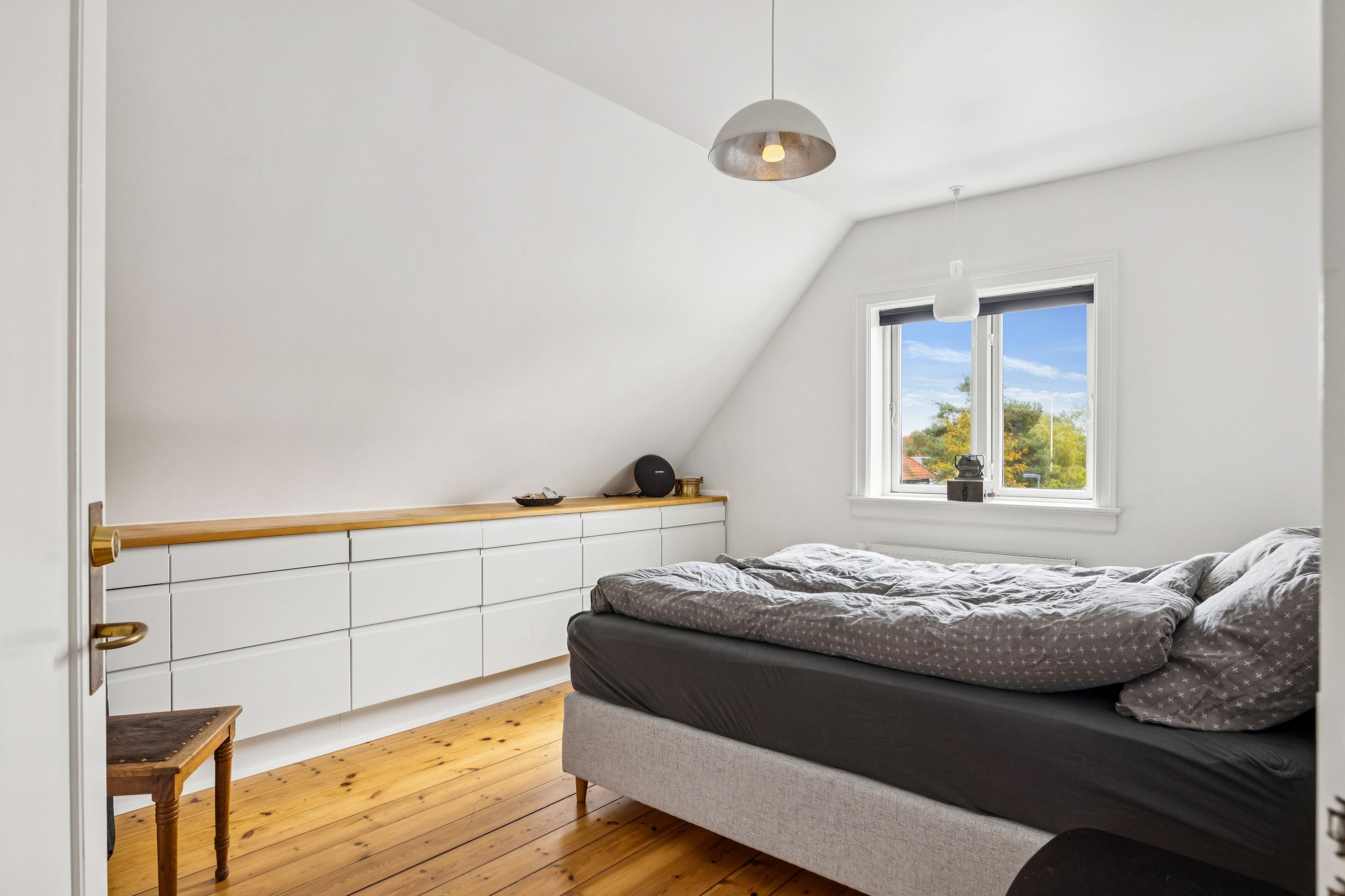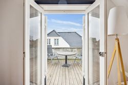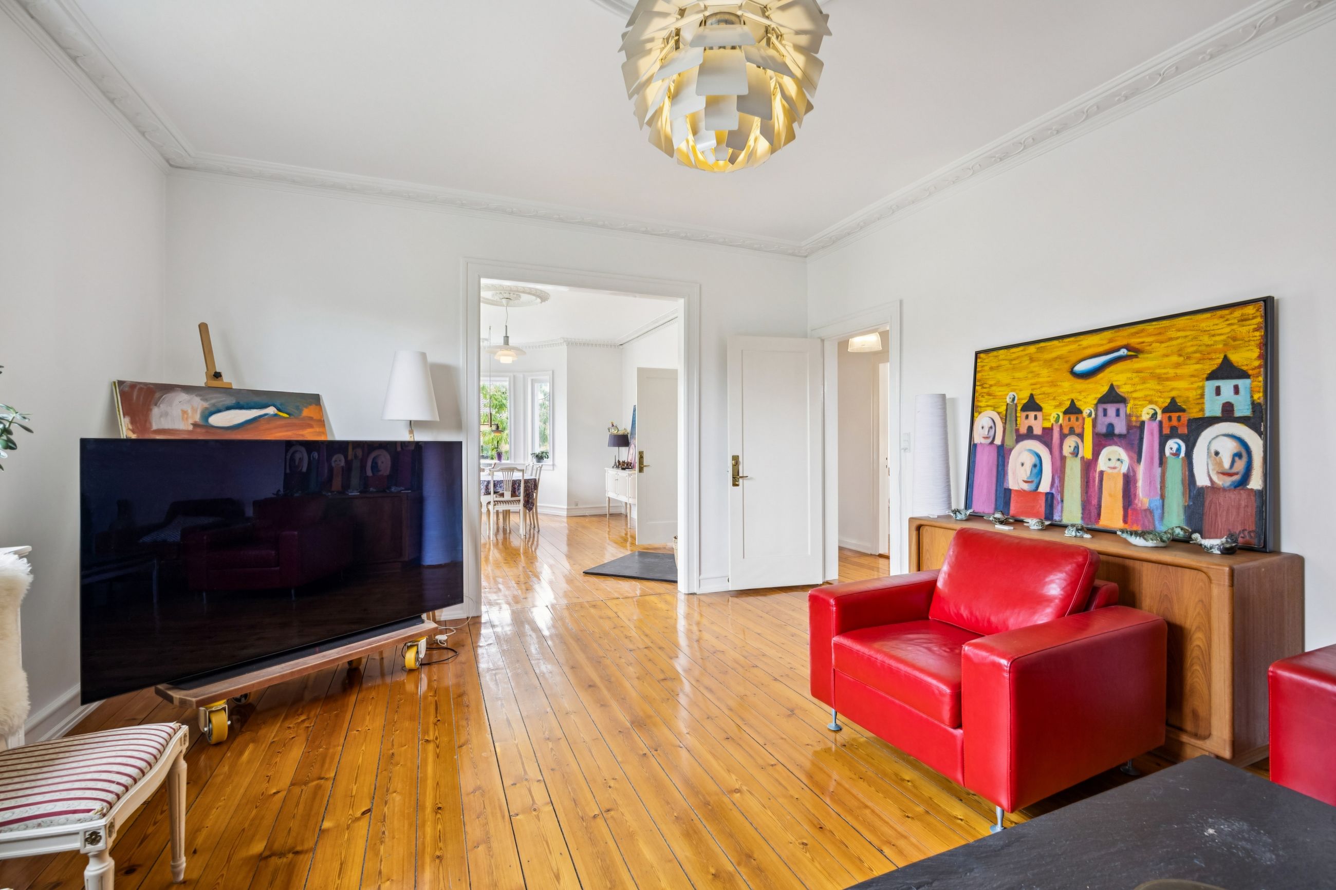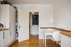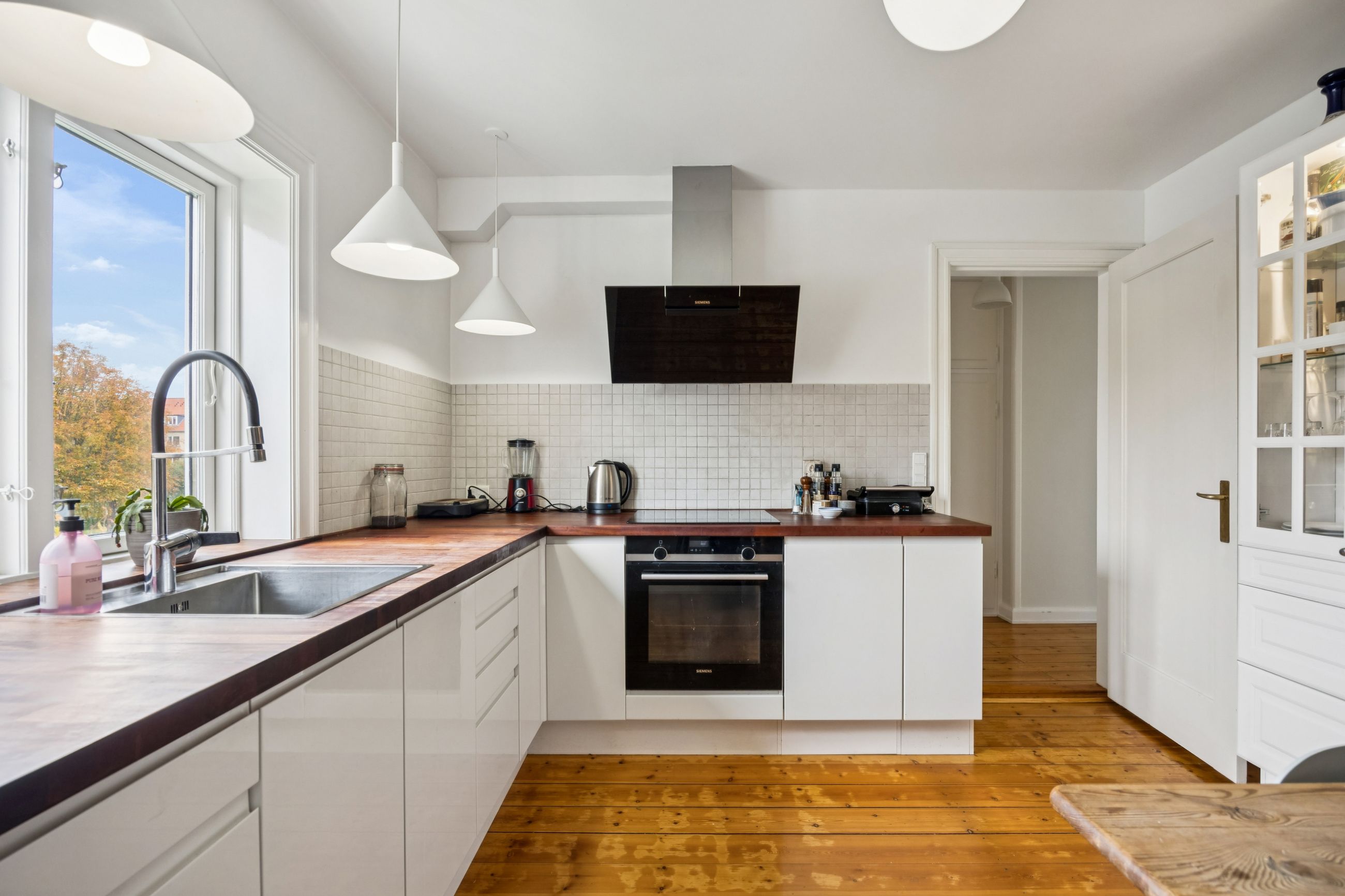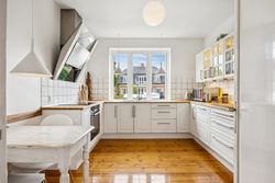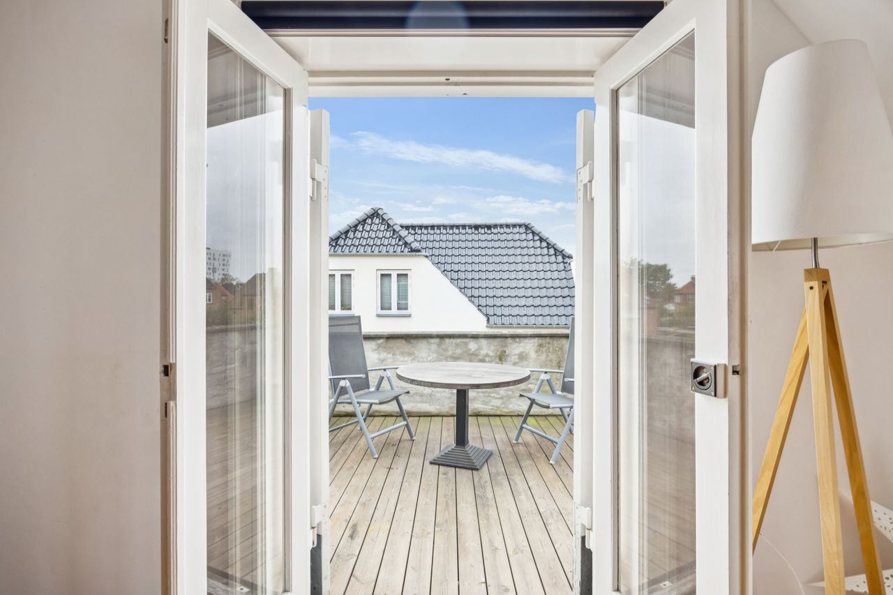 Når du træder indenfor vil det smukke trappeløb straks afsløre husets herskabelige sjæl. I stuerne breder de lakerede, massive trægulve sig under de høje lofter, der prydes af originale stuk og elegante rosetter. De store vinduespartier inviterer dagslyset ind og skaber en let og luftig stemning, der forstærker den fornemme karakter. Den sydvendte balkon forlænger opholdsrummene ud i det fri og tilbyder et roligt sted at nyde morgensolen eller eftermiddagens gyldne lys med udsigt over den grønne og velanlagte have.