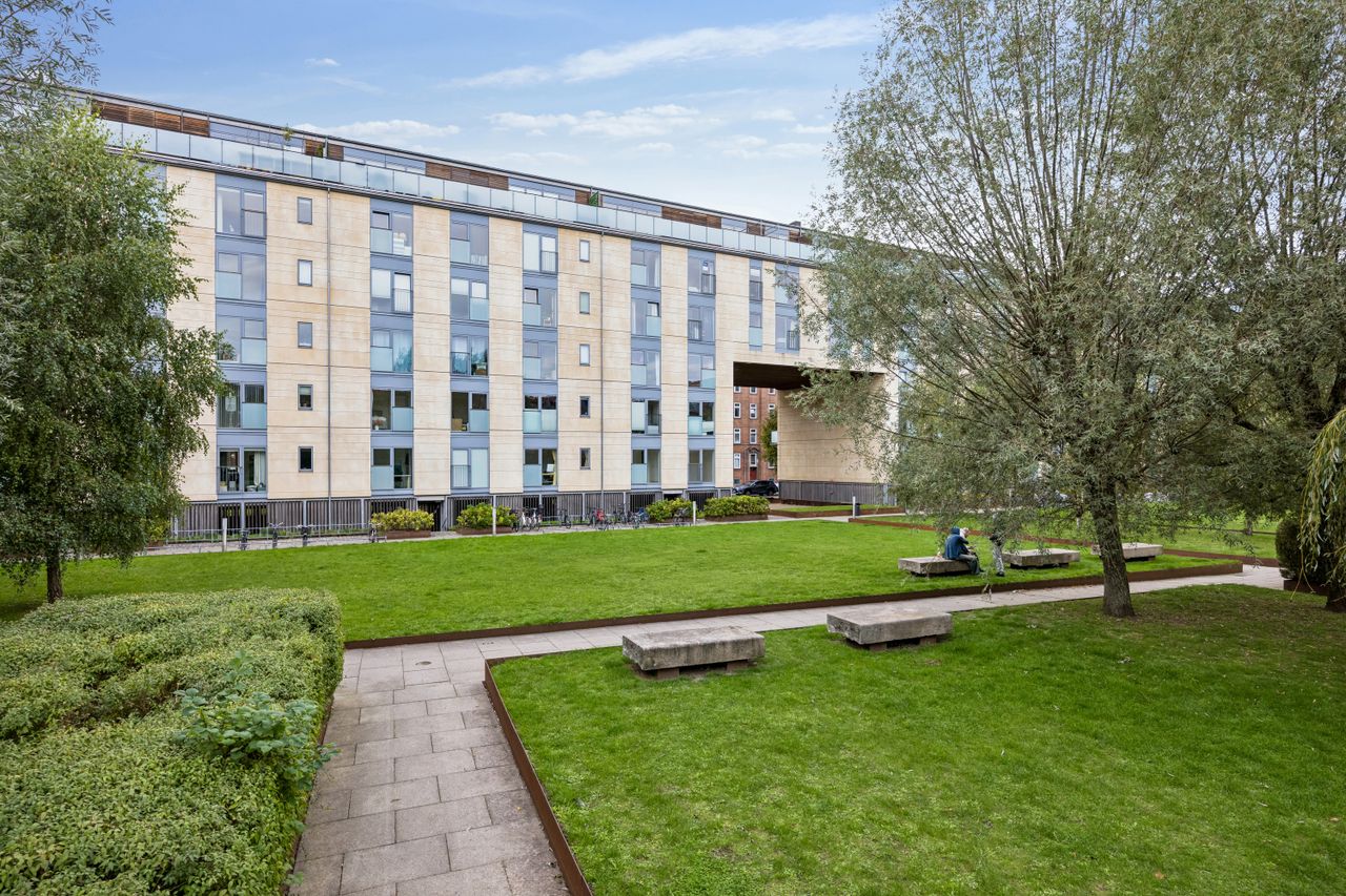 Lejligheden ligger i en moderne ejendom opført i 2006, hvilket betyder, man får glæde af moderne byggeri med elevator, gode adgangsforhold og minimale vedligeholdelsesudgifter. Ejendommen er veldrevet med attraktive fællesfaciliteter – ikke mindst et stort, grønt og parklignende gårdmiljø, som er perfekt til ture med hunden eller leg for børnene. Desuden har foreningen også en fælles tagterrasse med en skøn udsigt.