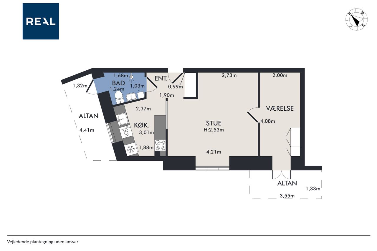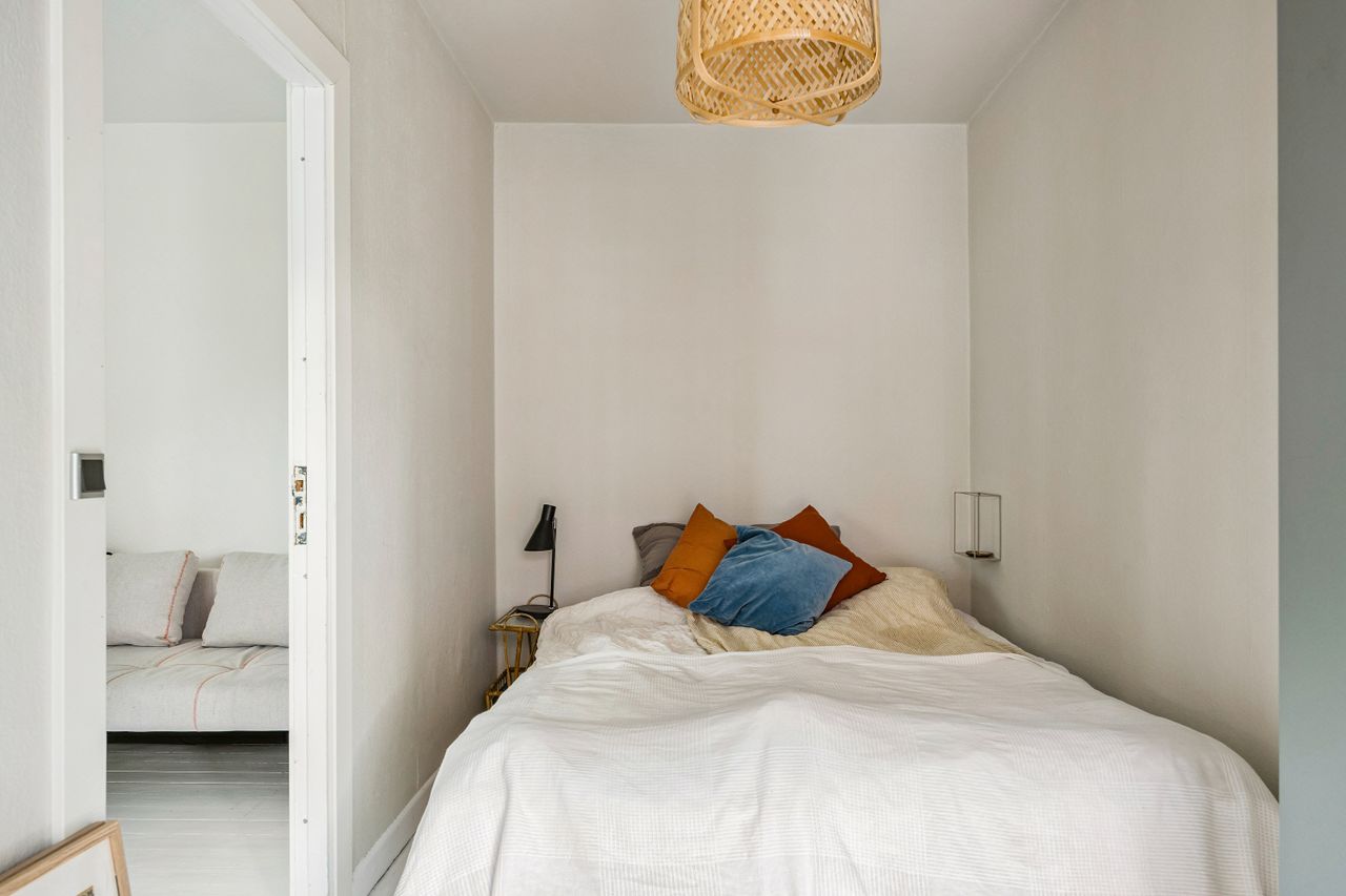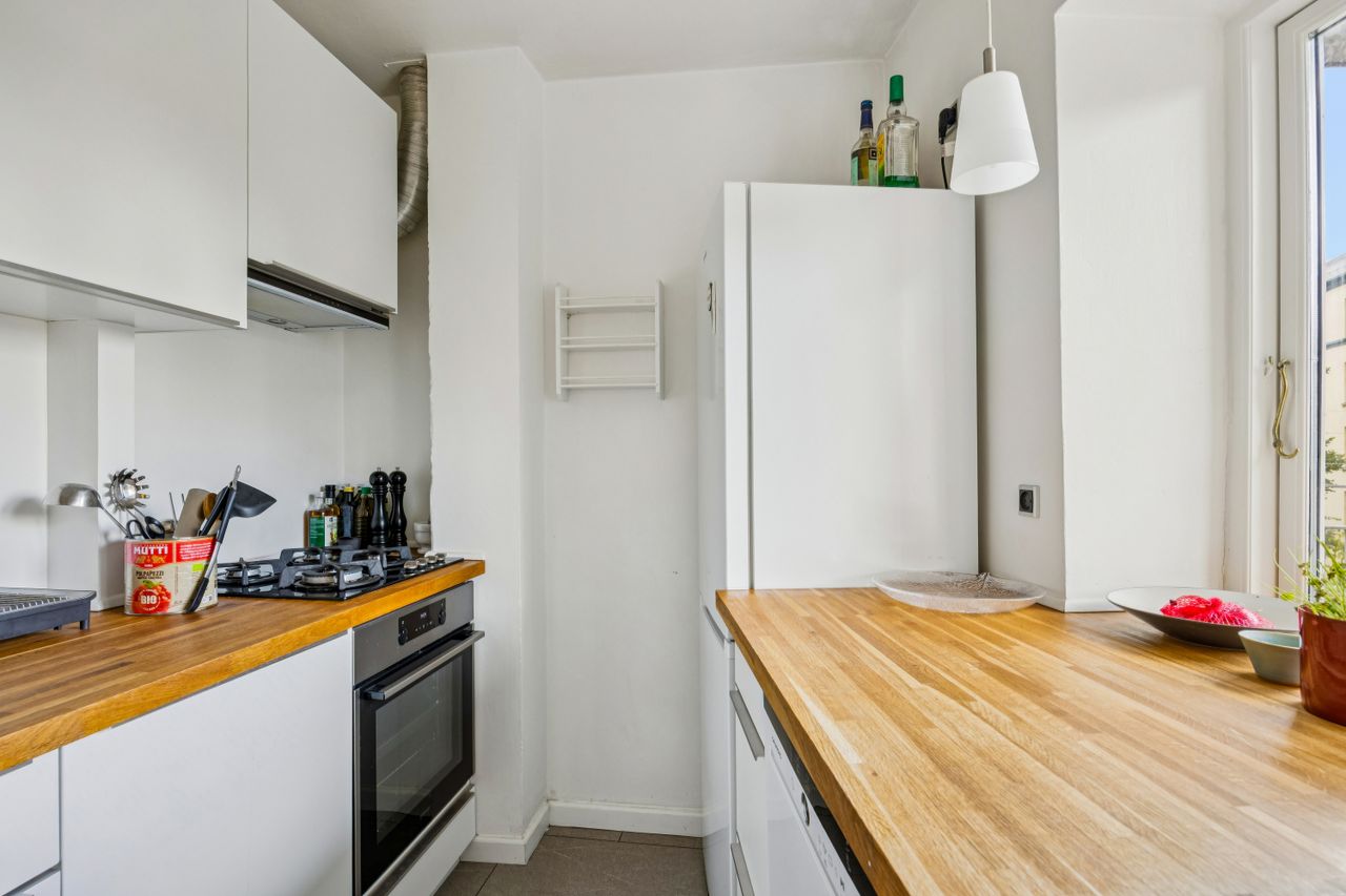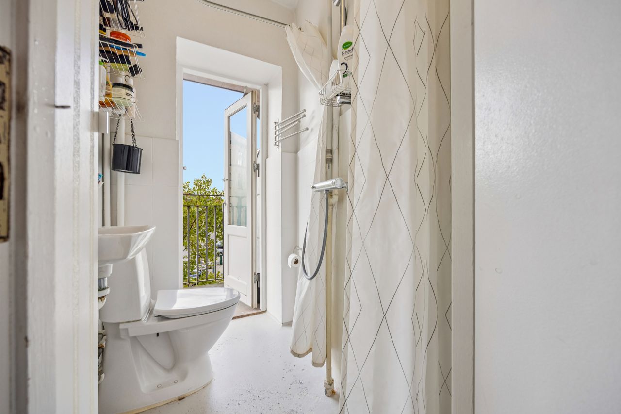 Boligens indretning er optimal med et lyst opholdsrum og et køkken, hvor hver kvadratmeter udnyttes smart. Badeværelset har separat brus og er af ældre stand – ideelt for køber, der ønsker at sætte sit eget præg, men fungerer fint til daglig brug.