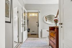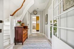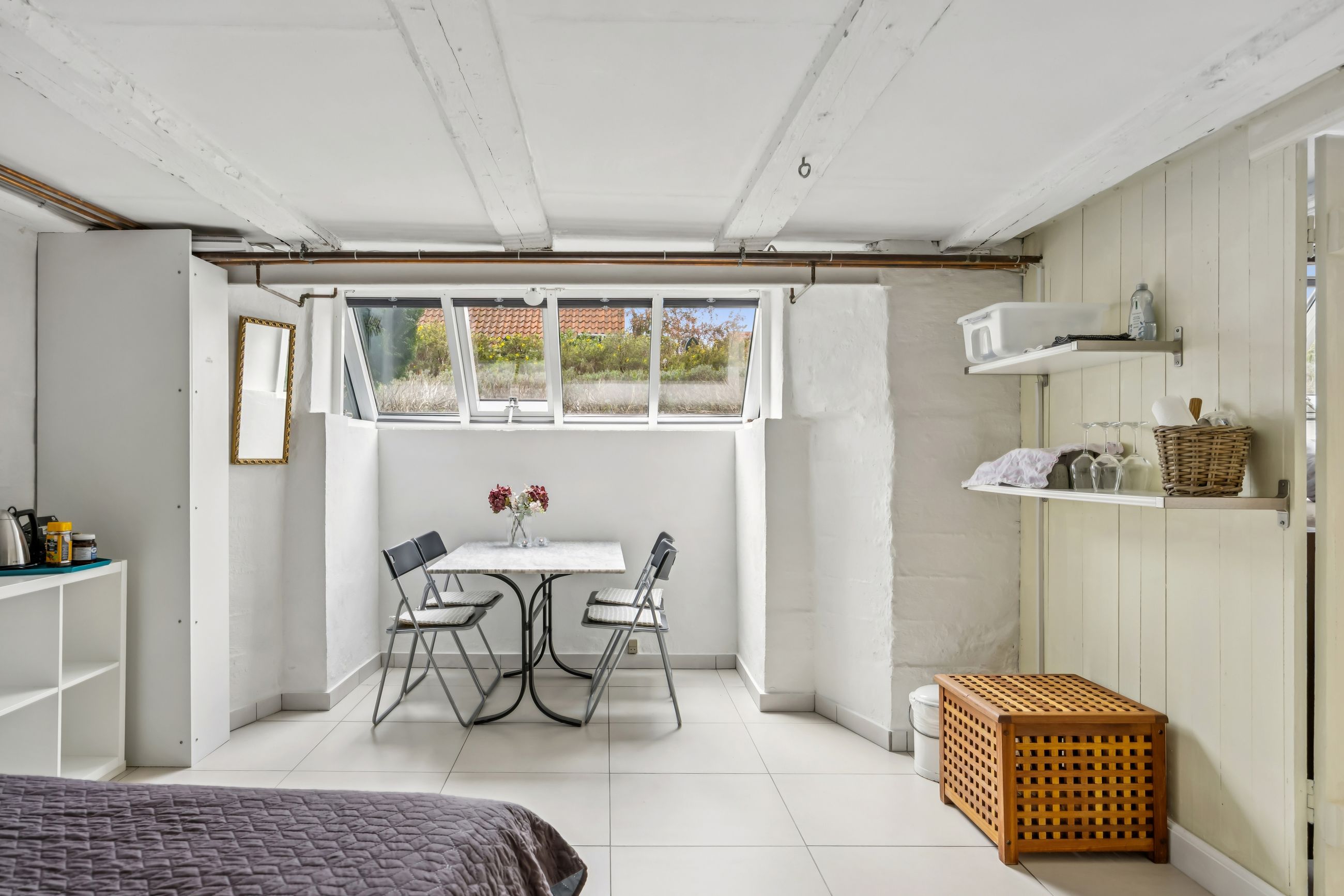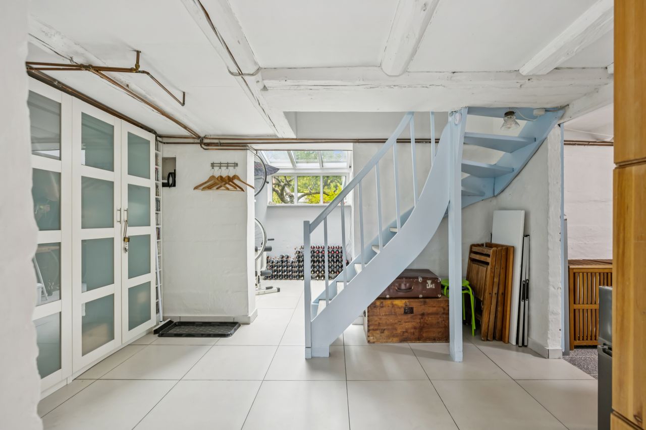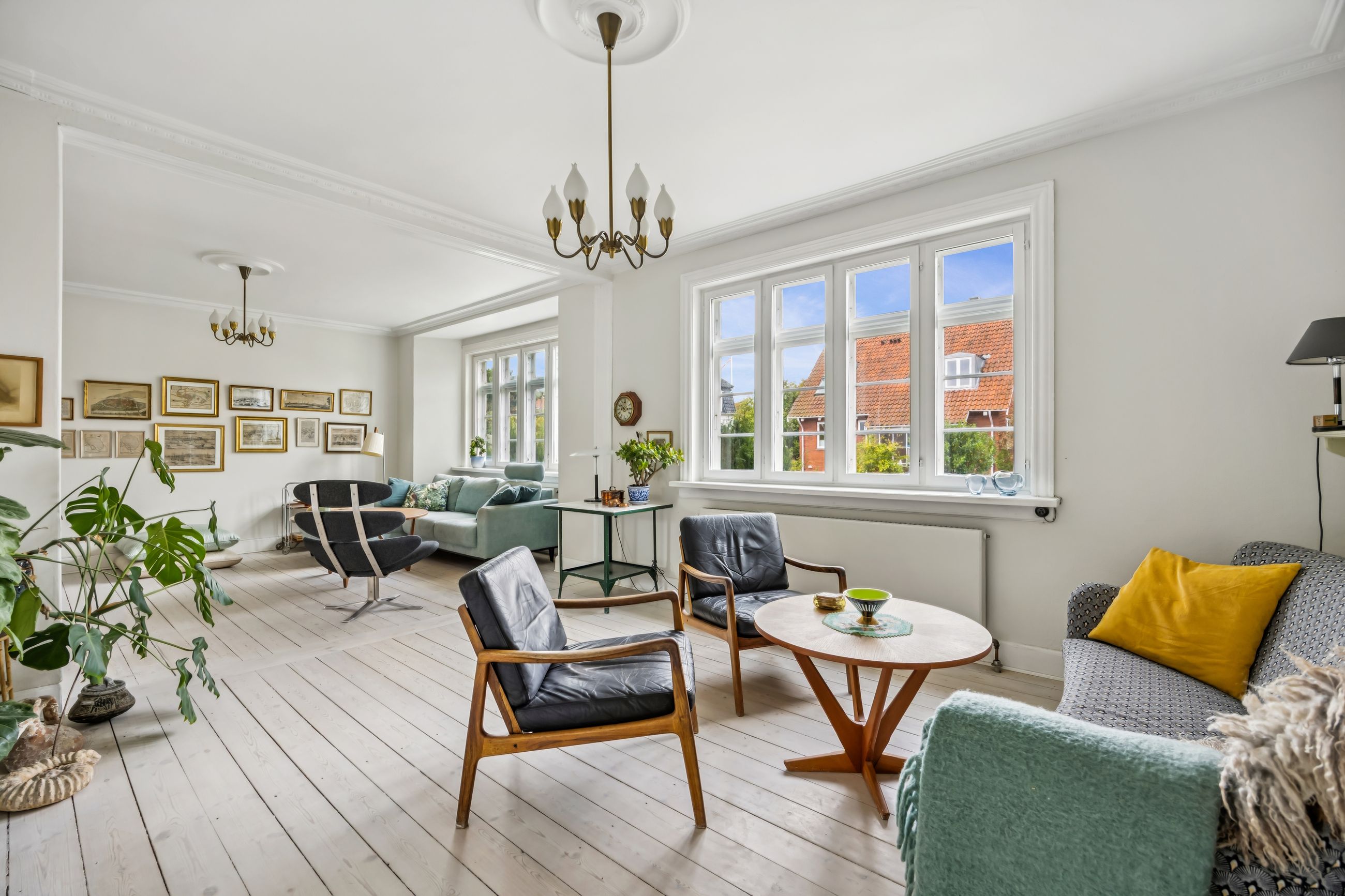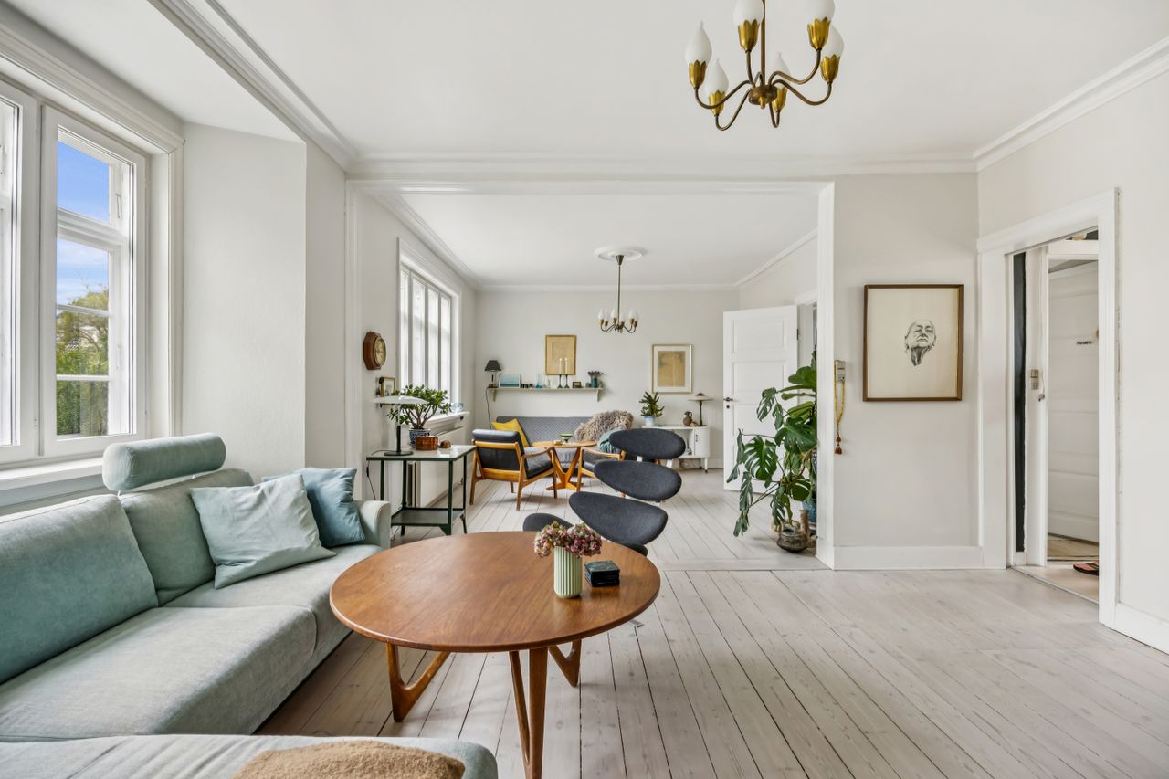 Når du træder ind i stuen, vil du straks blive betaget af de herskabelige stuklofter og elegante rosetter, som sammen med de store vinduespartier skaber et lyst og luftigt rum. De massive trægulve bidrager til stuens varme atmosfære. Den højloftede kælder blev renoveret i 2012 med nyt gulv og gulvvarme, hvilket giver ekstra anvendelsesmuligheder for familien.