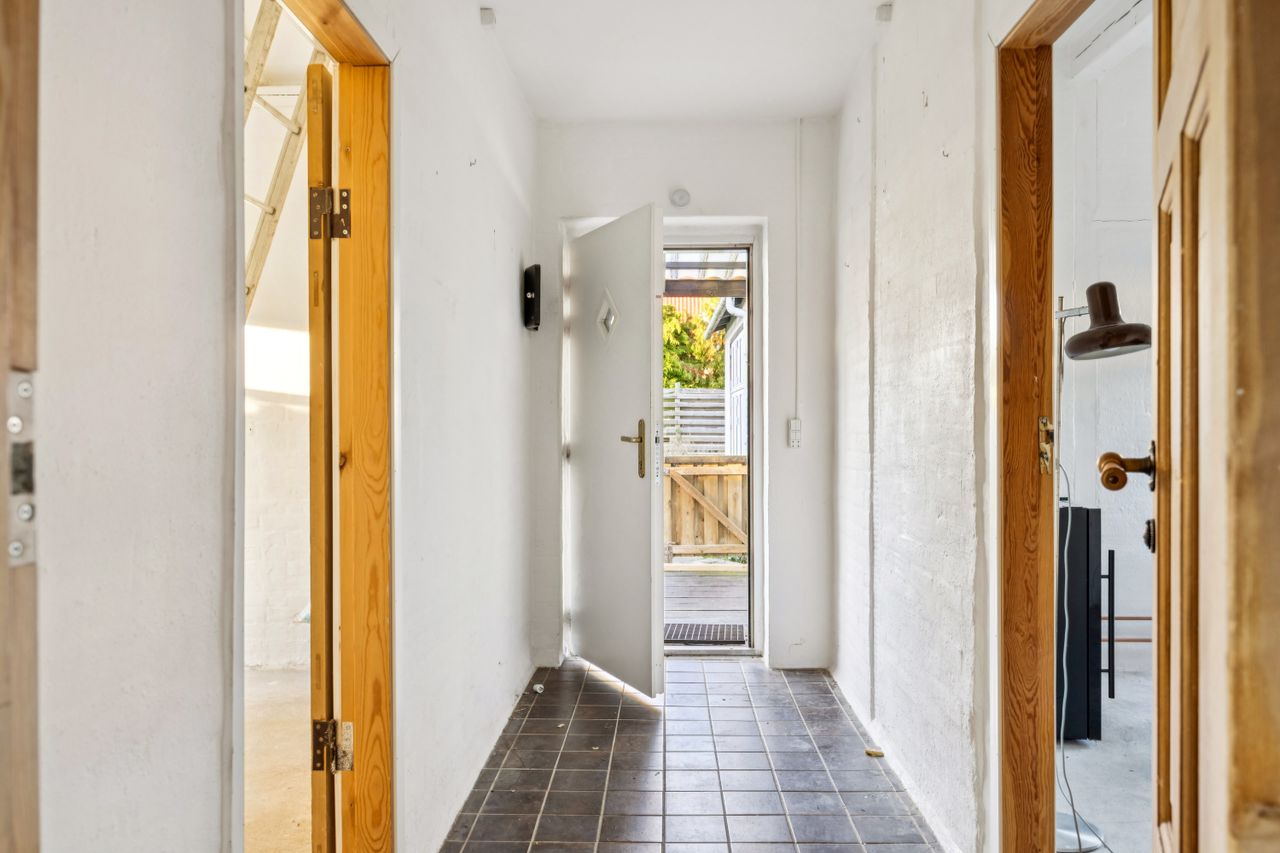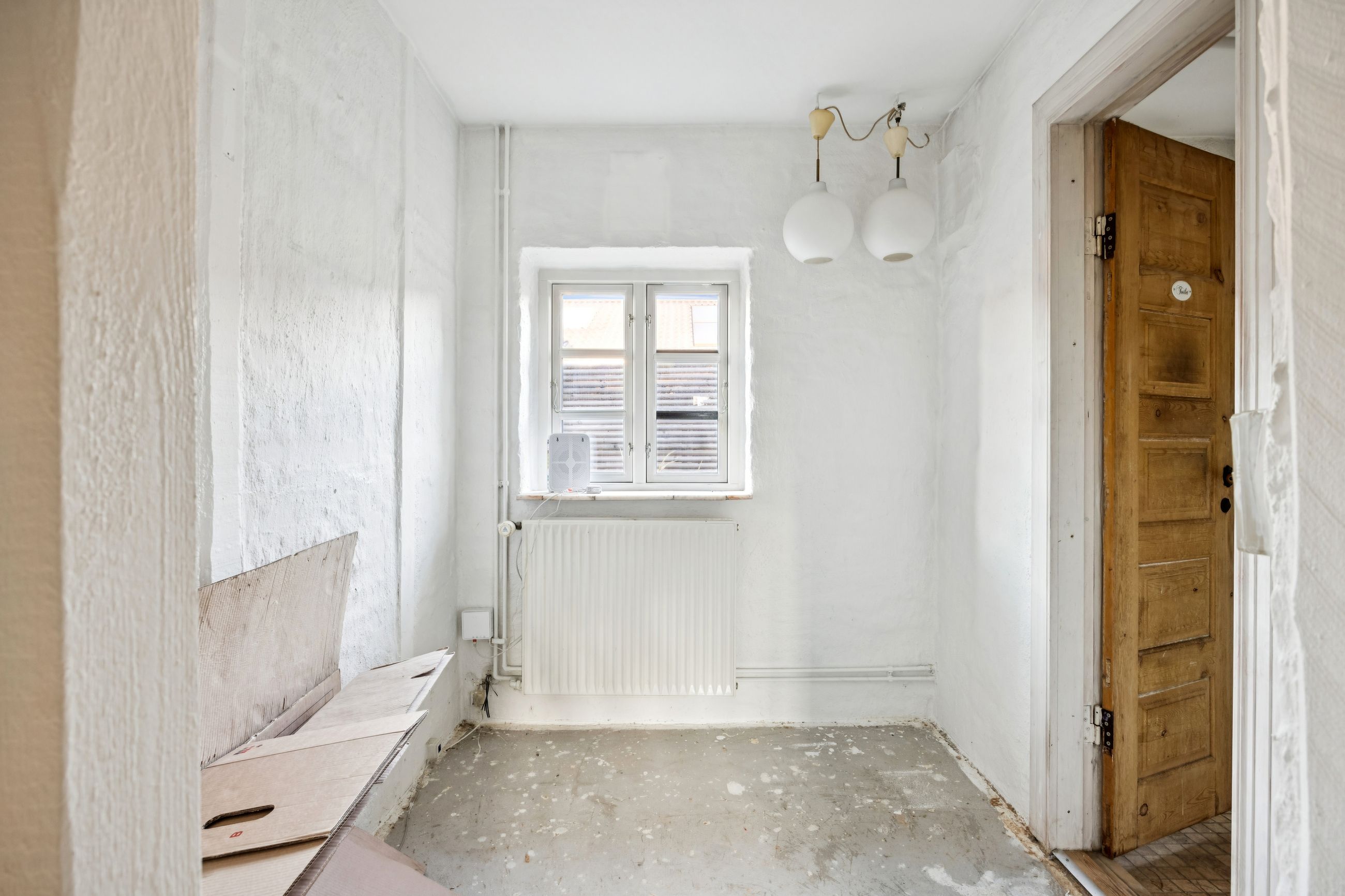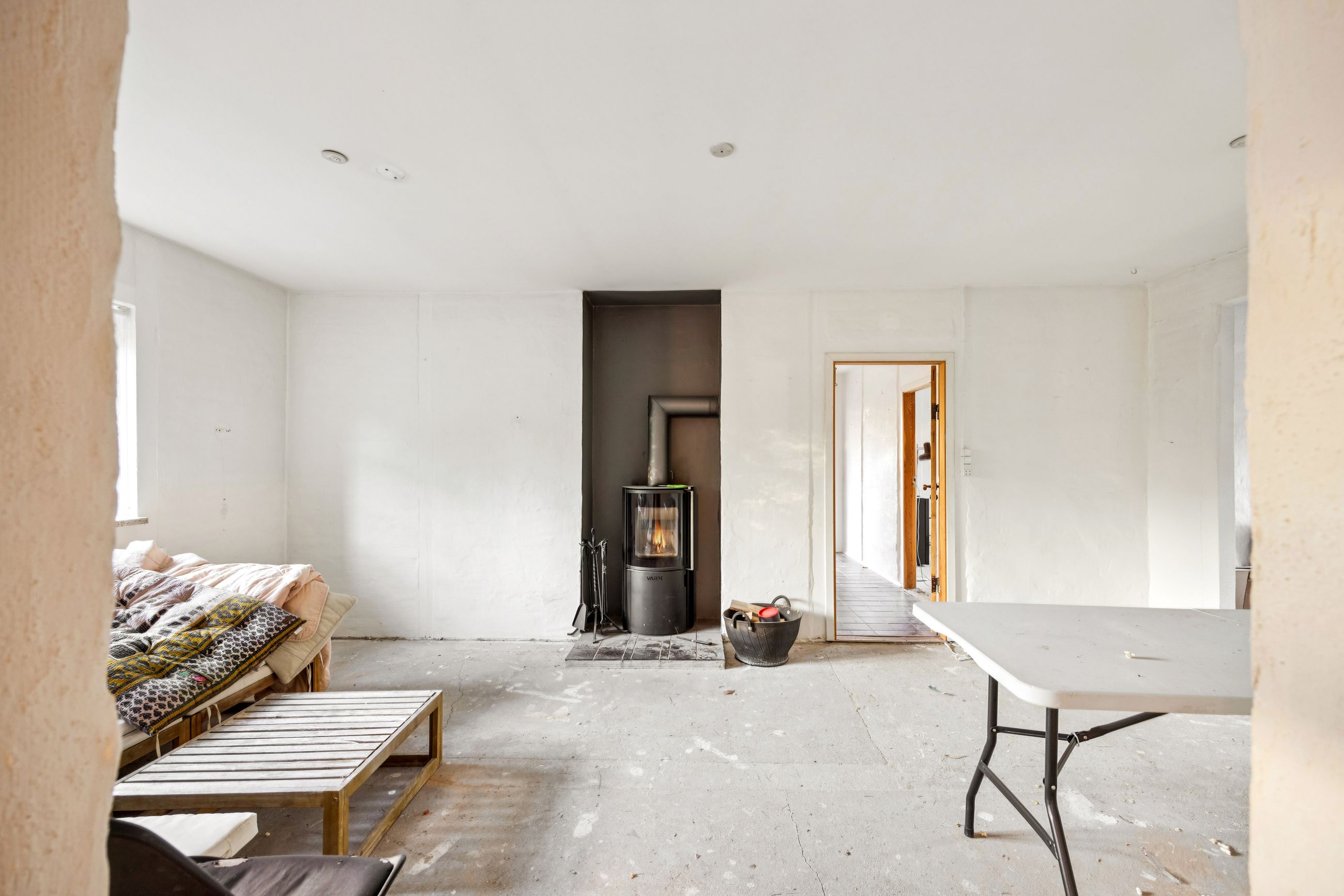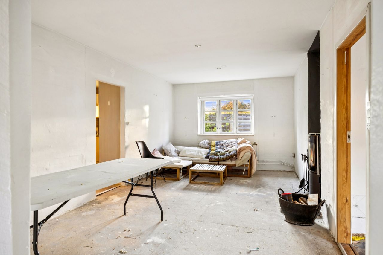 Indenfor finder du to gode soveværelser og en stor stue, der giver rigelig plads til både afslapning og underholdning. Køkkenet er indrettet med hvide elementer. Selvom huset står i delvist rå stand indvendigt, rummer det et enormt potentiale for den kreative køber, der ønsker at sætte sit eget præg på boligen.