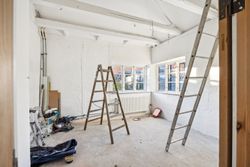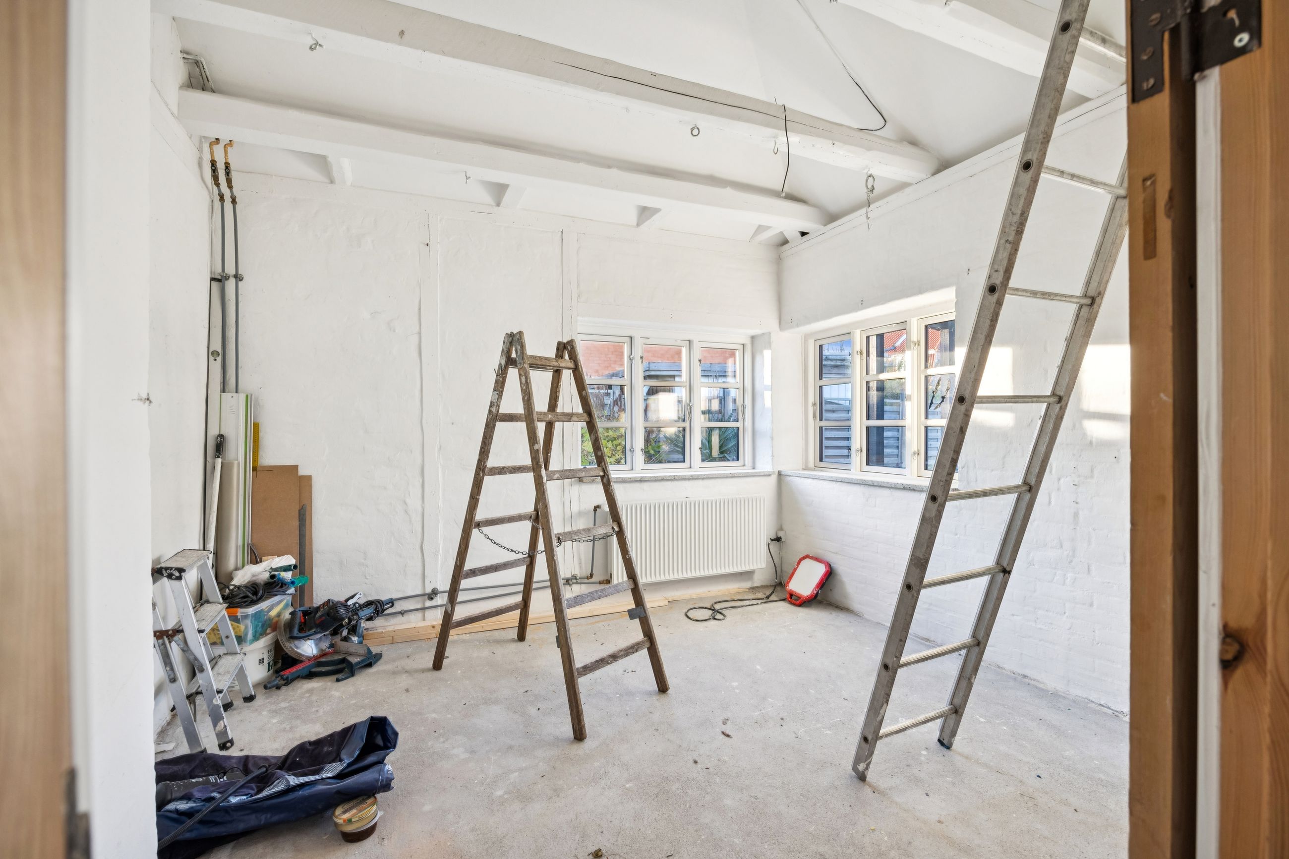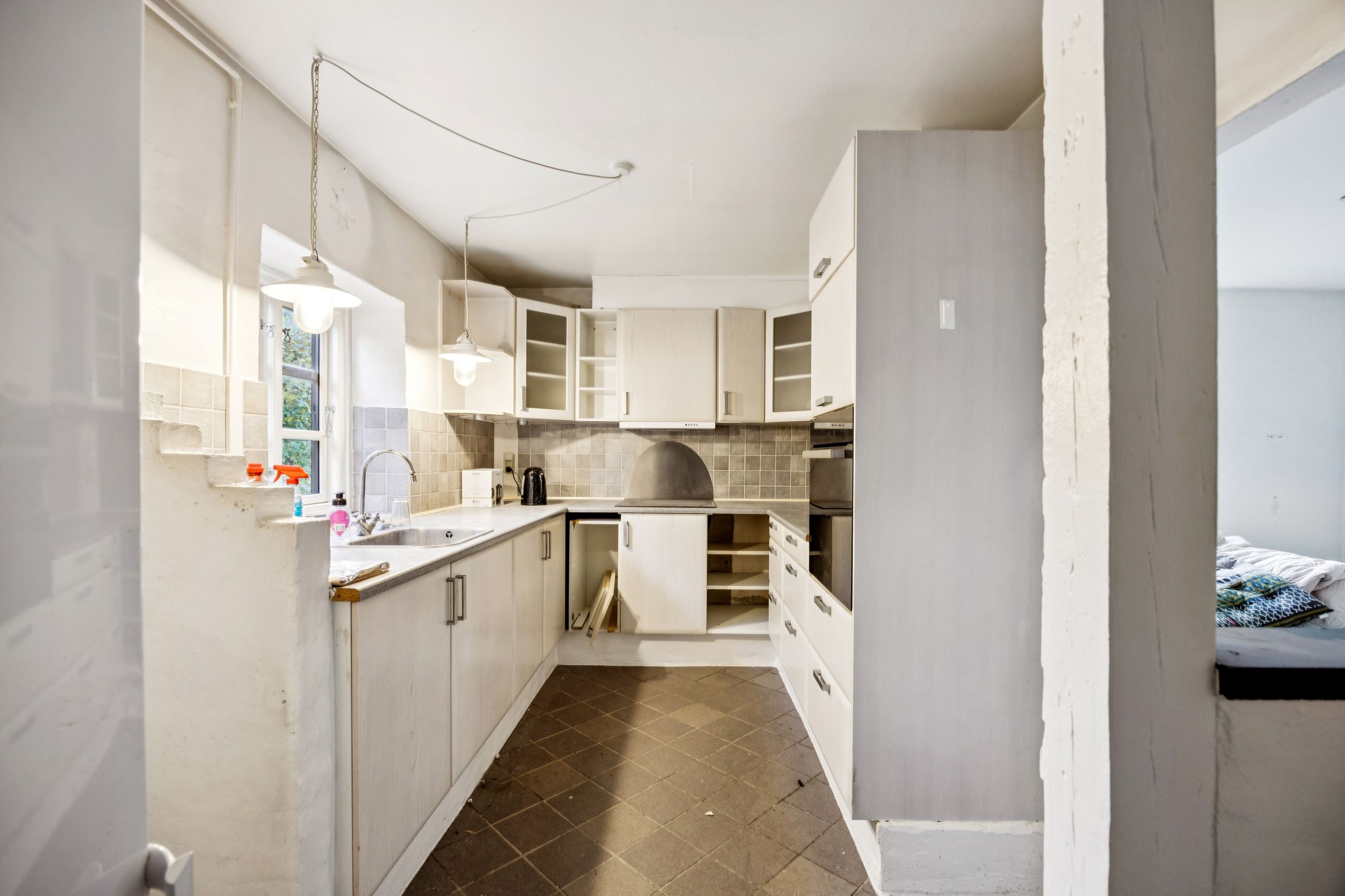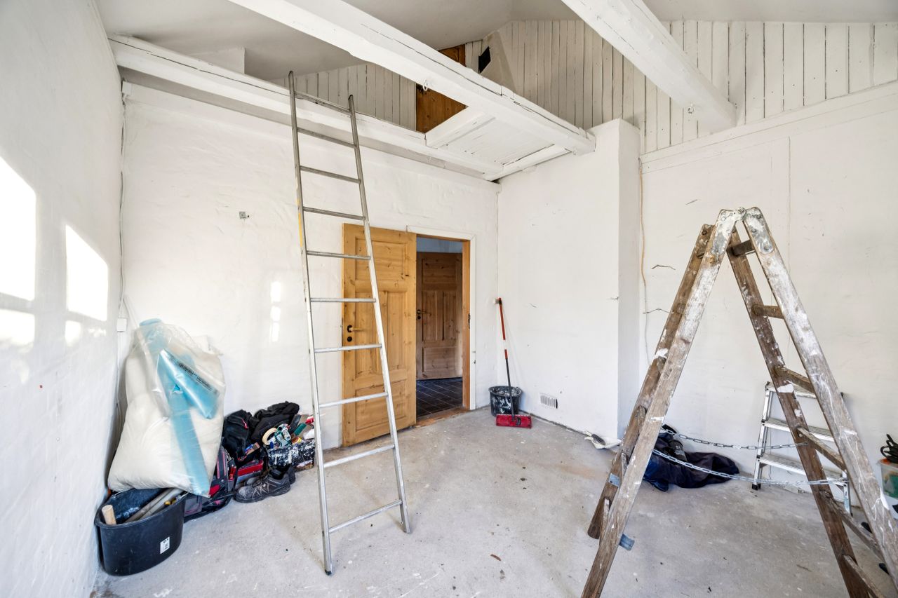 Indenfor finder du to gode soveværelser og en stor stue, der giver rigelig plads til både afslapning og underholdning. Køkkenet er indrettet med hvide elementer. Selvom huset står i delvist rå stand indvendigt, rummer det et enormt potentiale for den kreative køber, der ønsker at sætte sit eget præg på boligen.