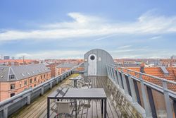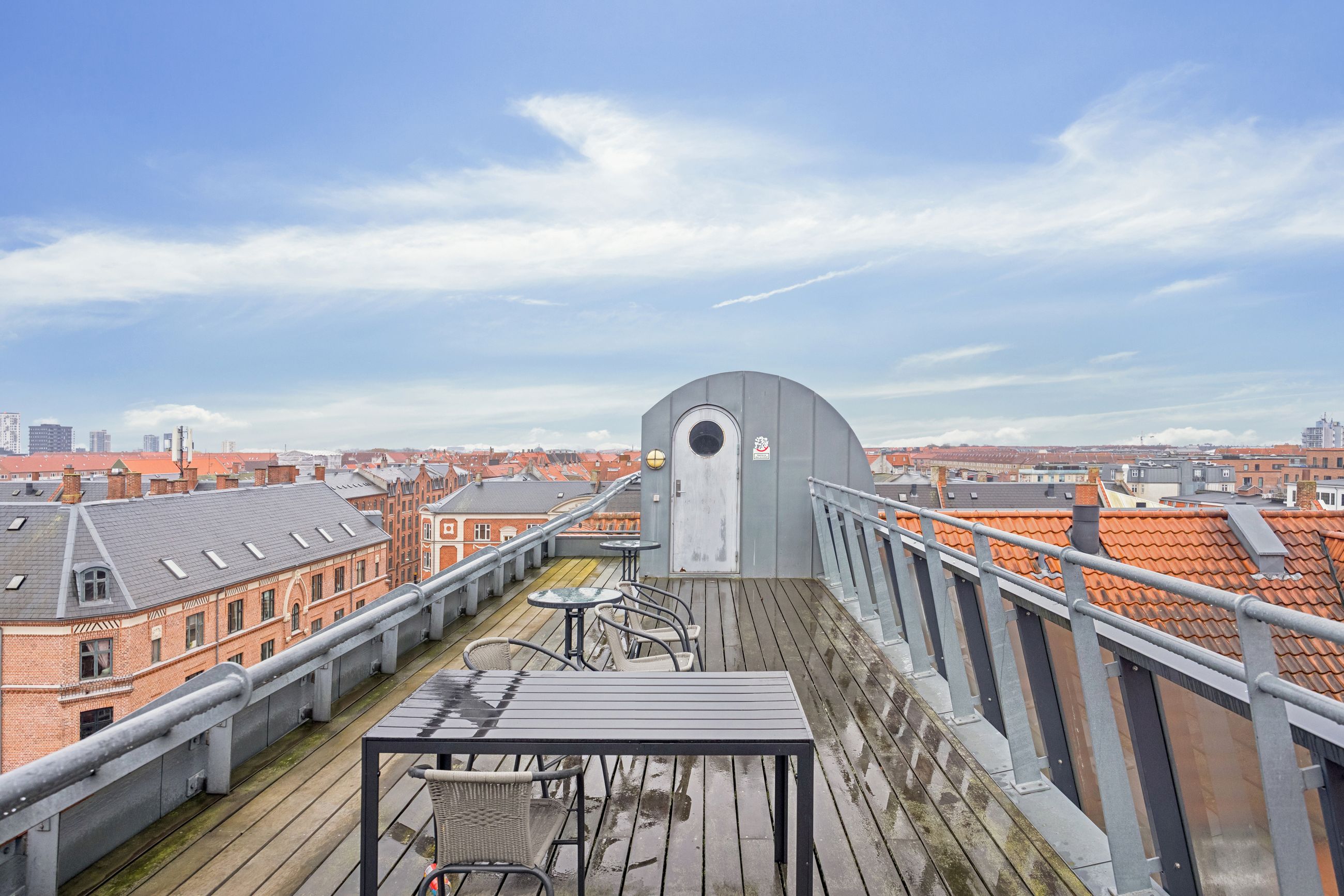 Lejligheden er en del af en veldrevet ejerforening med attraktive fællesfaciliteter. Den store fælles tagterrasse er et sandt fristed med imponerende udsigt over byens tage. Det perfekte sted at nyde aftensolen eller samle venner og familie. Til foreningen hører også et veludstyret festlokale med både køkken og toiletter, hvilket er oplagt til større sammenkomster.