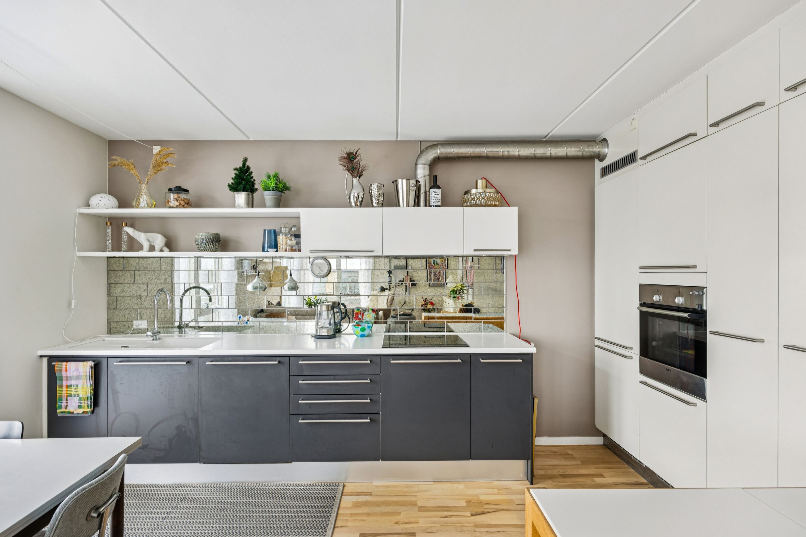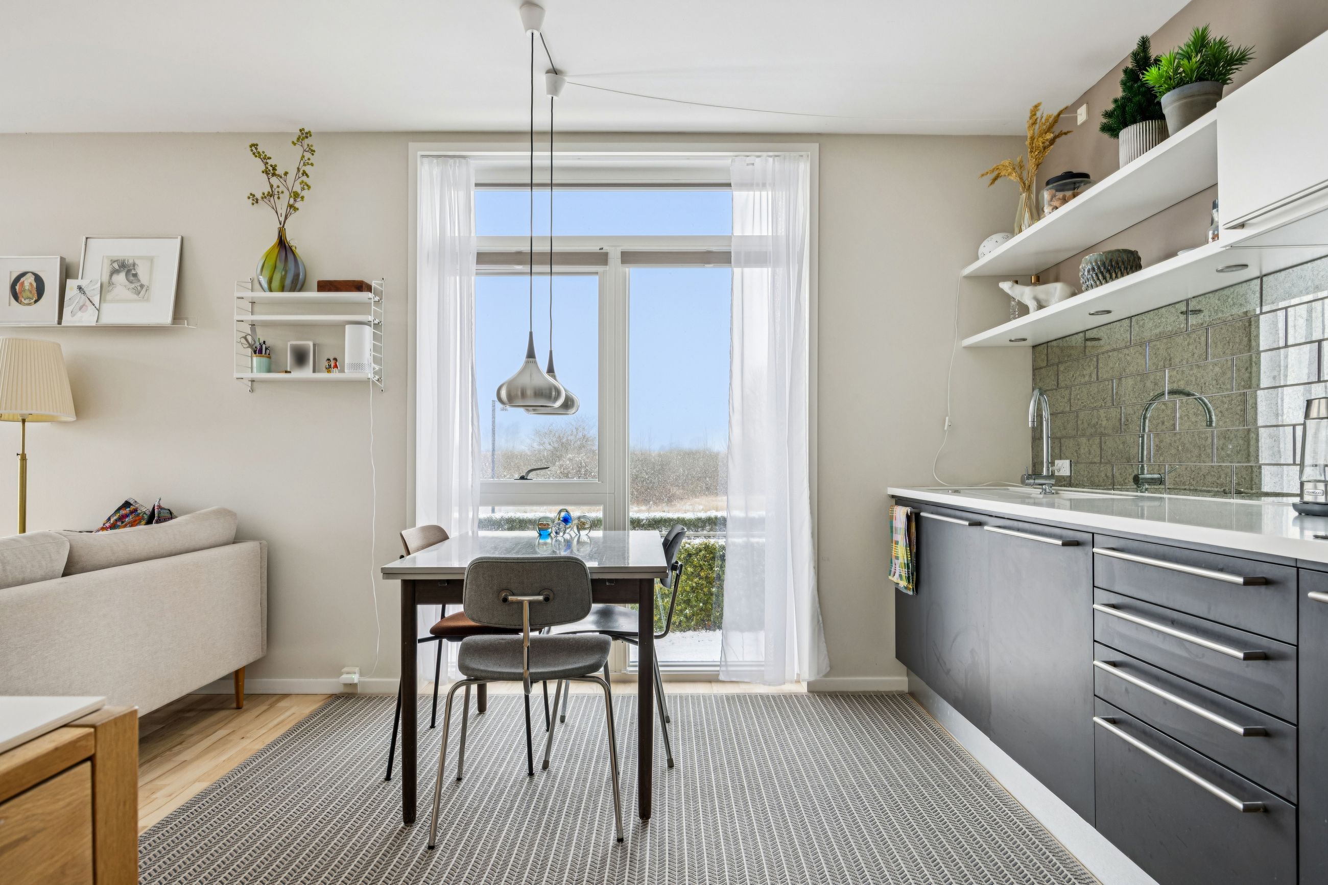 Boligens hjerte er den lyse opholdsstue med det åbne køkken og de store vinduer som byder dig ud til den fantastiske altan, der strækker sig rundt om hjørnet mod syd og vest, her har du både plads til grill, lounge og solbadning – plus en skøn udsigt over området og fælleden.