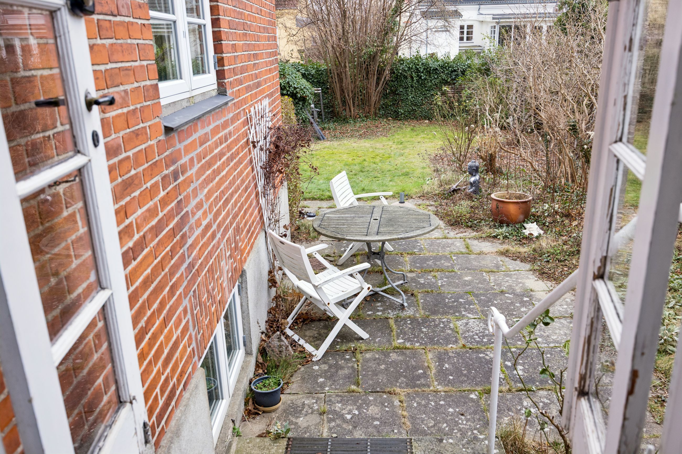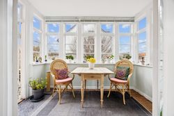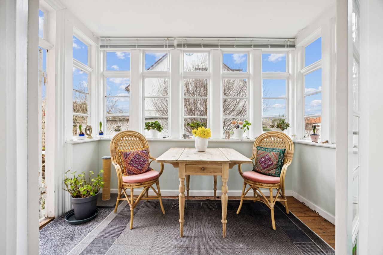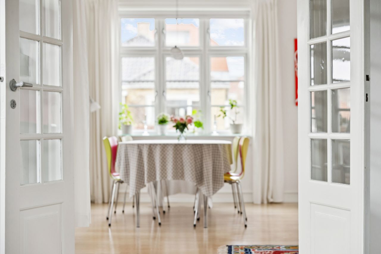 Her er utroligt meget opholdsareal, og mange, høje dannebrogsvinduer, der lader lyset stråle igennem på tværs af hele stueplan - en fantastisk oplevelse. Og lige som man tror, at det var det, kan du i direkte forlængelse af spisestuen træde ud i en intim udestue med direkte udgang til lejligheden egen have. Her er nemlig lavet en opdeling i ejendommen, så man har eksklusiv brugsret til egen have i vest.