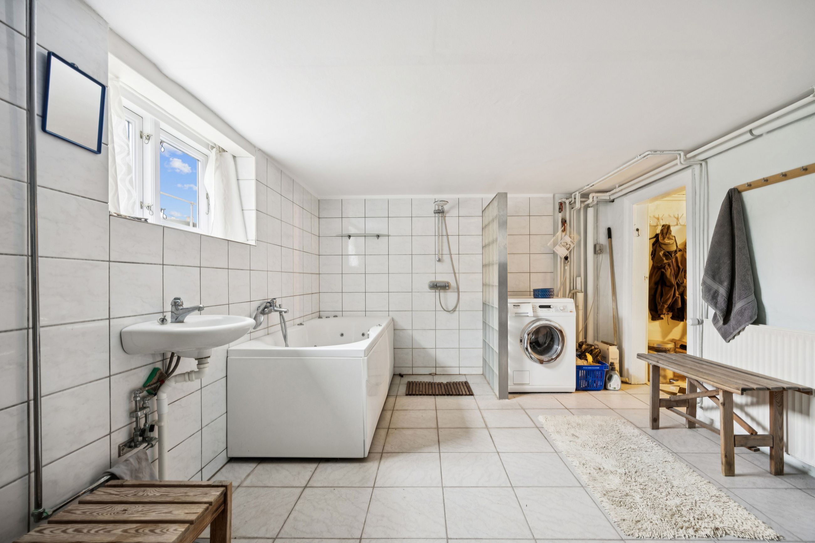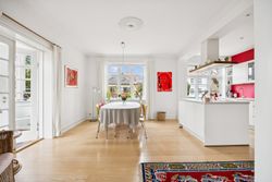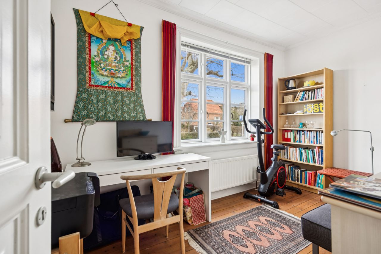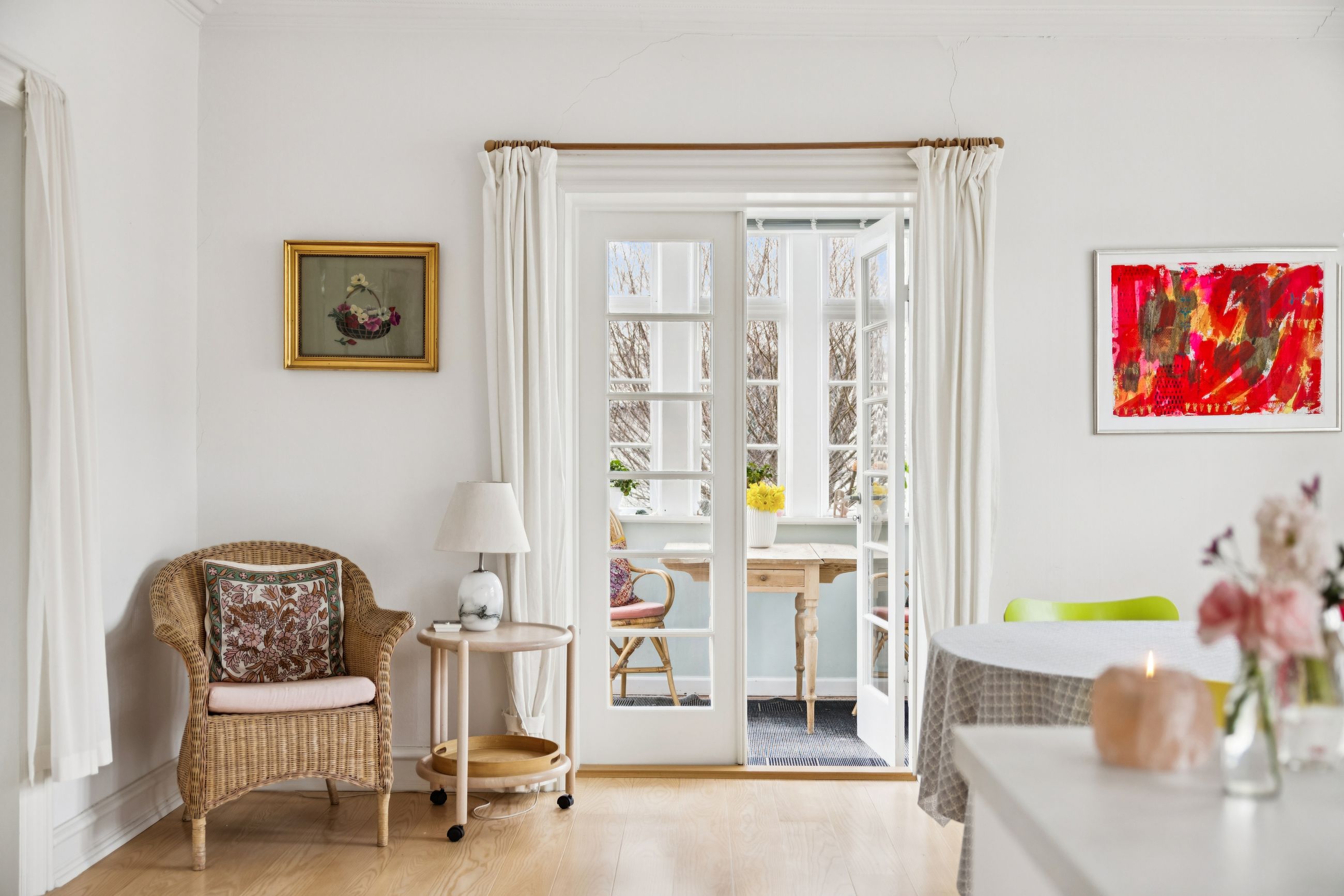 Her er utroligt meget opholdsareal, og mange, høje dannebrogsvinduer, der lader lyset stråle igennem på tværs af hele stueplan - en fantastisk oplevelse. Og lige som man tror, at det var det, kan du i direkte forlængelse af spisestuen træde ud i en intim udestue med direkte udgang til lejligheden egen have. Her er nemlig lavet en opdeling i ejendommen, så man har eksklusiv brugsret til egen have i vest.