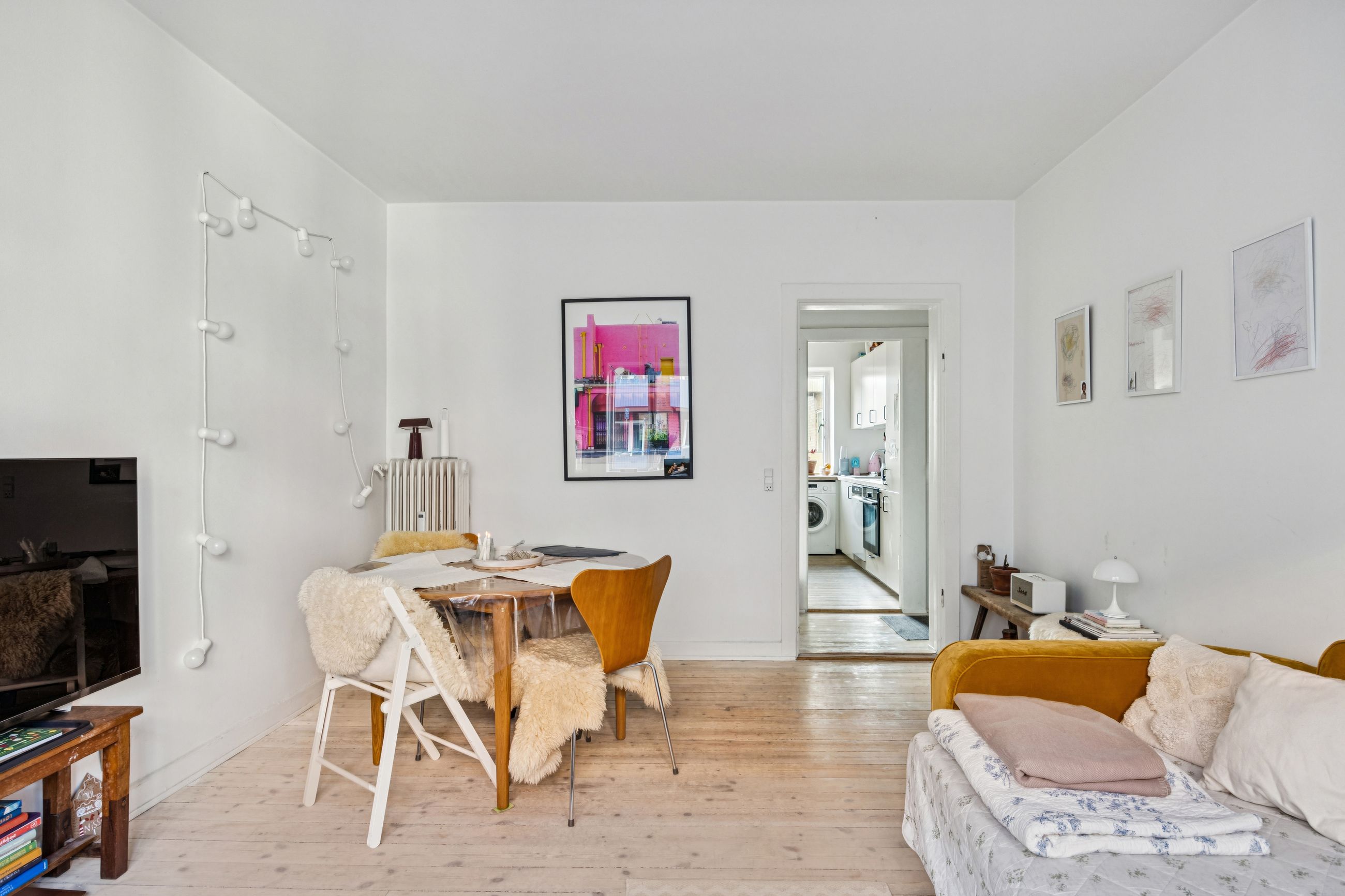 Lejligheden rummer en lys og rummelig stue med et behageligt lysindfald samt god plads til både sofaarrangement og spiseafdeling – ideelle rammer for både hverdag og gæster.